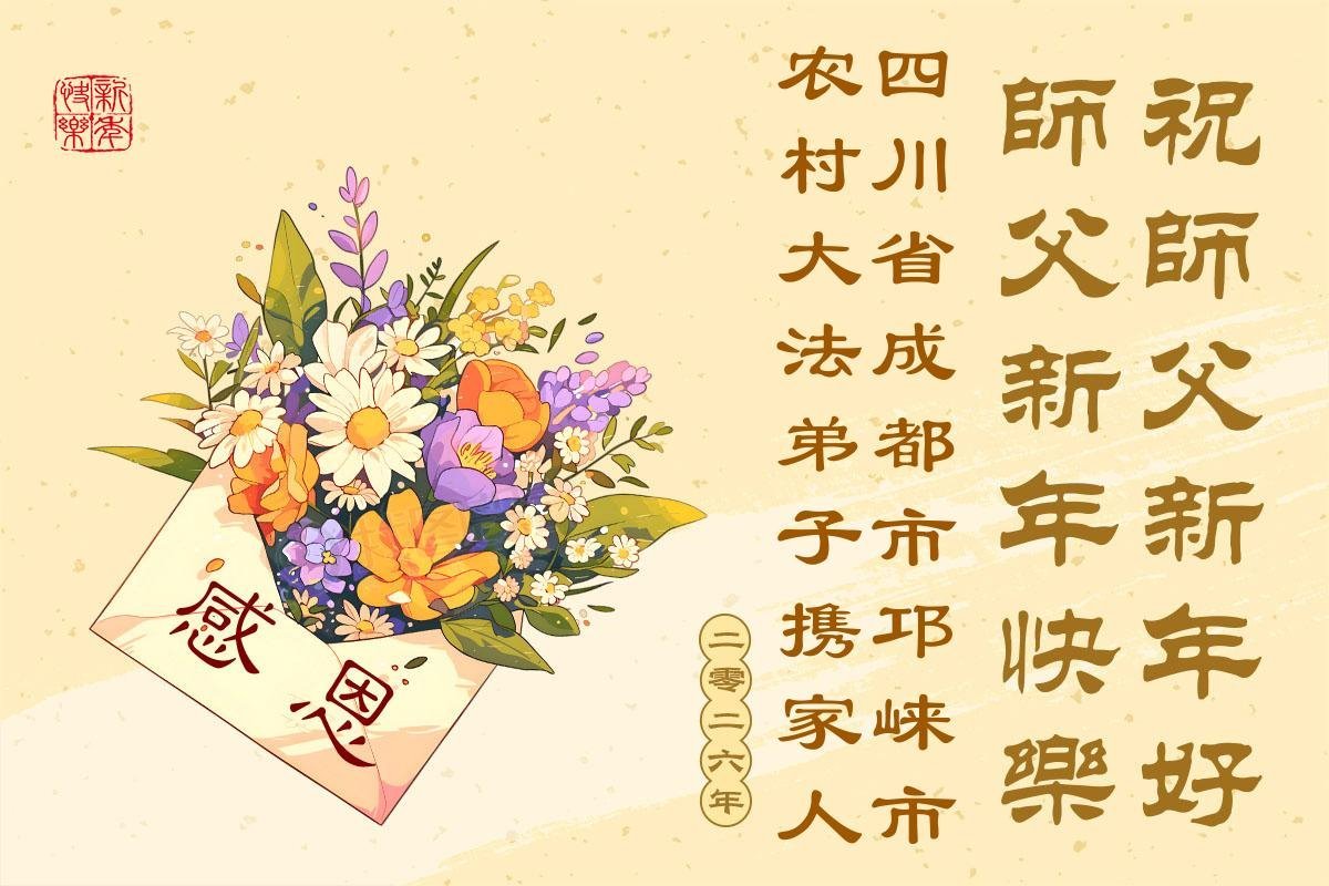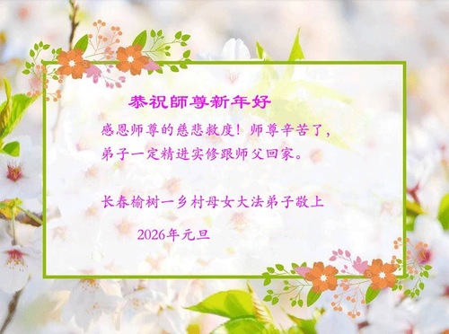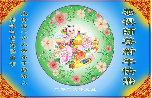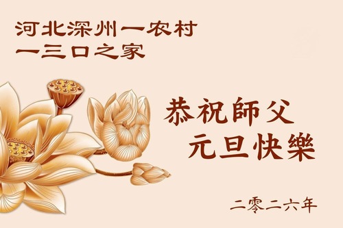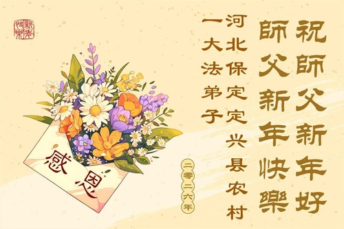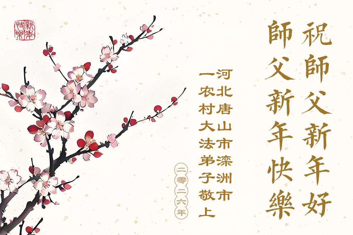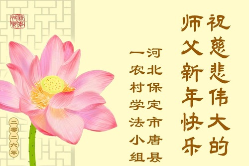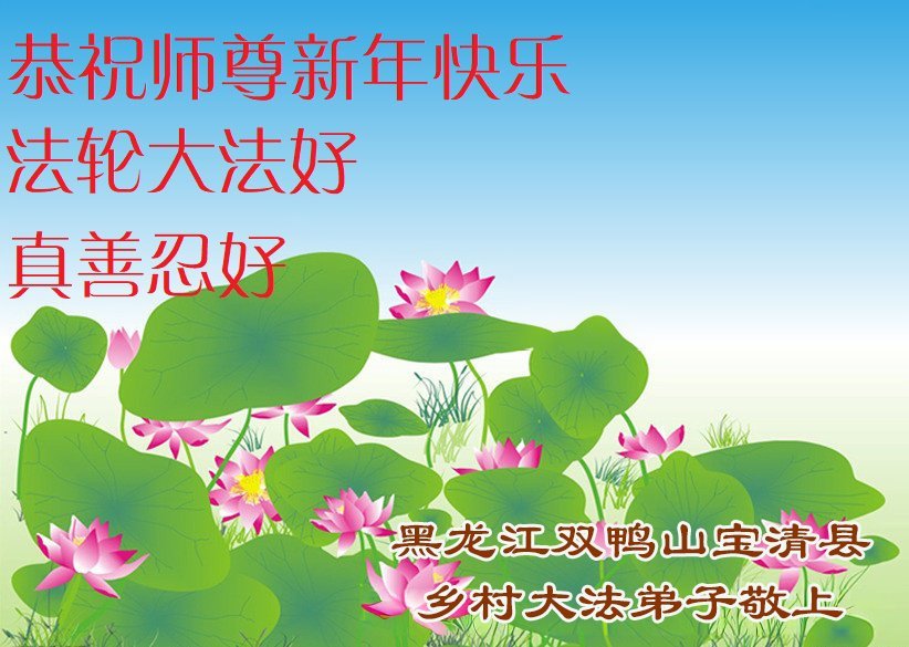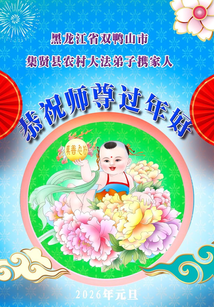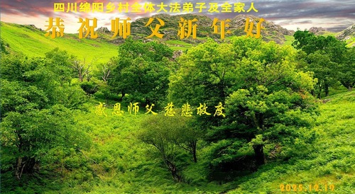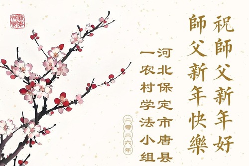 (Minghui.org) Zu Neujahr senden Falun-Dafa-Praktizierende auf der ganzen Welt traditionell Neujahrsgrüße, Grußkarten, Gedichte und Fotos an die Minghui-Website. Damit wünschen sie ihrem verehrten Meister Li Hongzhi ein frohes neues Jahr und bringen dem Meister ihre Dankbarkeit für die barmherzige Errettung zum Ausdruck. Sie geloben, in ihrer Kultivierung fleißig voranzukommen und noch mehr Lebewesen zu erretten. Im Folgenden veröffentlichen wir einen Teil dieser Grüße aus ländlichen Gebieten Chinas: