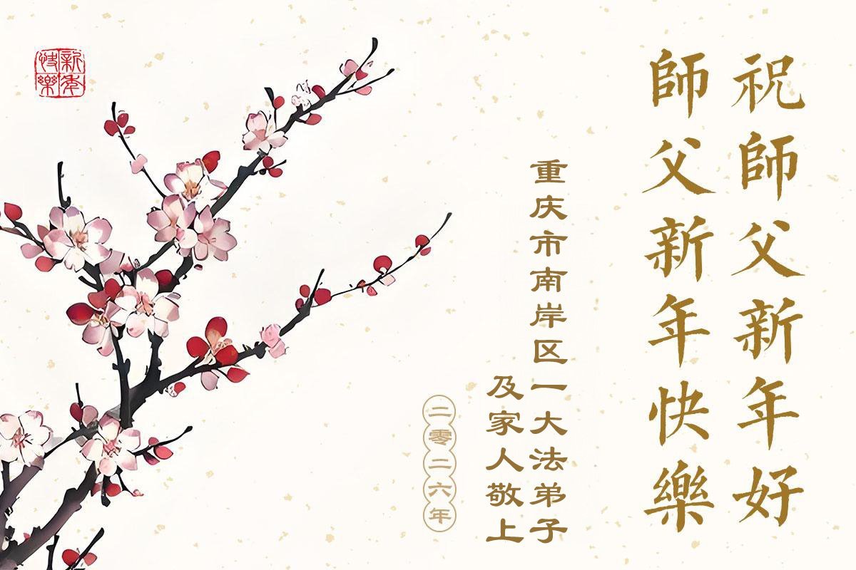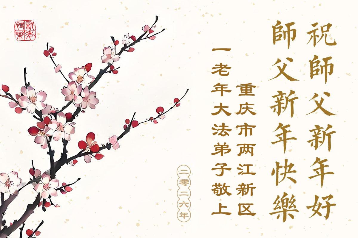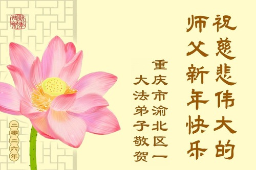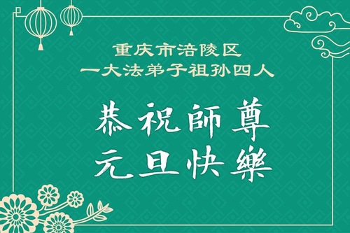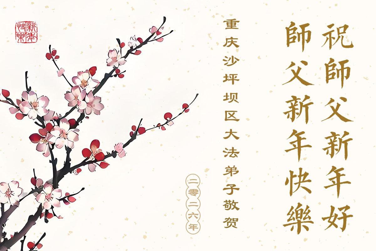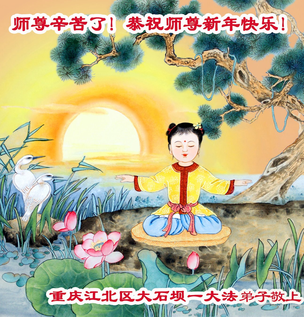(Minghui.org) Zu Neujahr senden Falun-Dafa-Praktizierende auf der ganzen Welt traditionell Neujahrsgrüße, Grußkarten, Gedichte und Fotos an die Minghui-Website. Damit wünschen sie ihrem verehrten Meister Li Hongzhi ein frohes neues Jahr und bringen dem Meister ihre Dankbarkeit für die barmherzige Errettung zum Ausdruck. Sie geloben, in ihrer Kultivierung fleißig voranzukommen und noch mehr Lebewesen zu erretten. Im Folgenden veröffentlichen wir einen Teil dieser Grüße aus Chongqing: