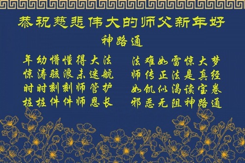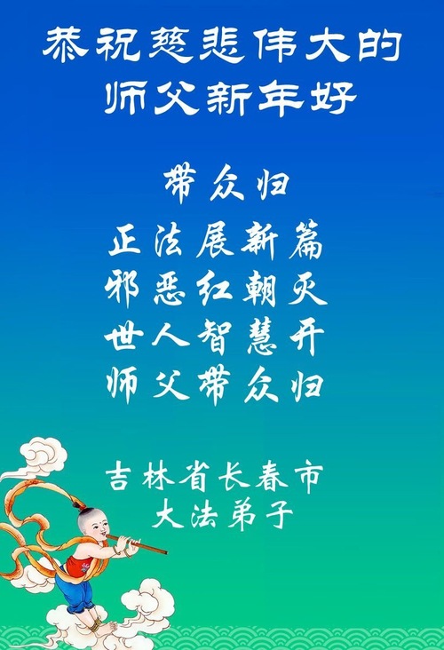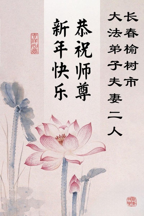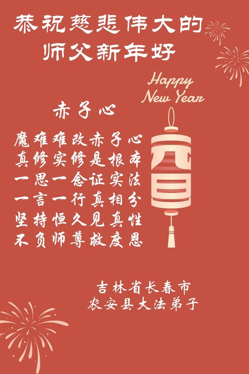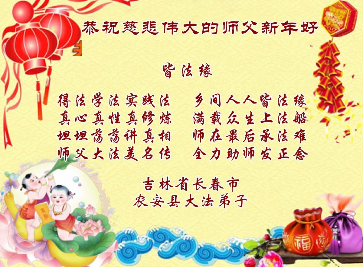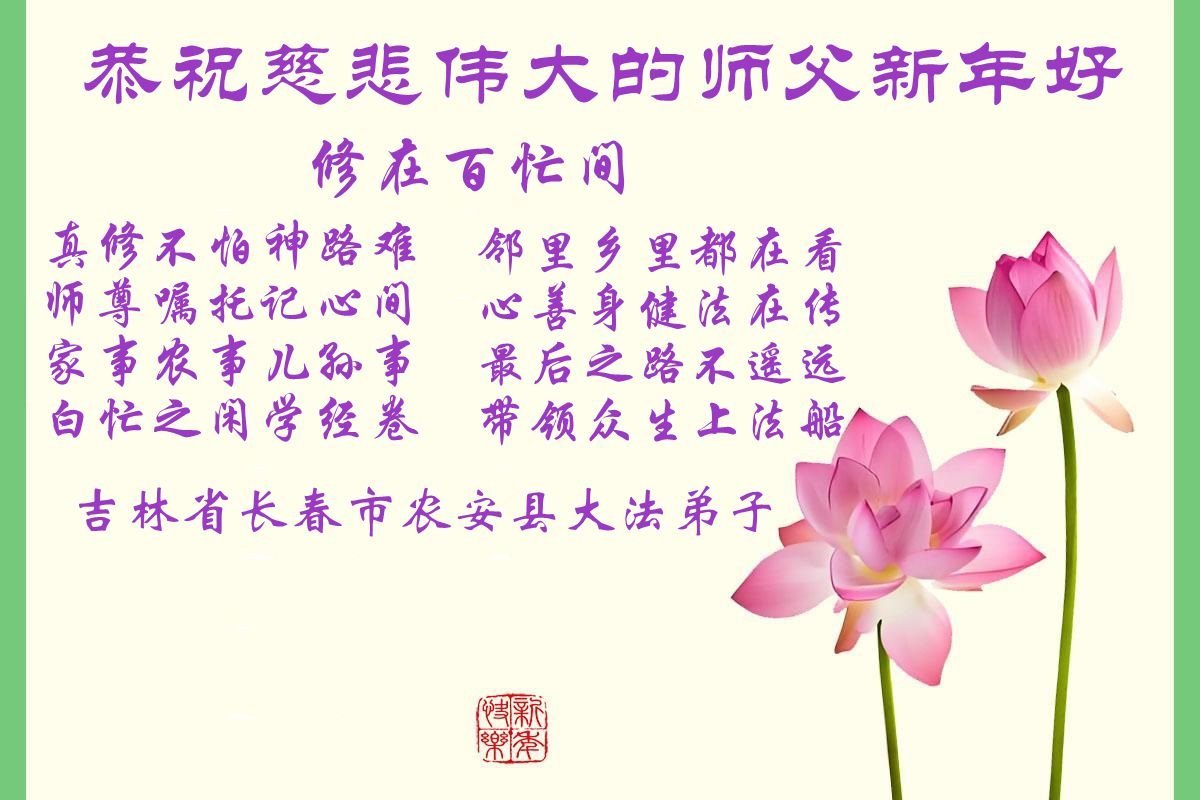 (Minghui.org) Zu Neujahr senden Falun-Dafa-Praktizierende auf der ganzen Welt traditionell Neujahrsgrüße, Grußkarten, Gedichte und Fotos an die Minghui-Website. Damit wünschen sie ihrem verehrten Meister Li Hongzhi ein frohes neues Jahr und bringen dem Meister ihre Dankbarkeit für die barmherzige Errettung zum Ausdruck. Sie geloben, in ihrer Kultivierung fleißig voranzukommen und noch mehr Lebewesen zu erretten. Im Folgenden veröffentlichen wir einen Teil dieser Grüße aus Changchun: