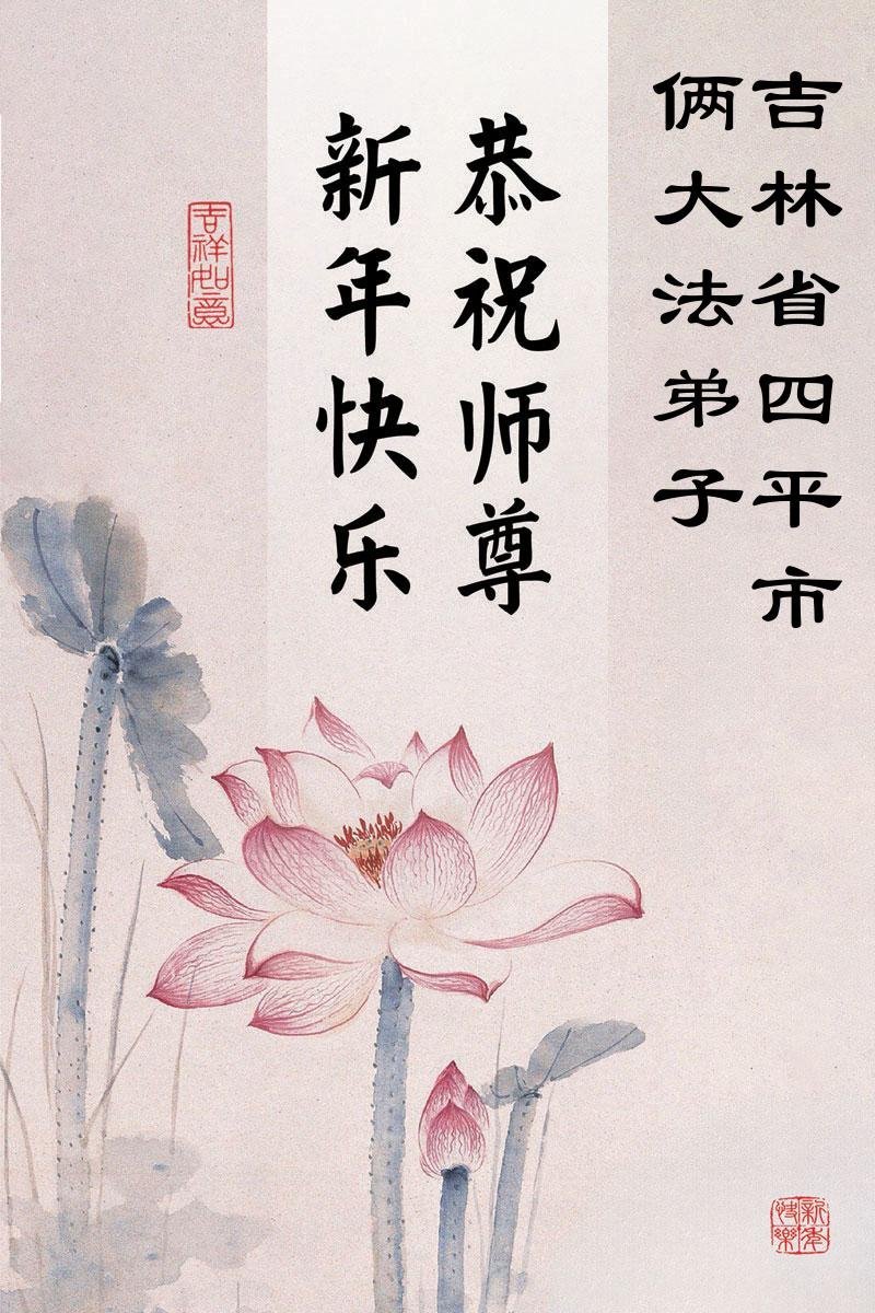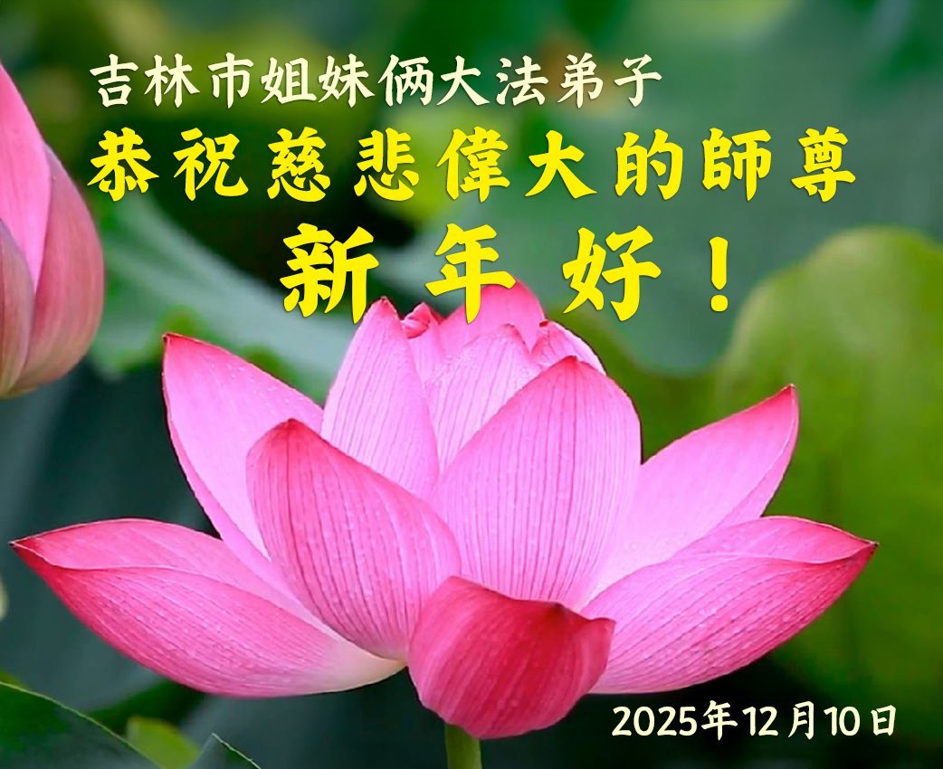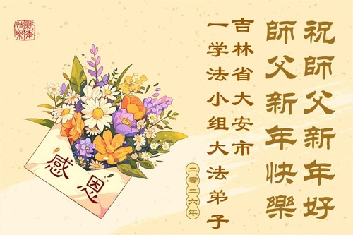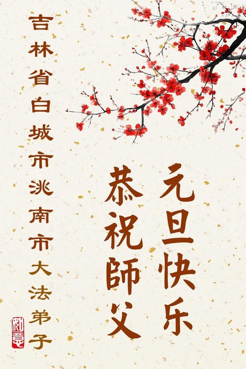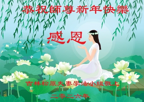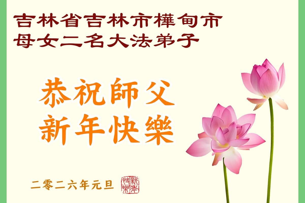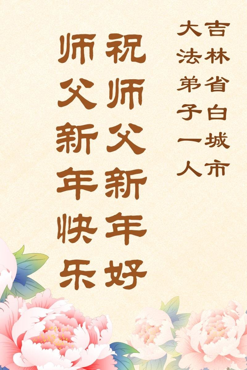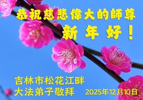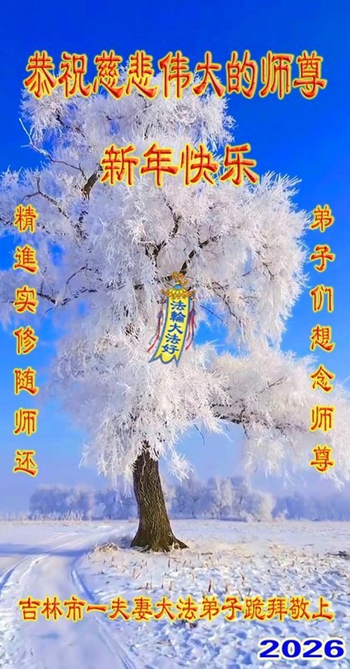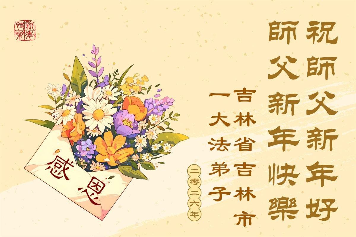 (Minghui.org) Zu Neujahr senden Falun-Dafa-Praktizierende auf der ganzen Welt traditionell Neujahrsgrüße, Grußkarten, Gedichte und Fotos an die Minghui-Website. Damit wünschen sie ihrem verehrten Meister Li Hongzhi ein frohes neues Jahr und bringen dem Meister ihre Dankbarkeit für die barmherzige Errettung zum Ausdruck. Sie geloben, in ihrer Kultivierung fleißig voranzukommen und noch mehr Lebewesen zu erretten. Im Folgenden veröffentlichen wir einen Teil dieser Grüße aus Jilin: