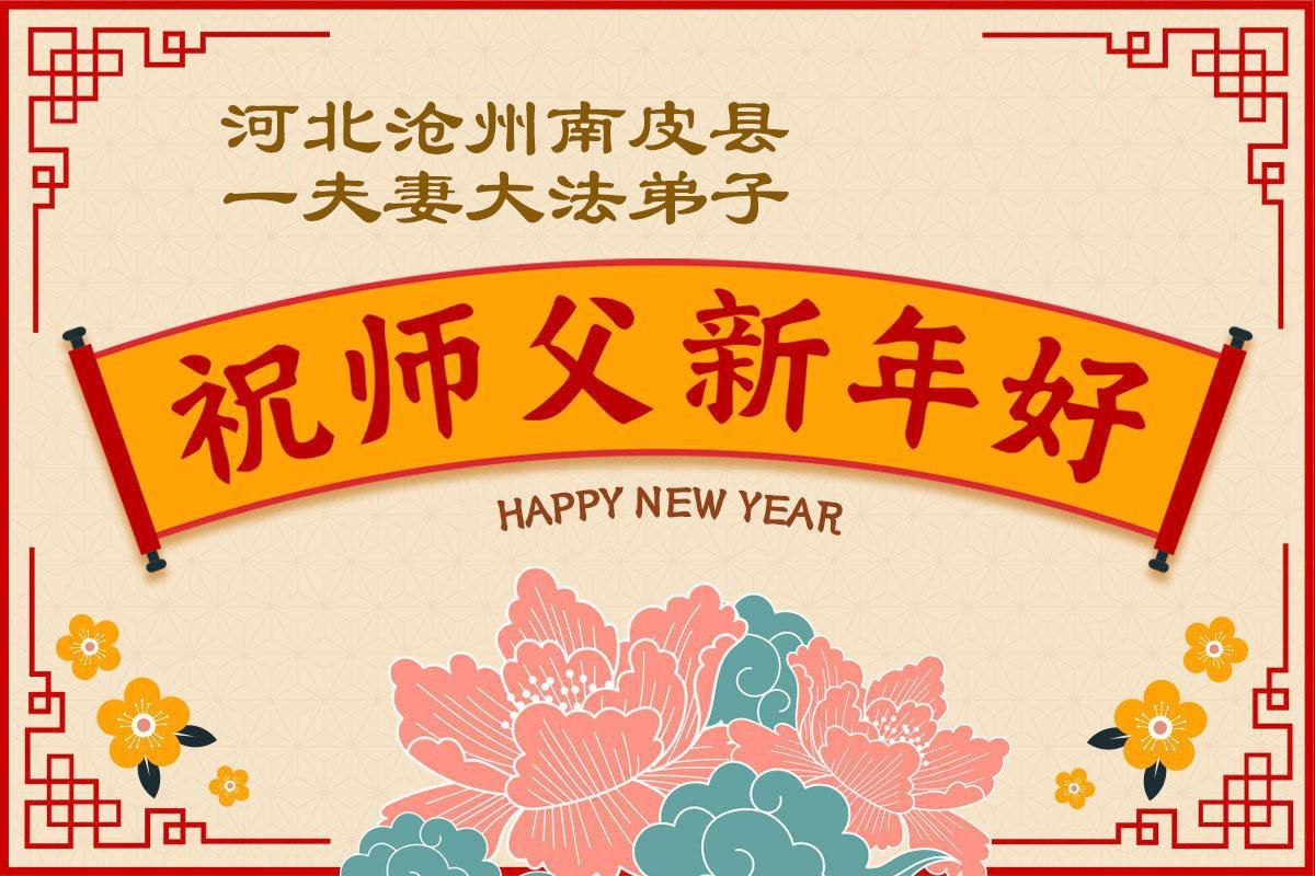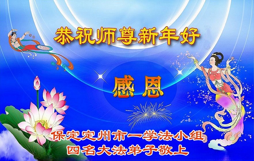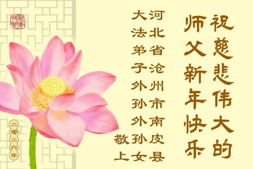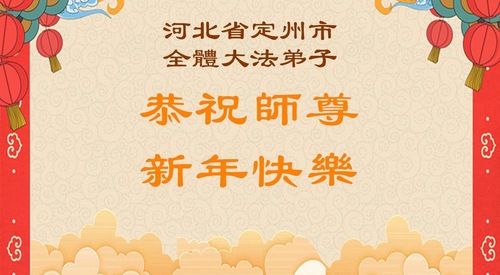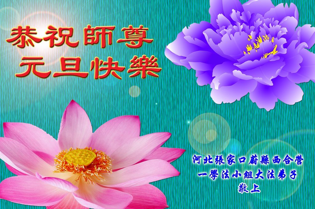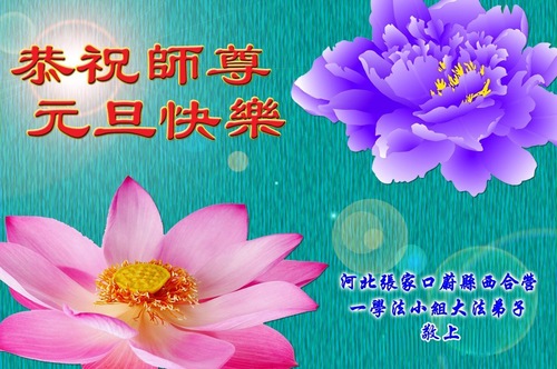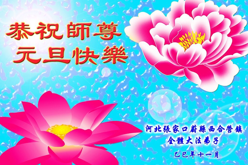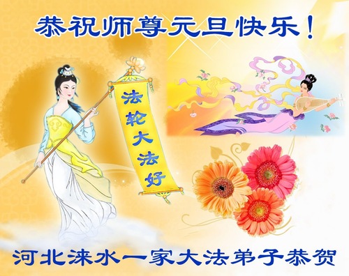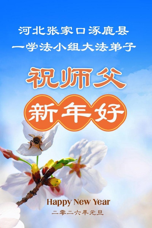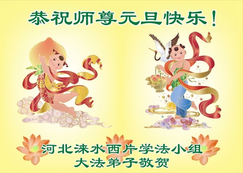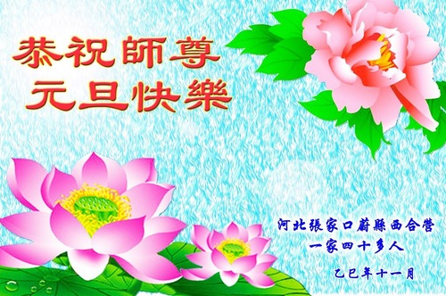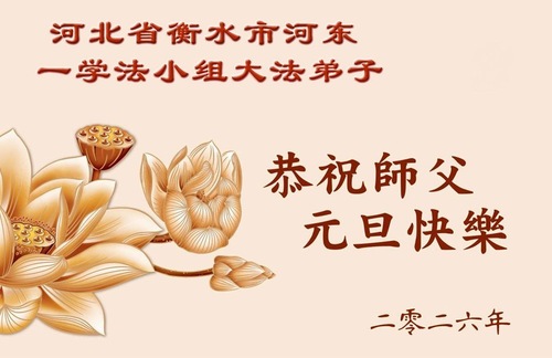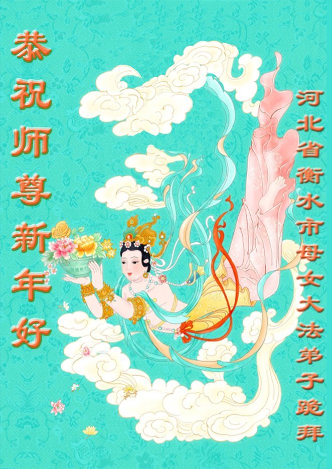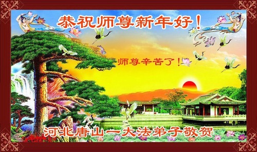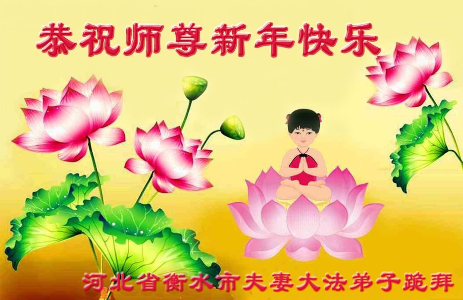 (Minghui.org) Zu Neujahr senden Falun-Dafa-Praktizierende auf der ganzen Welt traditionell Neujahrsgrüße, Grußkarten, Gedichte und Fotos an die Minghui-Website. Damit wünschen sie ihrem verehrten Meister Li Hongzhi ein frohes neues Jahr und bringen dem Meister ihre Dankbarkeit für die barmherzige Errettung zum Ausdruck. Sie geloben, in ihrer Kultivierung fleißig voranzukommen und noch mehr Lebewesen zu erretten. Im Folgenden veröffentlichen wir einen Teil dieser Grüße aus Hebei: