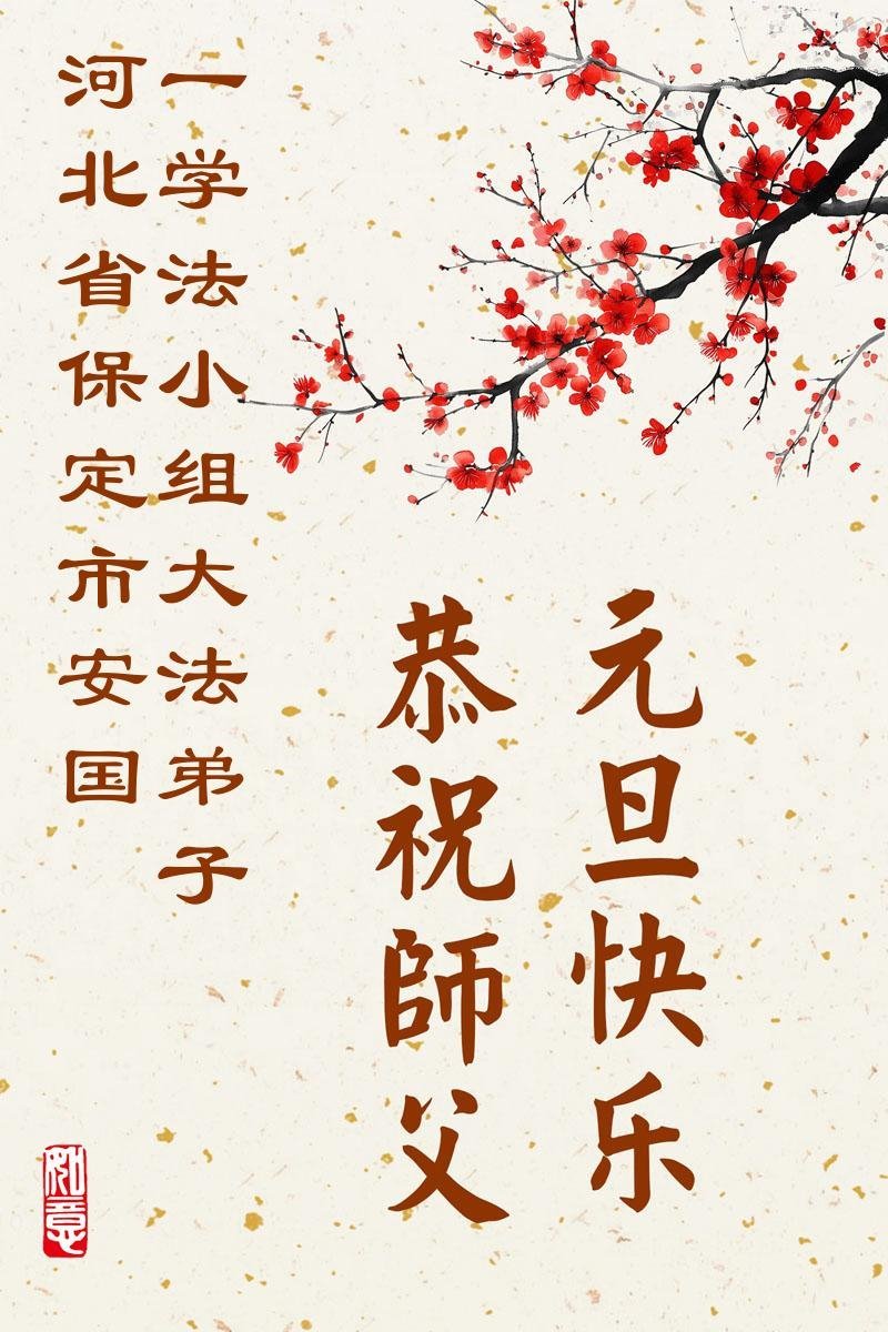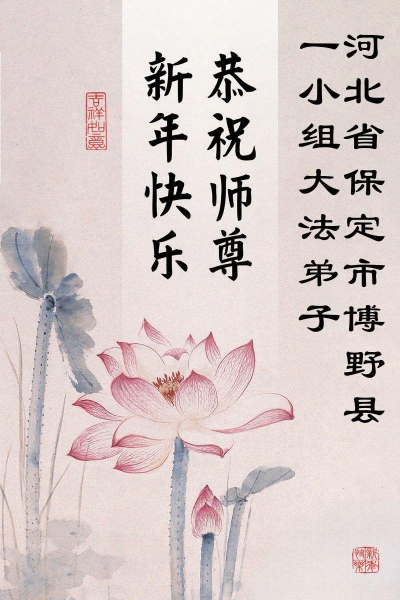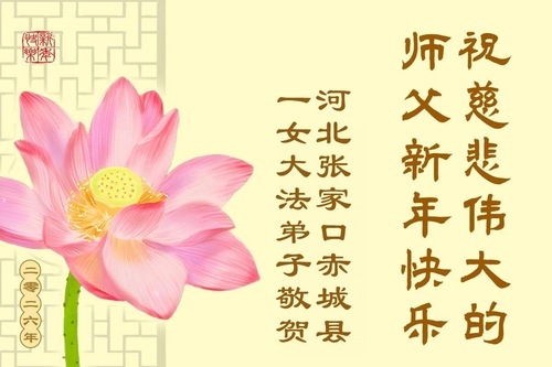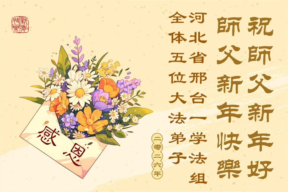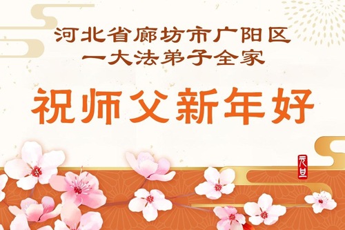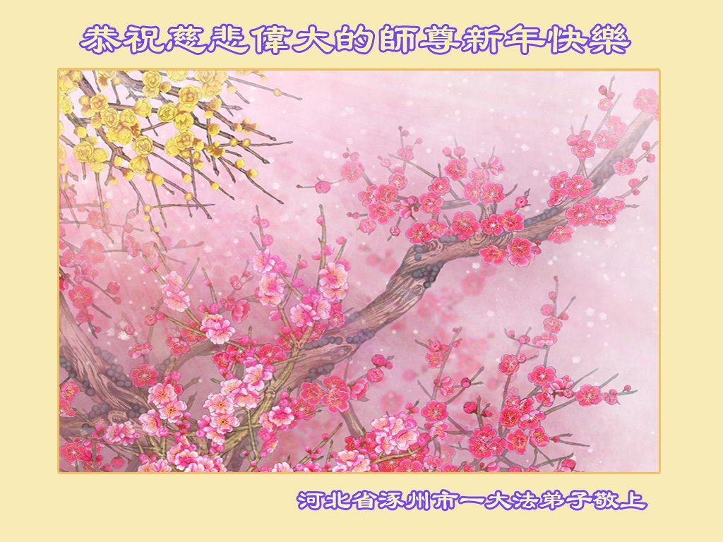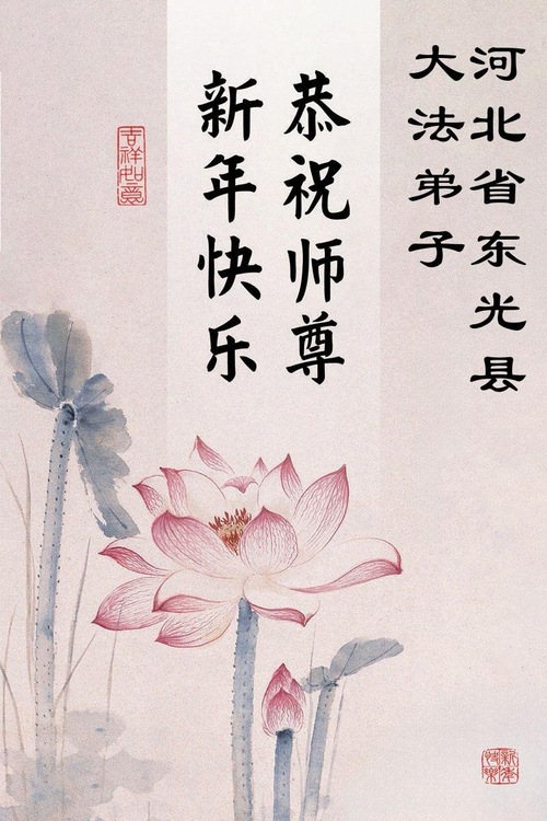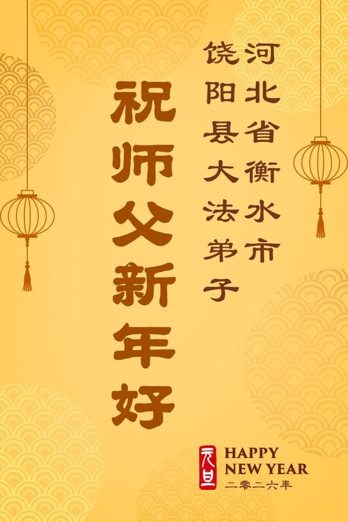 (Minghui.org) Zu Neujahr senden Falun-Dafa-Praktizierende auf der ganzen Welt traditionell Neujahrsgrüße, Grußkarten, Gedichte und Fotos an die Minghui-Website. Damit wünschen sie ihrem verehrten Meister Li Hongzhi ein frohes neues Jahr und bringen dem Meister ihre Dankbarkeit für die barmherzige Errettung zum Ausdruck. Sie geloben, in ihrer Kultivierung fleißig voranzukommen und noch mehr Lebewesen zu erretten. Im Folgenden veröffentlichen wir einen Teil dieser Grüße aus Hebei: