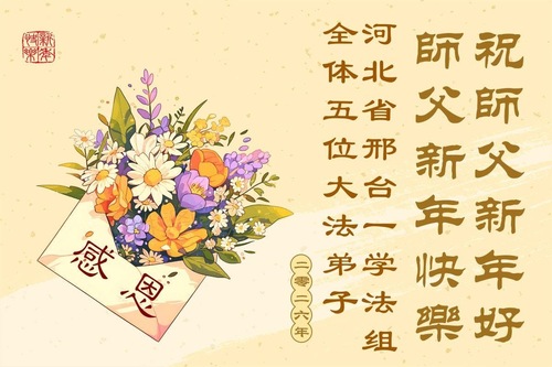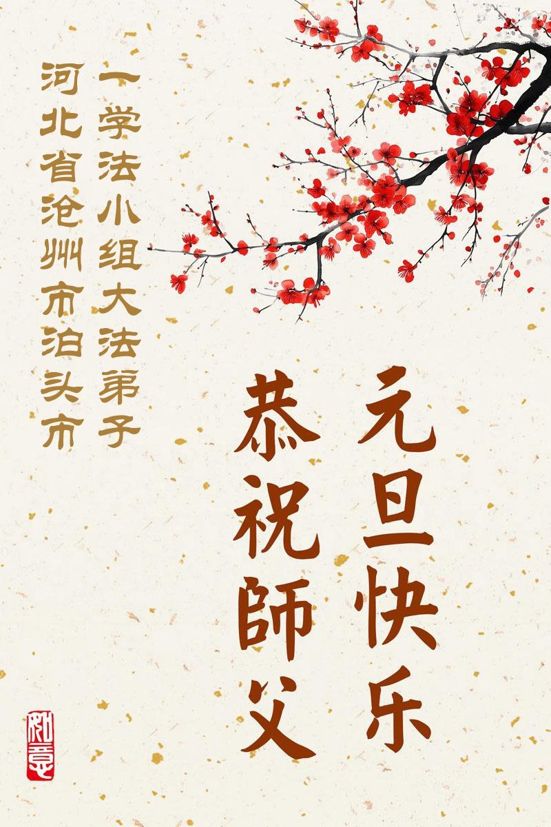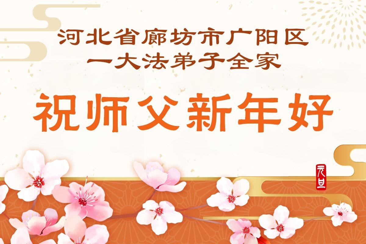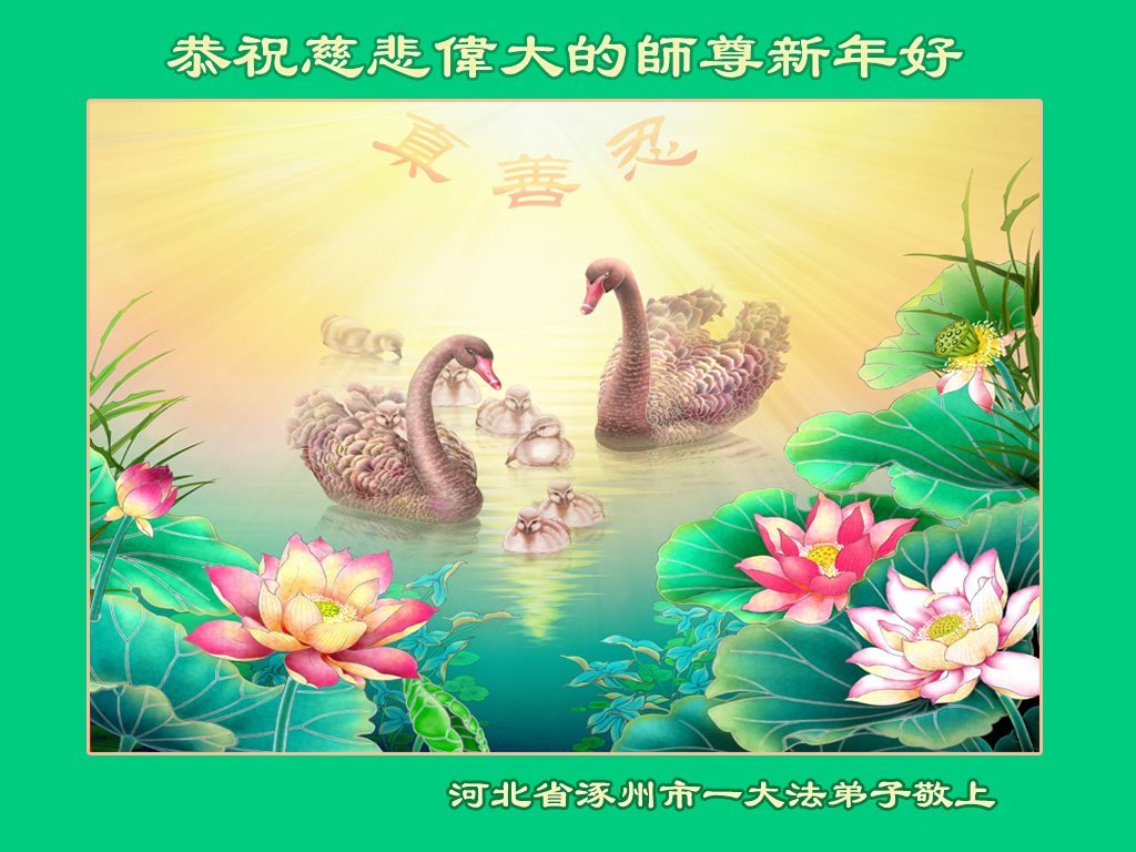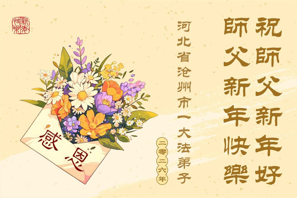 (Minghui.org) Zu Neujahr senden Falun-Dafa-Praktizierende auf der ganzen Welt traditionell Neujahrsgrüße, Grußkarten, Gedichte und Fotos an die Minghui-Website. Damit wünschen sie ihrem verehrten Meister Li Hongzhi ein frohes neues Jahr und bringen dem Meister ihre Dankbarkeit für die barmherzige Errettung zum Ausdruck. Sie geloben, in ihrer Kultivierung fleißig voranzukommen und noch mehr Lebewesen zu erretten. Im Folgenden veröffentlichen wir einen Teil dieser Grüße aus Hebei: