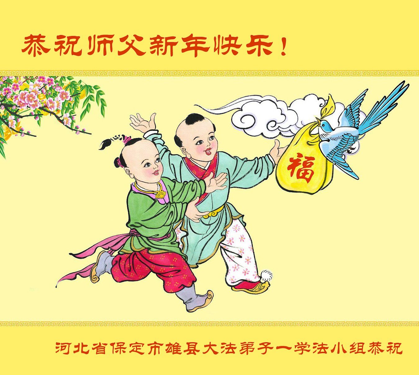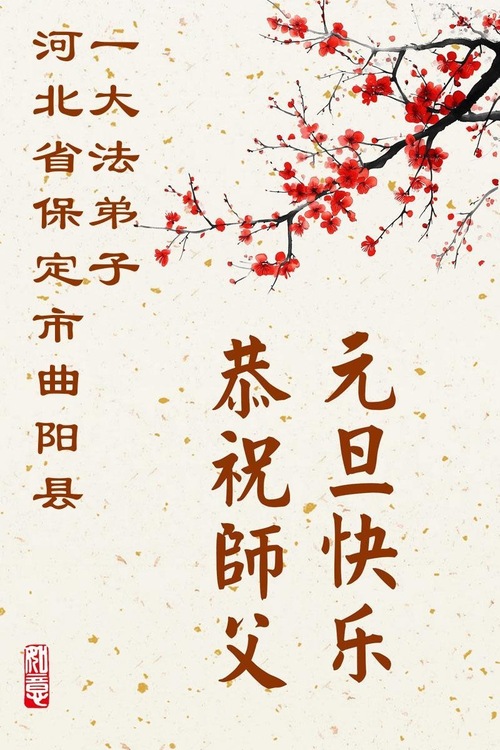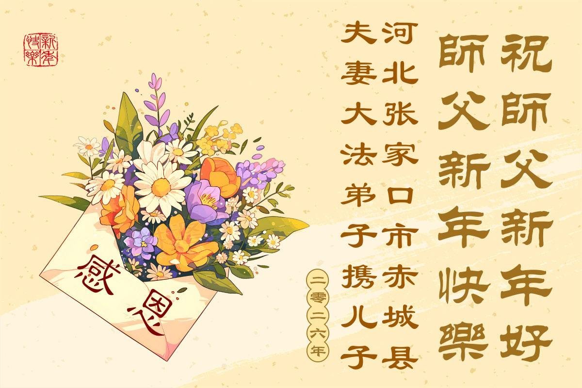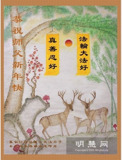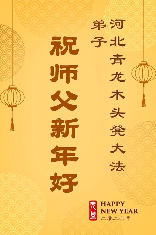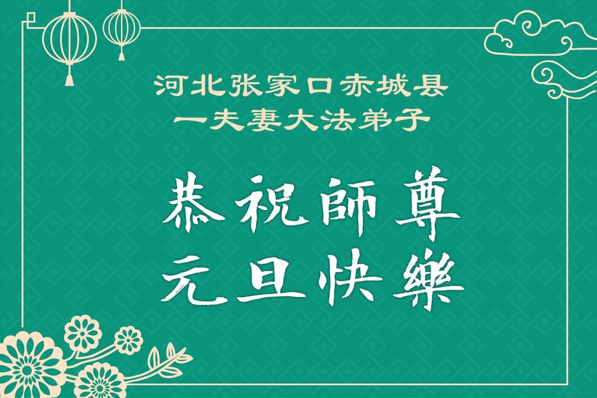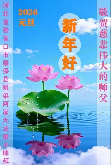 (Minghui.org) Zu Neujahr senden Falun-Dafa-Praktizierende auf der ganzen Welt traditionell Neujahrsgrüße, Grußkarten, Gedichte und Fotos an die Minghui-Website. Damit wünschen sie ihrem verehrten Meister Li Hongzhi ein frohes neues Jahr und bringen dem Meister ihre Dankbarkeit für die barmherzige Errettung zum Ausdruck. Sie geloben, in ihrer Kultivierung fleißig voranzukommen und noch mehr Lebewesen zu erretten. Im Folgenden veröffentlichen wir einen Teil dieser Grüße aus Hebei: