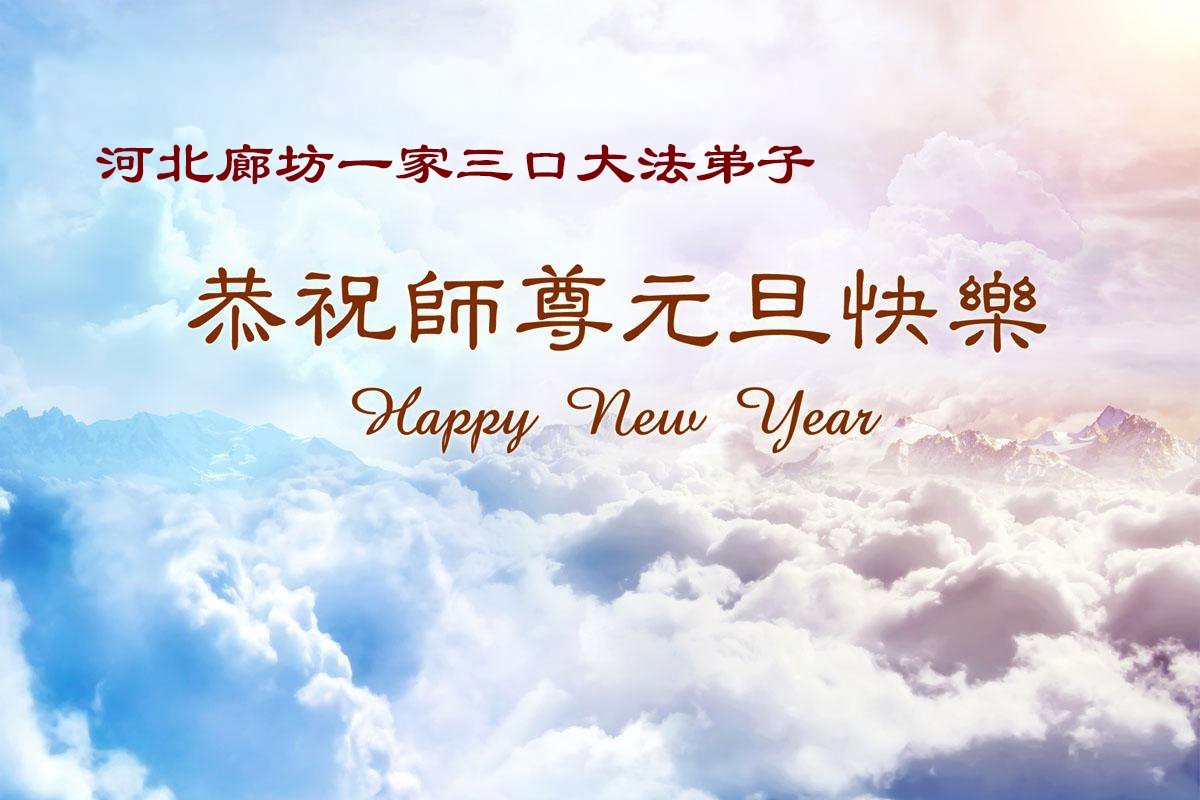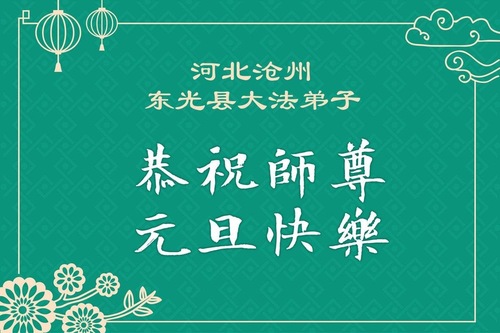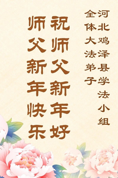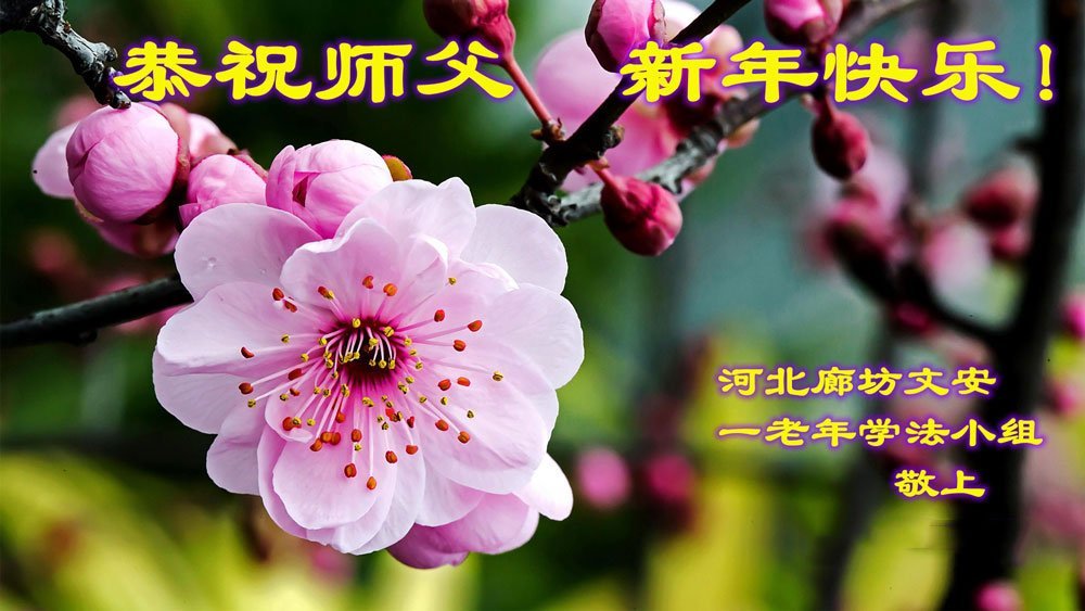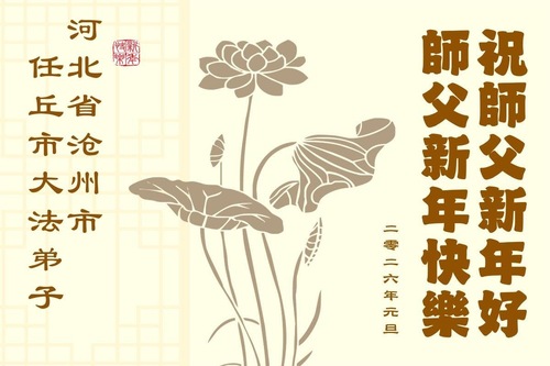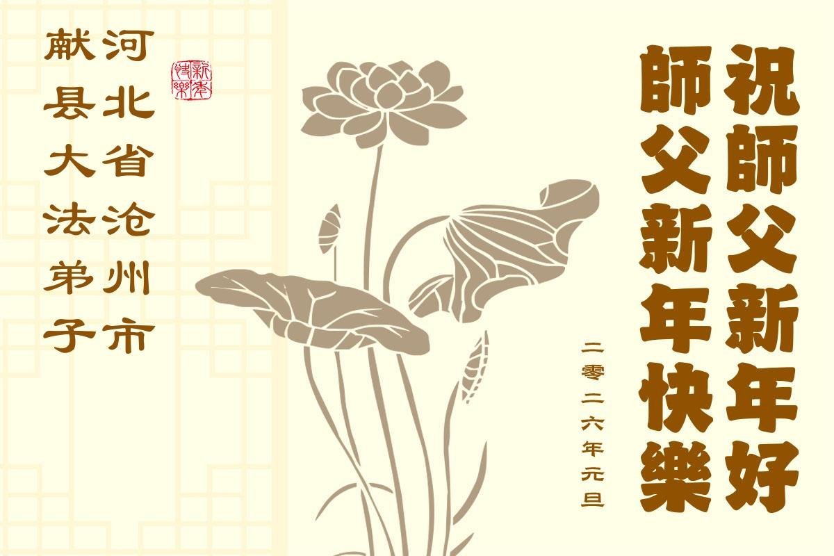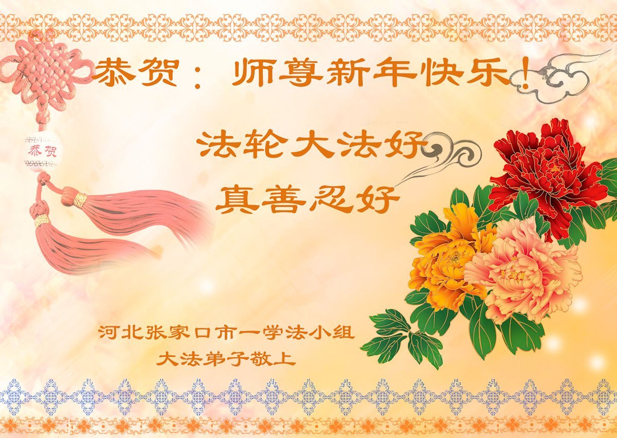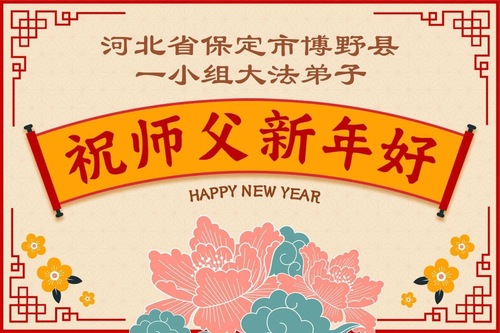 (Minghui.org) Zu Neujahr senden Falun-Dafa-Praktizierende auf der ganzen Welt traditionell Neujahrsgrüße, Grußkarten, Gedichte und Fotos an die Minghui-Website. Damit wünschen sie ihrem verehrten Meister Li Hongzhi ein frohes neues Jahr und bringen dem Meister ihre Dankbarkeit für die barmherzige Errettung zum Ausdruck. Sie geloben, in ihrer Kultivierung fleißig voranzukommen und noch mehr Lebewesen zu erretten. Im Folgenden veröffentlichen wir einen Teil dieser Grüße aus Hebei: