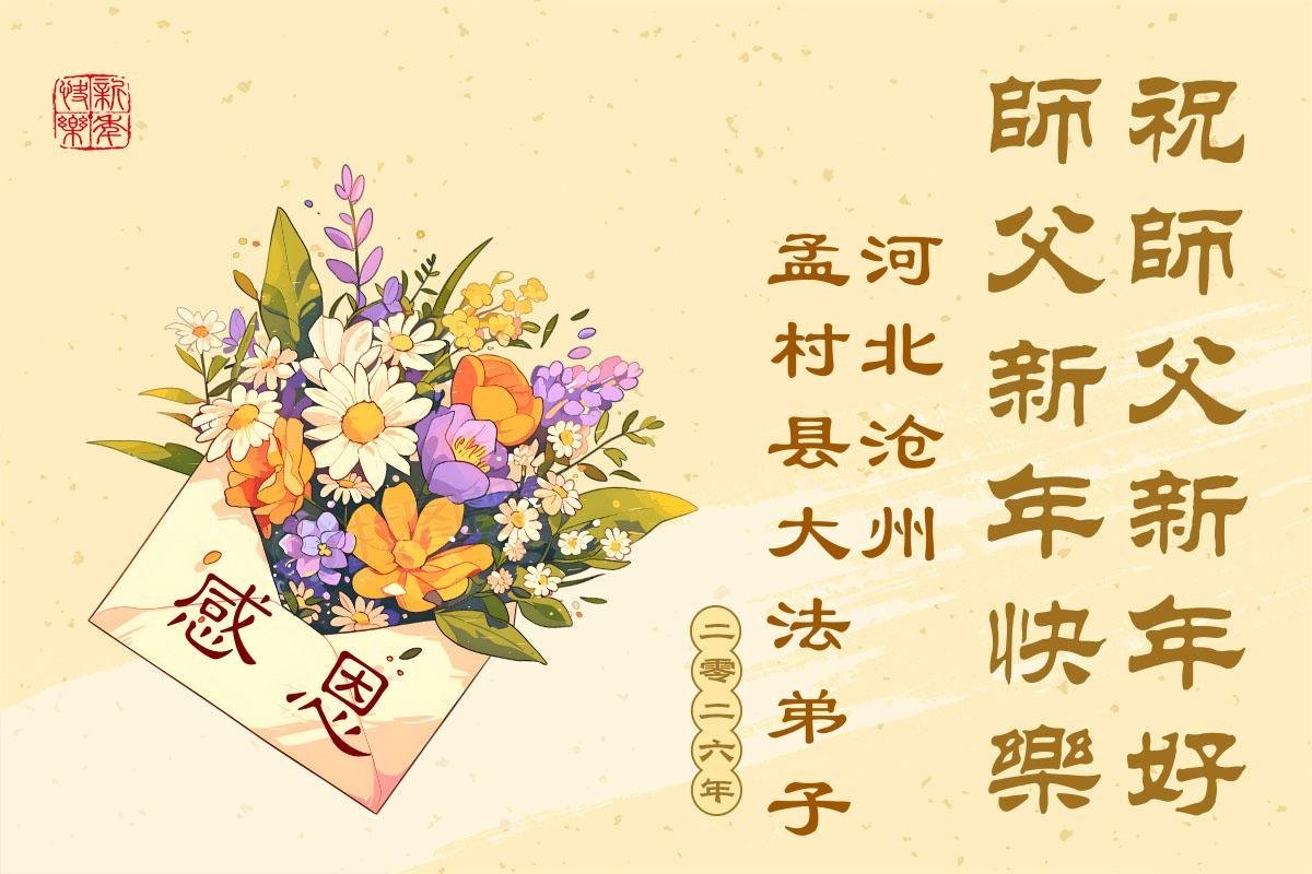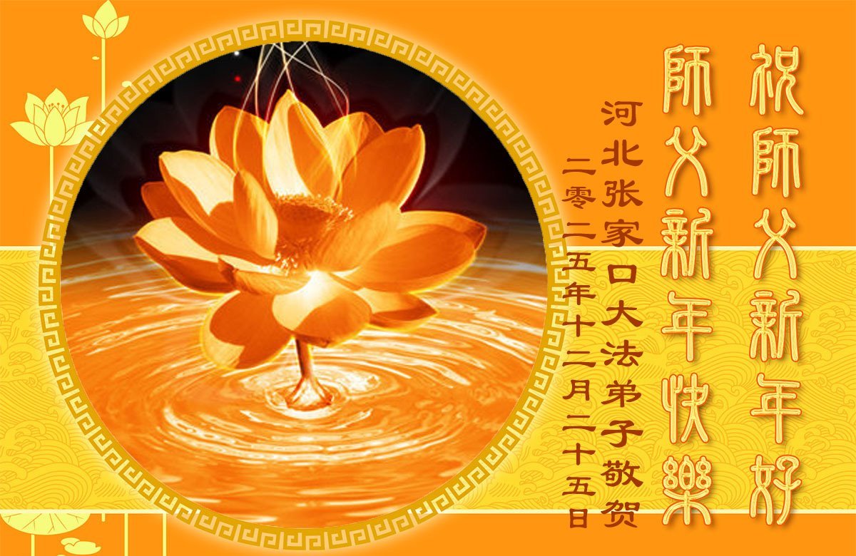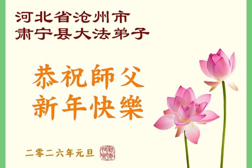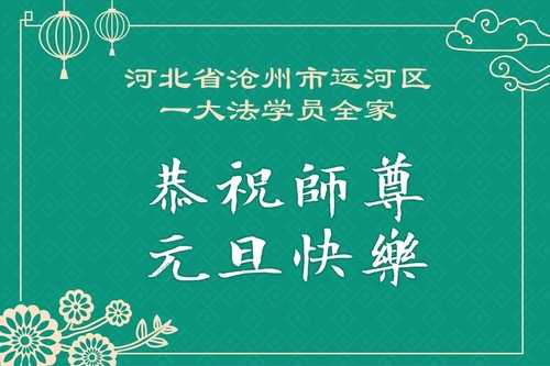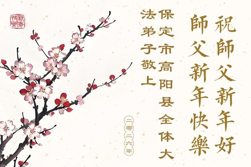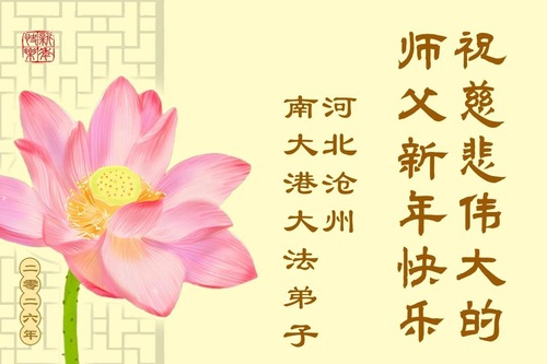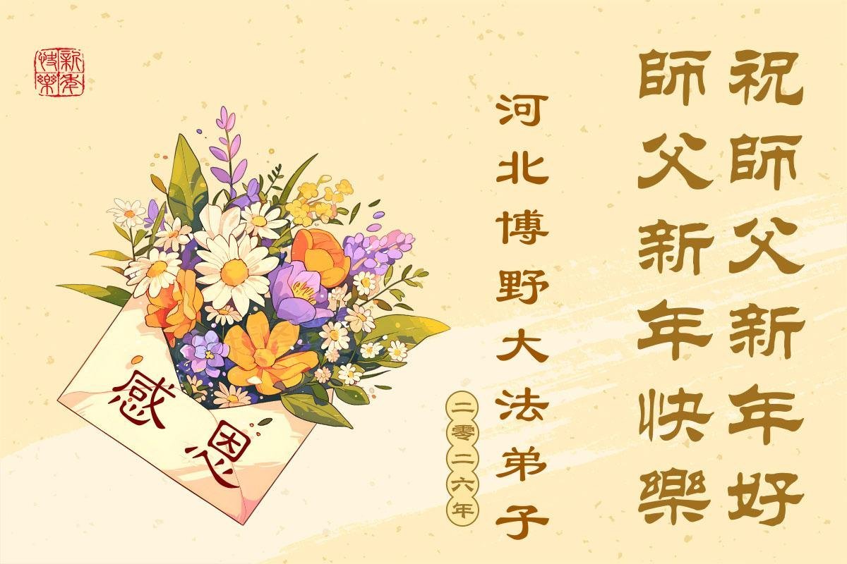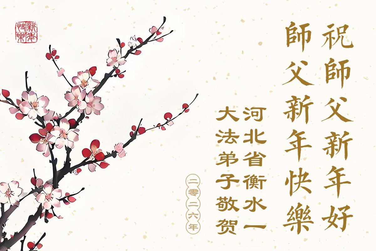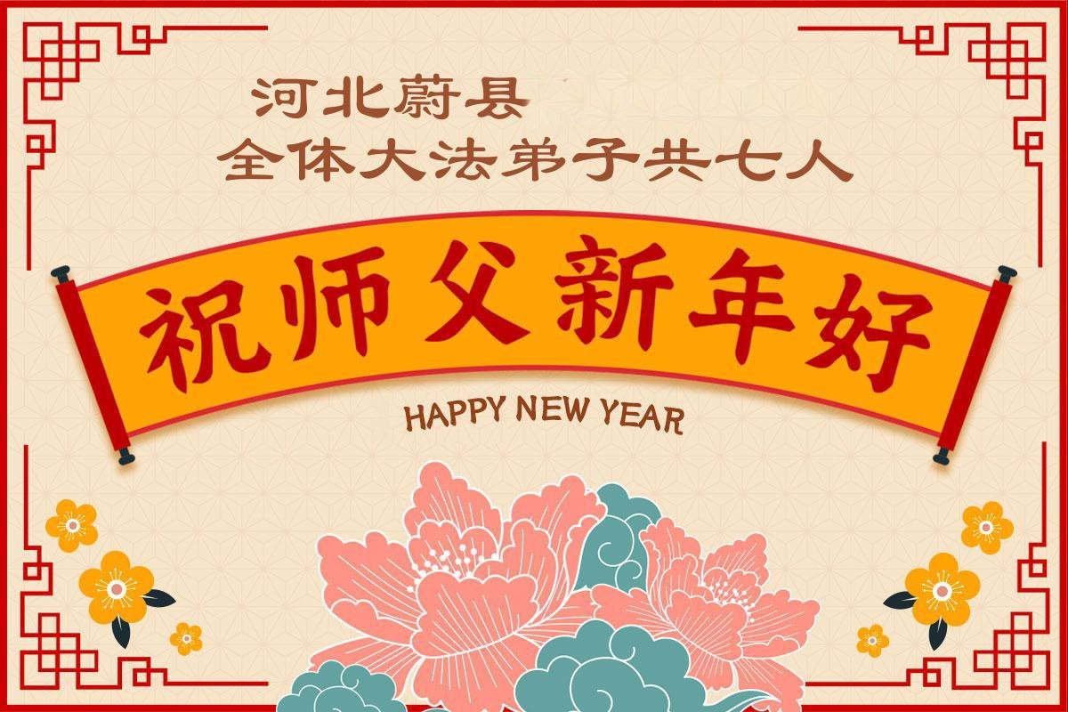 (Minghui.org) Zu Neujahr senden Falun-Dafa-Praktizierende auf der ganzen Welt traditionell Neujahrsgrüße, Grußkarten, Gedichte und Fotos an die Minghui-Website. Damit wünschen sie ihrem verehrten Meister Li Hongzhi ein frohes neues Jahr und bringen dem Meister ihre Dankbarkeit für die barmherzige Errettung zum Ausdruck. Sie geloben, in ihrer Kultivierung fleißig voranzukommen und noch mehr Lebewesen zu erretten. Im Folgenden veröffentlichen wir einen Teil dieser Grüße aus Hebei: