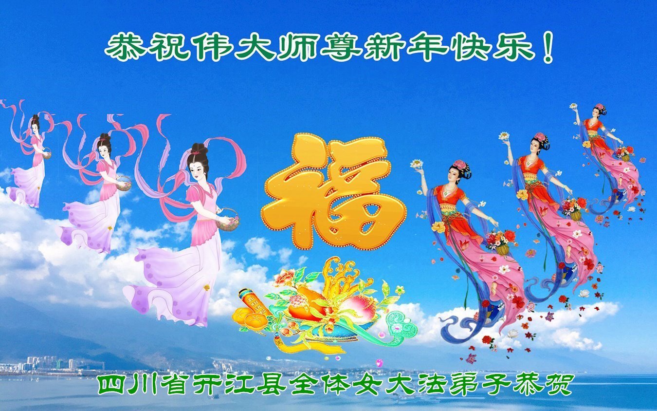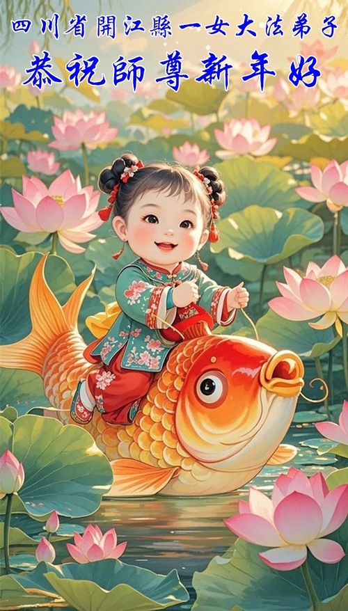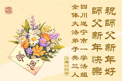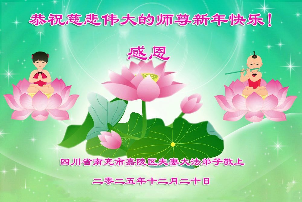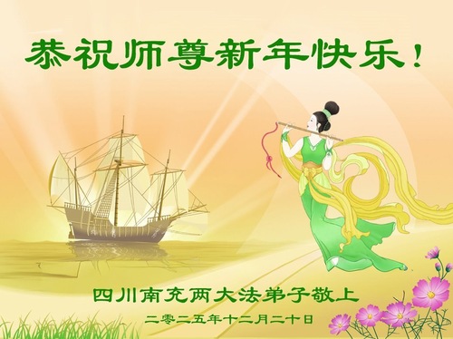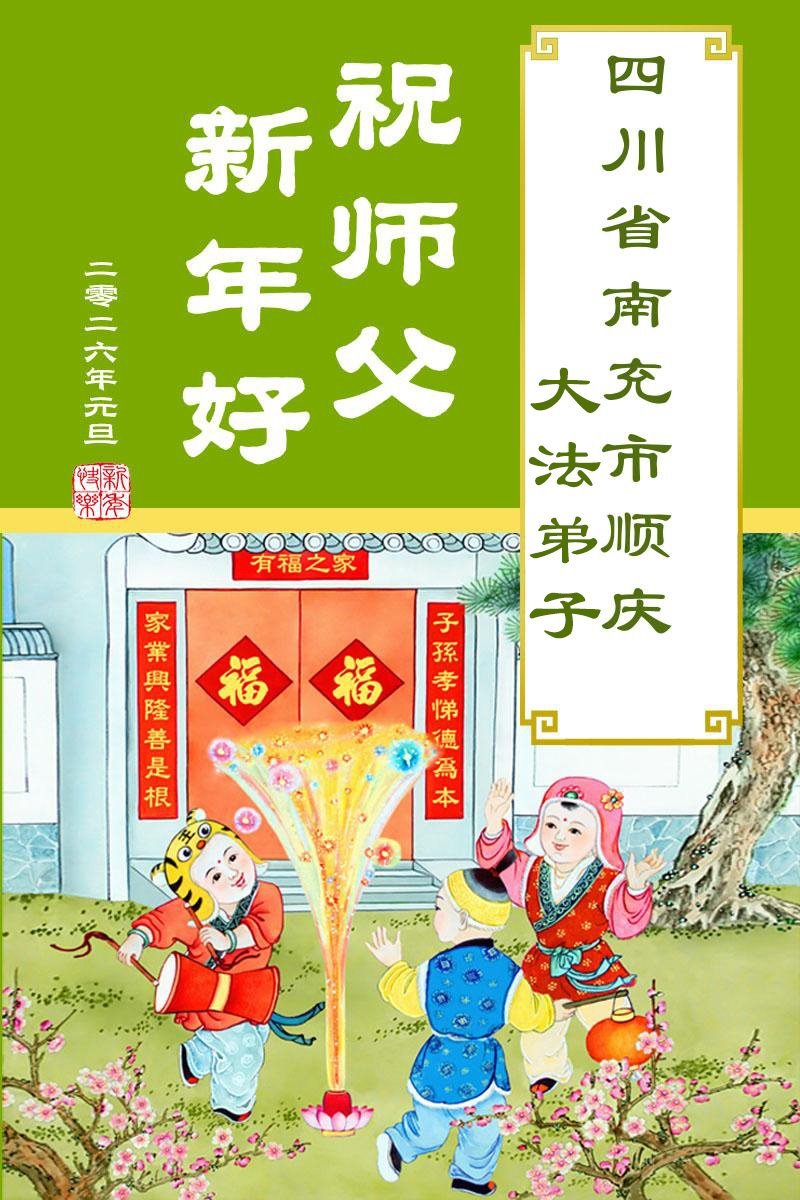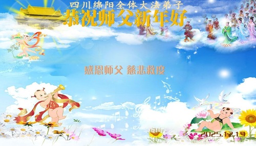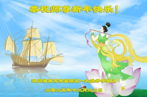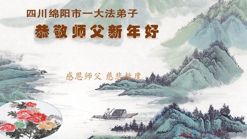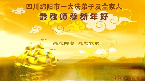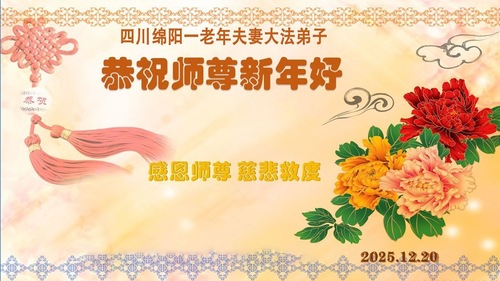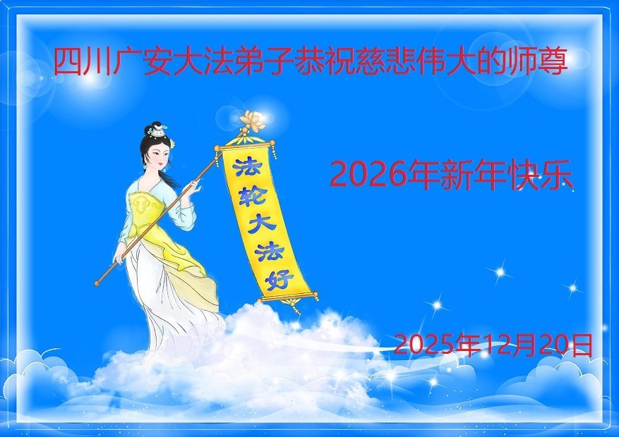 (Minghui.org) Zu Neujahr senden Falun-Dafa-Praktizierende auf der ganzen Welt traditionell Neujahrsgrüße, Grußkarten, Gedichte und Fotos an die Minghui-Website. Damit wünschen sie ihrem verehrten Meister Li Hongzhi ein frohes neues Jahr und bringen dem Meister ihre Dankbarkeit für die barmherzige Errettung zum Ausdruck. Sie geloben, in ihrer Kultivierung fleißig voranzukommen und noch mehr Lebewesen zu erretten. Im Folgenden veröffentlichen wir einen Teil dieser Grüße aus Sichuan: