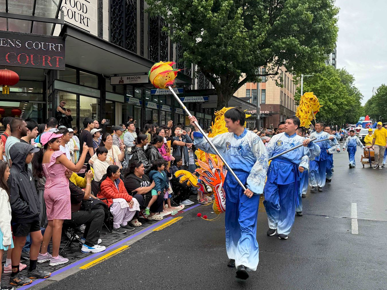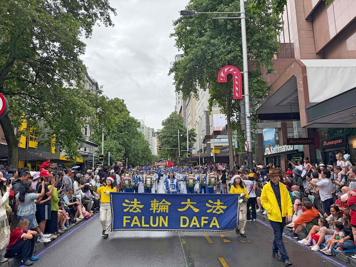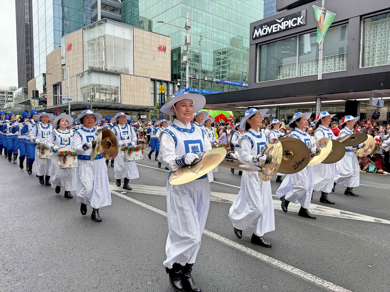 Die Tian Guo Marching Band, bestehend aus Falun-Dafa-Praktizierenden aus Neuseeland und Australien, wurde mit herzlichem Applaus begrüßt. Die Zuschauer machten Fotos, lobten die blau-weißen Outfits der Band und sagten, die Musik passe perfekt zur festlichen Atmosphäre der Veranstaltung. Auffällige Transparente mit der Aufschrift „Wahrhaftigkeit-Güte-Nachsicht“ schmückten den Festwagen. Ihm folgte die Drachentanzgruppe, die den Kindern großen Spaß bereitete.