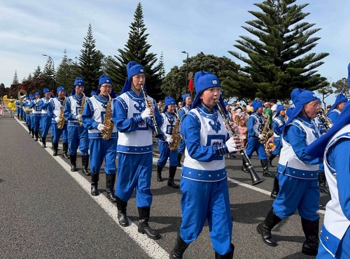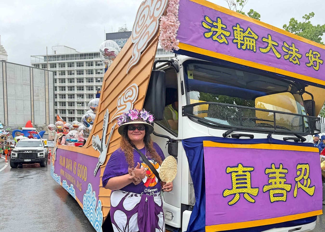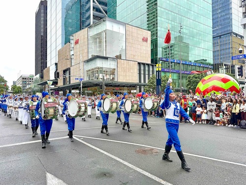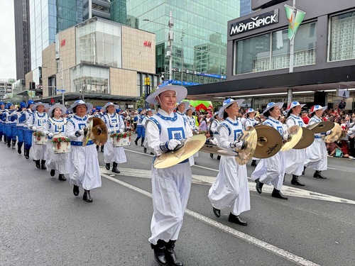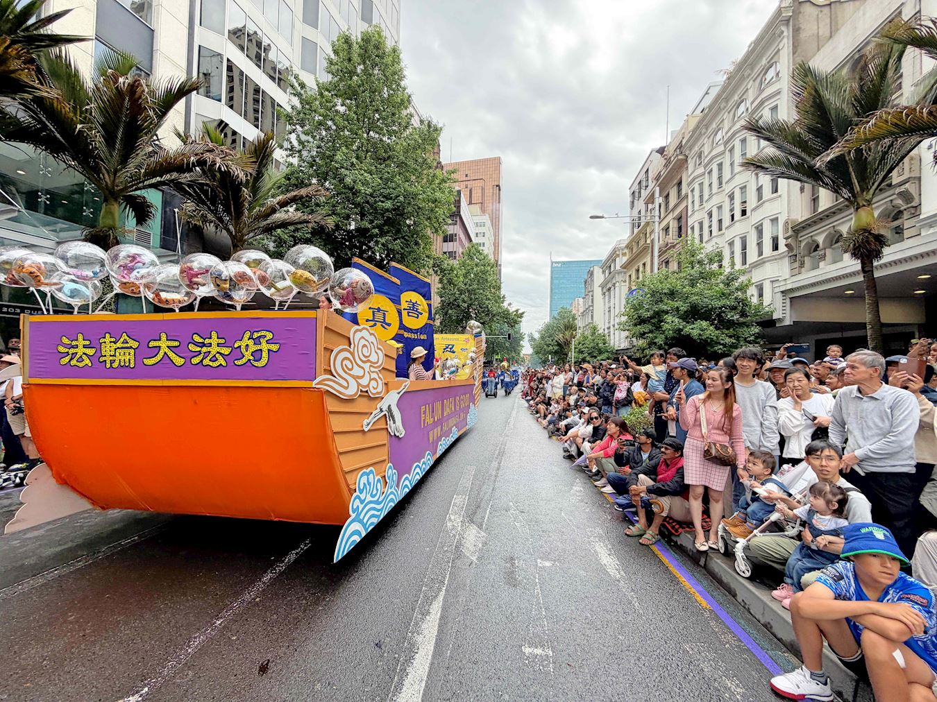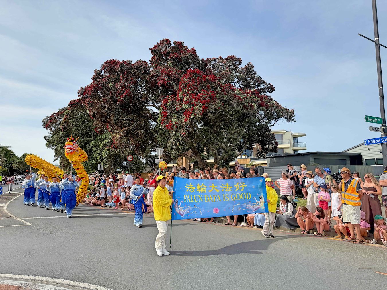 Die Tian Guo Marching Band, bestehend aus Falun-Dafa-Praktizierenden aus Neuseeland und Australien, wurde mit herzlichem Applaus begrüßt. Die Zuschauer machten Fotos, lobten die blau-weißen Outfits der Band und sagten, die Musik passe perfekt zur festlichen Atmosphäre der Veranstaltung. Auffällige Transparente mit der Aufschrift „Wahrhaftigkeit-Güte-Nachsicht“ schmückten den Festwagen. Ihm folgte die Drachentanzgruppe, die den Kindern großen Spaß bereitete.