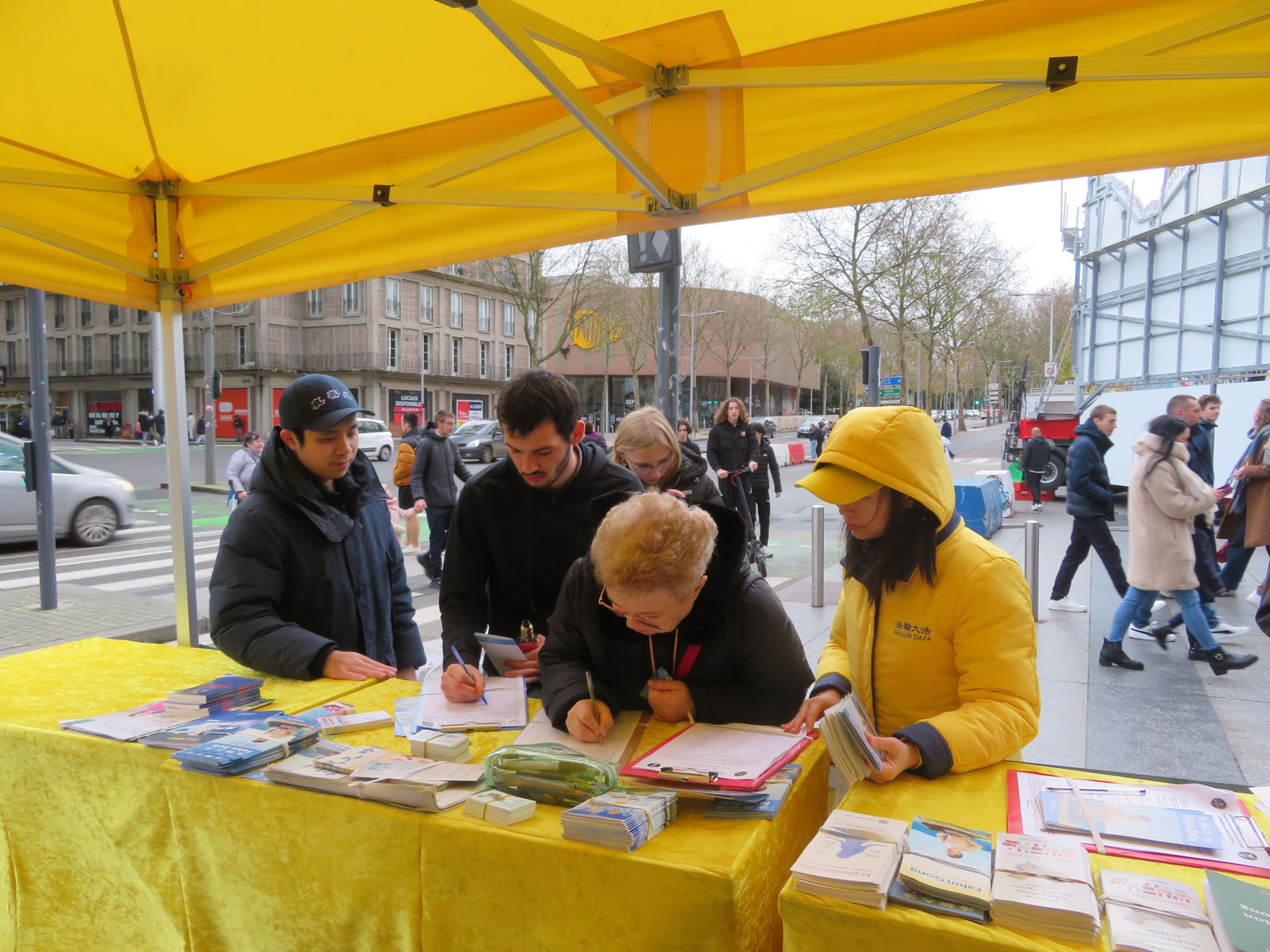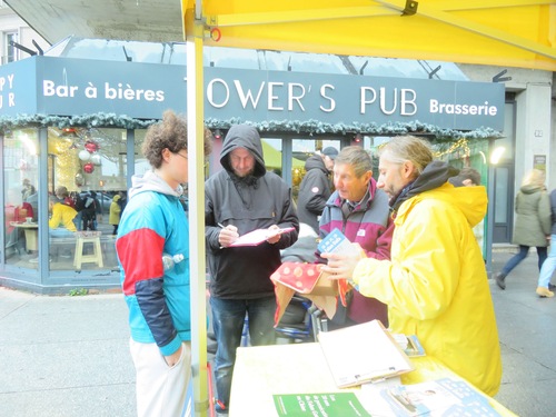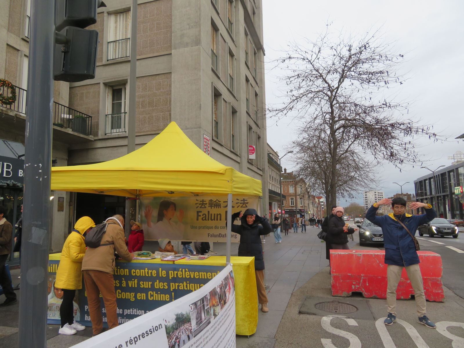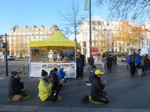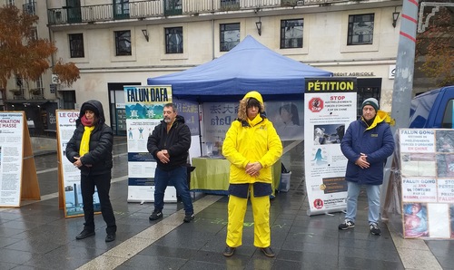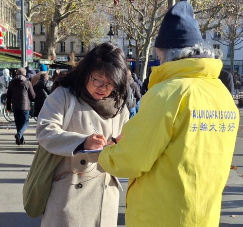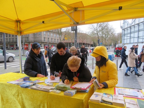 Trotz Regen kamen am 29. November viele Menschen auf dem Place Alphonse Fiquet zusammen und sprachen mit den dortigen Praktizierenden. Auch unterschrieben sie die Petition, die ein Ende der Verfolgung durch die KPCh fordert.