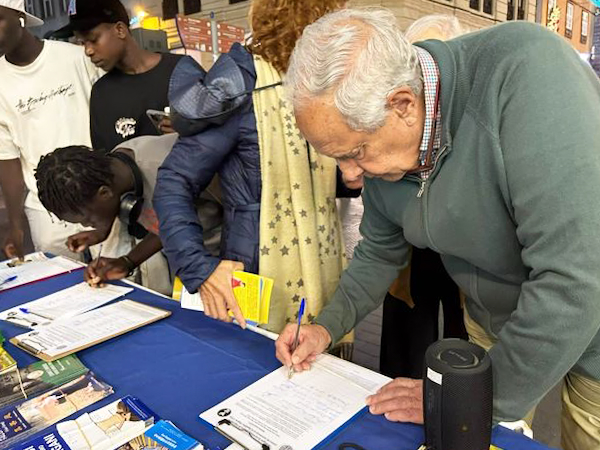 Passanten unterzeichnen eine Petition, die ein Ende der Verfolgung durch die KPCh fordert