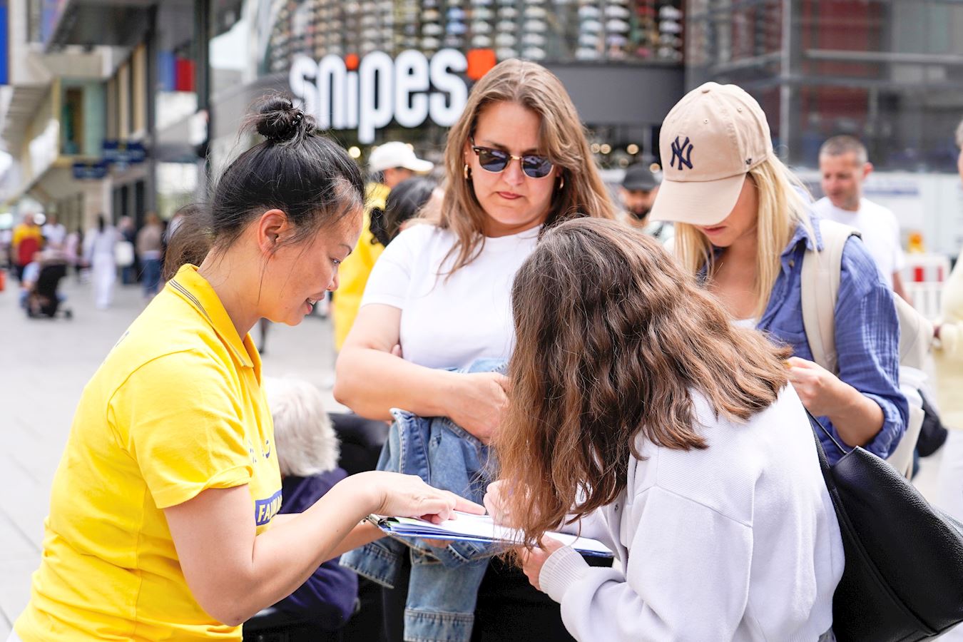 Praktizierende sprechen mit den Passanten über Falun Dafa und verteilen Lotusblumen, die die Schönheit und Reinheit von Falun Dafa symbolisieren. Die Passanten unterschreiben daraufhin gerne die Petition, die ein Ende der Verfolgung in China fordert.