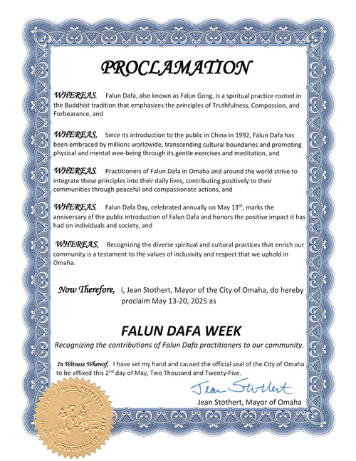 (Minghui.org) Jean Stothert, die Bürgermeisterin von Omaha, Nebraska, erklärte die Woche vom 13. bis 20. Mai 2025 zur „Falun-Dafa-Woche“.