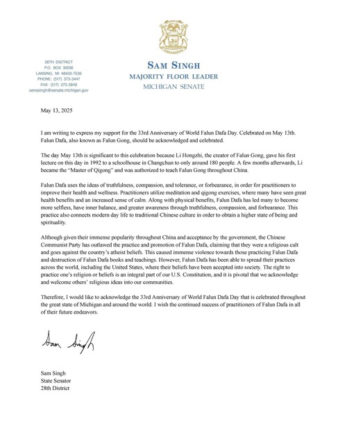 (Minghui.org) Der 13. Mai ist der Welt-Falun-Dafa-Tag und der 33. Jahrestag der öffentlichen Einführung der spirituellen Praxis. Senator Sam Singh aus dem 28. Bezirk von Michigan drückte in einem Brief seine Unterstützung für Falun Dafa aus.