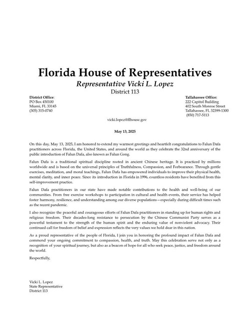 Heute, am 13. Mai 2025, ist es mir eine Ehre, den Falun-Dafa-Praktizierenden in Florida, den Vereinigten Staaten und auf der ganzen Welt zum 32. Jahrestag der öffentlichen Einführung von Falun Dafa, auch bekannt als Falun Gong, meine herzlichsten Grüße und Glückwünsche auszusprechen.