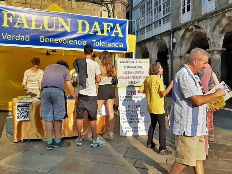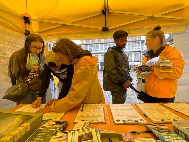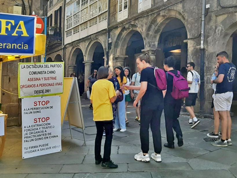 (Minghui.org) Falun-Dafa-Praktizierende in Spanien veranstalteten am 23. und 29. August 2025 Infotage in Santiago de Compostela im Nordwesten Spaniens, um auf die Verfolgung durch die Kommunistische Partei Chinas (KPCh) aufmerksam zu machen. Sie stellten einen Stand auf der Praza do Toural im Stadtzentrum auf, sprachen über Falun Dafa und sammelten Unterschriften für eine Petition zur Beendigung der Verfolgung. Der Platz ist von Gebäuden aus dem 18. und 19. Jahrhundert umgeben und verbindet die älteren und neueren Stadtteile. Er ist ein beliebter Treffpunkt für Einheimische, Touristen und Pilger, die auf dem Jakobsweg (Camino de Santiago) unterwegs sind.
