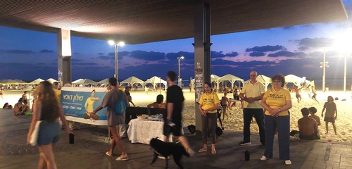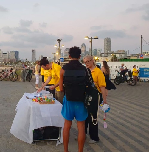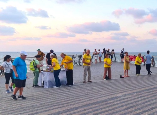 Passanten erfahren an der Promenade von Tel Aviv von Falun Dafa