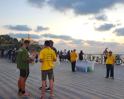 Am gleichen Abend veranstalteten die Praktizierenden Aktionen an zwei weiteren Orten, an denen viele Einheimische und Touristen vorbeikamen: an der Strandpromenade von Tel Aviv sowie in Jaffa.