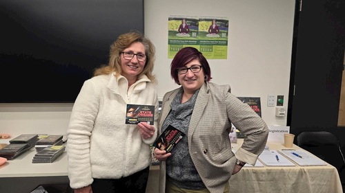 Maria Costas (rechts) und ihre Schwester sehen sich den Dokumentarfilm am 28. August 2025 in der Balwyn Library an