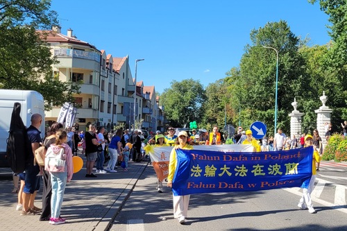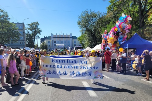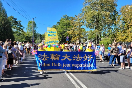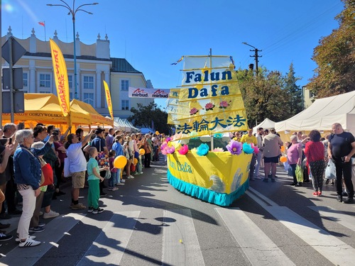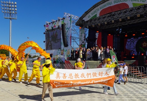 Polnische Falun-Dafa-Praktizierende nehmen seit vielen Jahren an der Erntedankparade teil. Auch in diesem Jahr sorgten der prachtvoll geschmückte Blumenwagen und die tradtitionellen goldenen Drachen aus China für Begeisterung und wurden von den Zuschauern mit herzlichem Applaus empfangen. Auf dem Wagen führten eine Mutter und ihr Sohn die Falun-Dafa-Übungen vor, begleitet von Musik. Ein weiterer Praktizierender neben dem Wagen erklärte die Übungen über Lautsprecher. Auf beiden Seiten des Wagens verteilten Praktizierende Flugblätter an die Zuschauer. Die Transparente mit chinesischen und polnischen Aufschriften vermittelten die Botschaften: „Falun Dafa ist gut“, „Wahrhaftigkeit, Güte und Nachsicht machen uns zu guten Menschen“, „Falun Dafa wird auf der ganzen Welt praktiziert“ und „Falun Dafa in Polen“. Der goldene Drache interagierte mit dem Publikum zu dessen Überraschung und Freude.