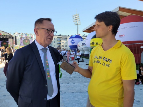 Krzysztof Jażdżyk, Bürgermeister von Skärniewice, dankte den Falun-Dafa-Praktizierenden für ihre Teilnahme an der Parade und erklärte: „Dies ist die einzige Parade dieser Größenordnung in Polen. Vielen Dank für Ihre Teilnahme.“