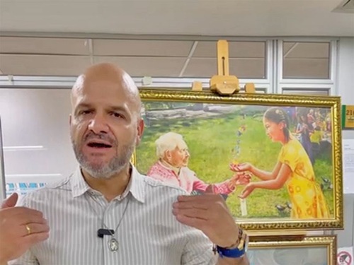 „Einige [der Gemälde] haben mich besonders fasziniert. Wie ich bereits erwähnt habe, sehen wir hier eine obdachlose [Praktizierende] auf der Straße, auf der ein Erzengel steht, der sie beschützt […] und auf seiner Geige für sie spielt. Er vermittelt eine Botschaft der Hoffnung und schenkt ihr Frieden inmitten der Not“, sagte er. „Das gefällt mir sehr gut und ich gratuliere Ihnen zu diesen Kunstwerken.“