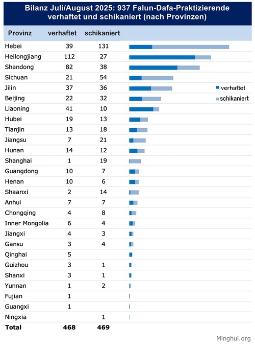 (Minghui.org) Im Juli und August 2025 wurden insgesamt 937 Falun-Dafa-Praktizierende wegen ihres Glaubens verhaftet oder schikaniert – diese Fälle sind inzwischen bestätigt.
