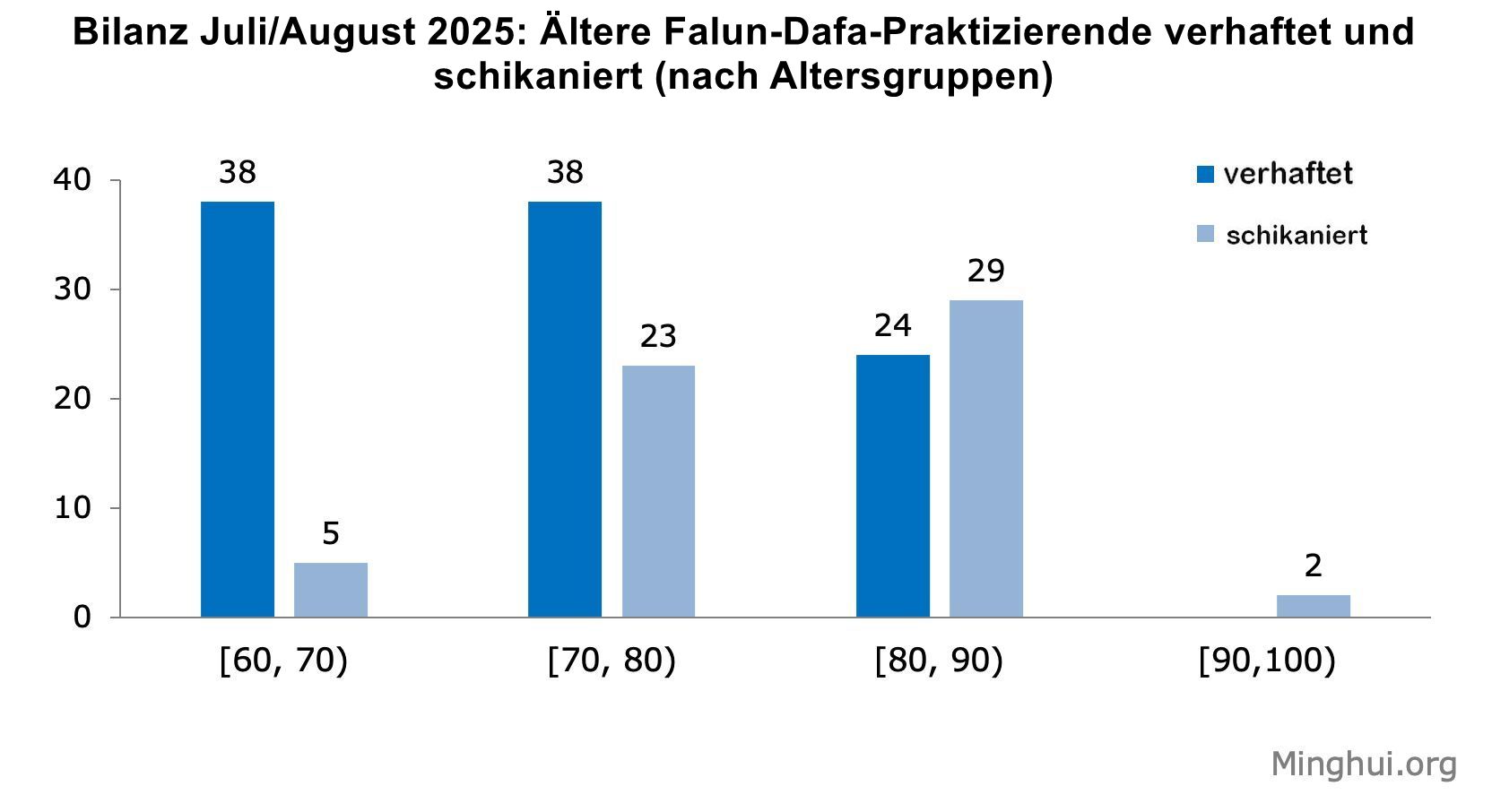 Bei mindestens 159 Praktizierenden betrug das Alter zum Zeitpunkt ihrer Verhaftung oder Schikane 60 Jahre oder älter. Darunter waren 43 Praktizierende über 60, 61 über 70, 53 über 80, und 2 über 90 Jahre alt. Der älteste war ein 92-jähriger Mann aus der Stadt Jixi, Provinz Heilongjiang, der zusammen mit seiner 86-jährigen Frau schikaniert wurde.