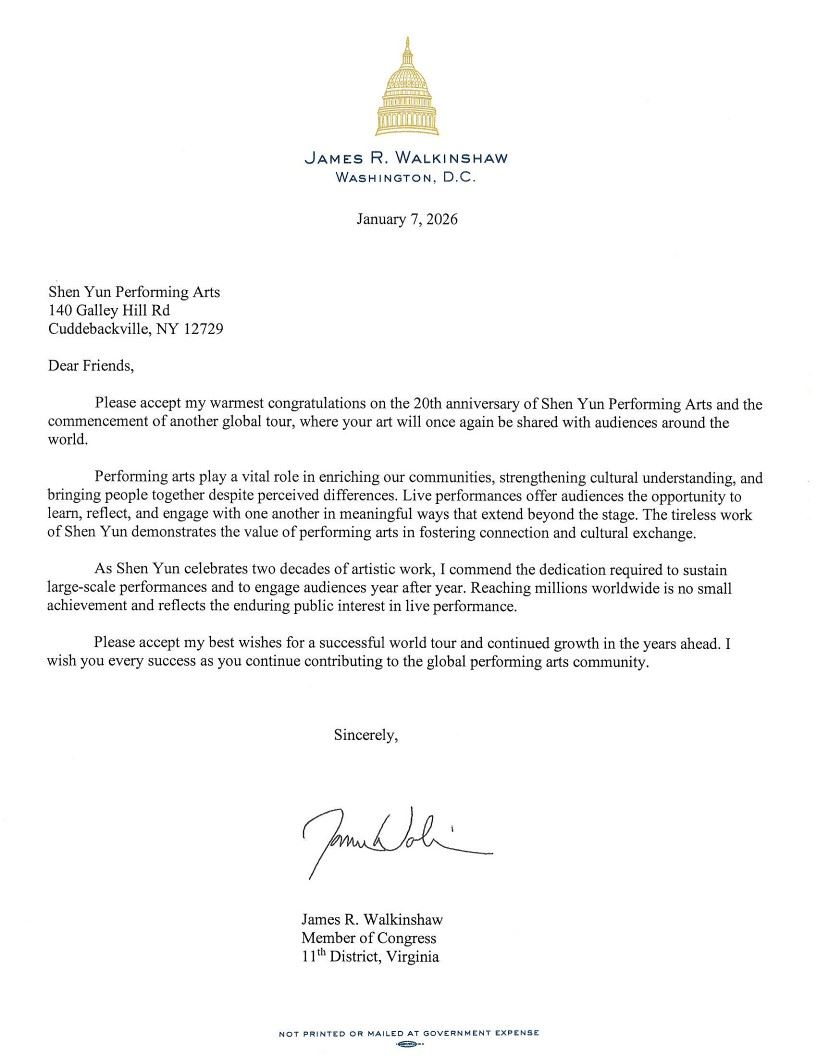 (Minghui.org) Der US-Kongressabgeordnete James Walkinshaw aus Virginia hat einen Brief geschrieben und der Künstlergruppe Shen Yun Performing Arts zum 20-jährigen Bestehen gratuliert.