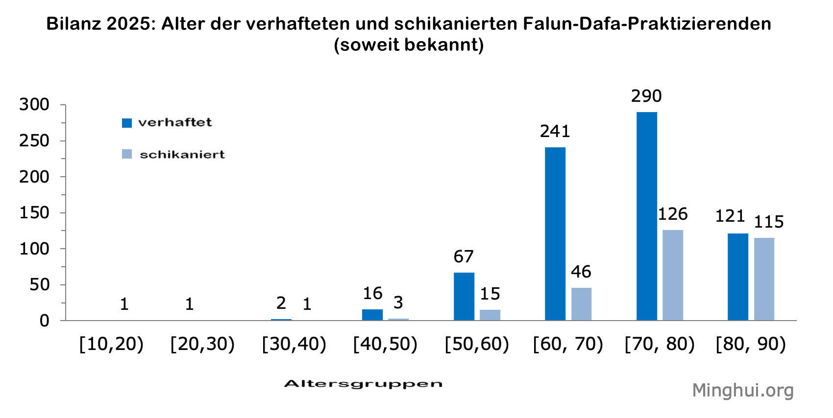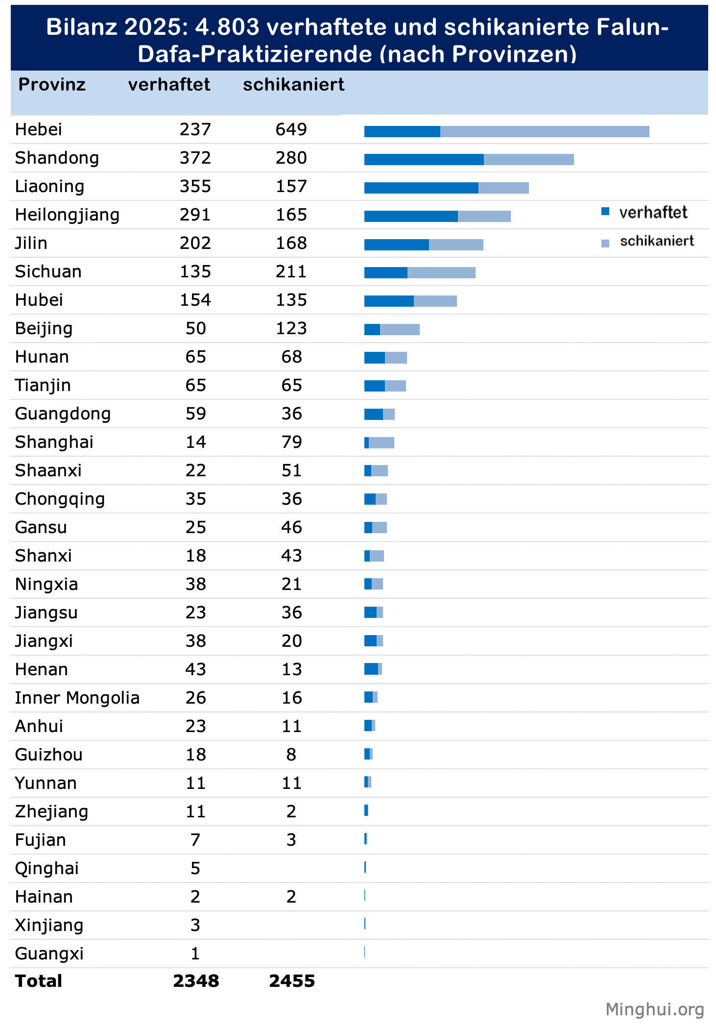 Die obigen Beispiele sind nur drei von insgesamt 4.803 Fällen von Verhaftung oder Schikane von Falun-Dafa-Praktizierenden, die 2025 neu gemeldet wurden. Aufgrund der strengen Informationszensur der Kommunistischen Partei Chinas (KPCh), die es Minghui-Korrespondenten oft unmöglich macht, die Verfolgung zeitnah zu dokumentieren und darüber zu berichten, ereigneten sich einige der gemeldeten Vorfälle bereits vor 2025.