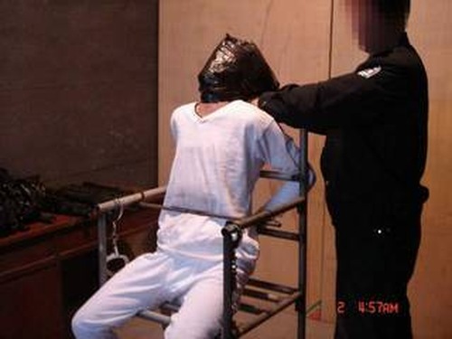 Folterdarstellung: Dem Gefangenen wird eine Plastiktüte über den Kopf gestülpt