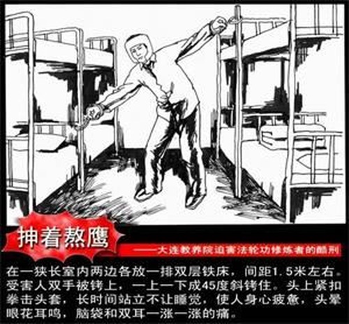 Die Wärter des Arbeitslagers entzogen Song über längere Zeit den Schlaf. Ihre Arme waren in einem Winkel von 45 Grad an die Ober- und Unterseite zweier gegenüberliegender Betten gefesselt (siehe Abbildung unten), sodass sie nicht aufrecht stehen konnte. Die Wärter setzten ihr außerdem einen Helm auf. Ein Wärter namens Ding Haiying schlug sie so heftig, dass ihre Nase blutete. Nach langem Stehen und Schlafentzug war ihr schwindlig, und sie hörte ein Pfeifen in den Ohren. Außerdem litt sie unter pulsierenden Schmerzen in Kopf und Ohren.