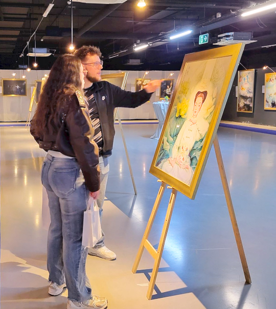 Er sei von den Techniken der frühen Werke beeindruckt gewesen. „In einigen Werken scheinen die Hände oder Objekte aus der Leinwand herauszugreifen, und diese Nutzung der räumlichen Tiefe ist sehr fesselnd. Ich schätze das sehr“, betonte Arthur und fügte hinzu, dass ihn ein Werk, das dieselbe Person auf verschiedenen Existenzebenen darstellt, besonders beeindruckt habe, das Gemälde mit dem Titel „Mit reinem Herzen die göttliche Ebene erreichen“. Ihn beeindruckten die verschiedenen Erscheinungsformen der Person in dem Gemälde.