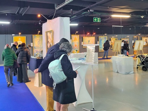 (Minghui.org) Die internationale Ausstellung „Die Kunst von Zhen Shan Ren“ (Wahrhaftigkeit Güte Nachsicht) fand vom 12. Dezember 2025 bis zum 11. Januar 2026 in Belgien statt. Sie war im I’ILOT Saint-Michel neben dem berühmten Place Saint-Lambert in Lüttich zu sehen. Die ausgestellten Werke stammen von Künstlern, die Falun Dafa praktizieren. In ihren Arbeiten vermittelten die Künstler ihr Verständnis von „Wahrhaftigkeit, Barmherzigkeit und Nachsicht“ und vom Sinn des Lebens. Gleichzeitig veranschaulichten sie die Ausdauer und das Mitgefühl von Praktizierenden, die durch die Kommunistische Partei Chinas verfolgt werden.