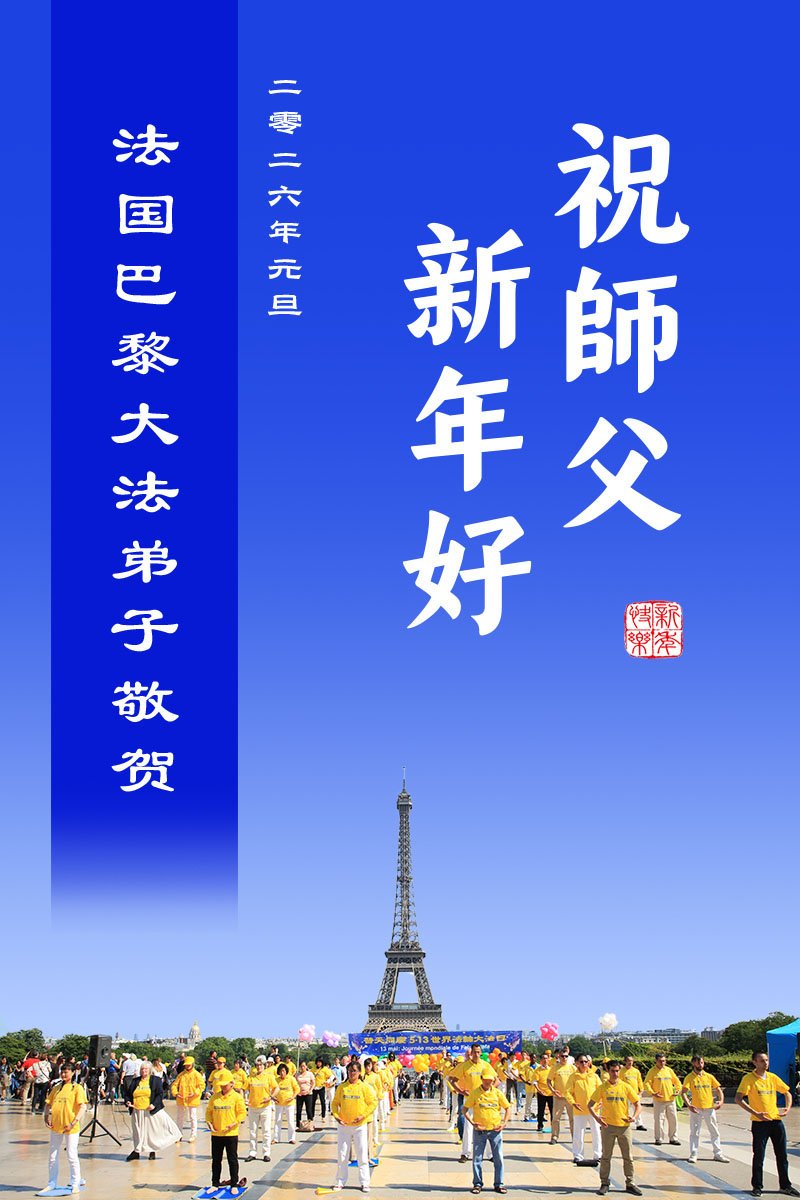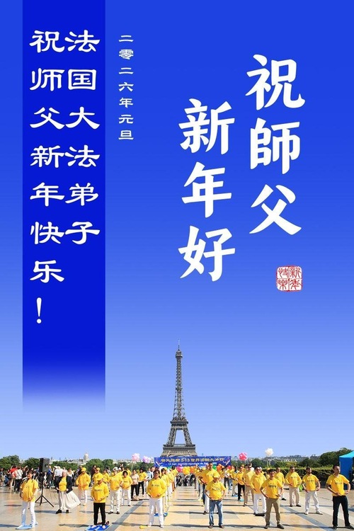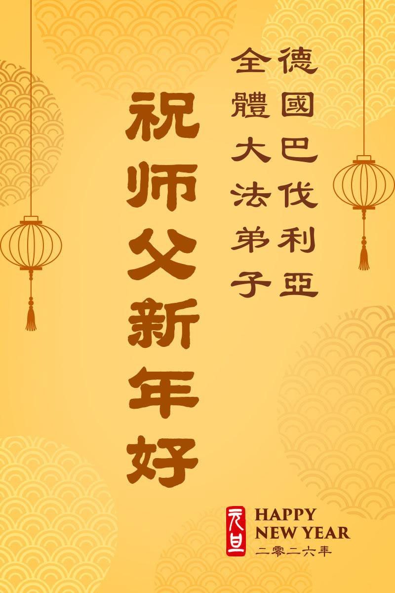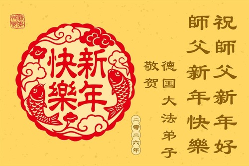 Alle Dafa-Jünger in Deutschland wünschen dem verehrten Meister ehrerbietig ein glückliches neues Jahr! Mit allen Worten dieser Welt lässt sich die Dankbarkeit der Jünger gegenüber dem Meister nicht ausdrücken. Nur indem wir uns nach den Anforderungen des Fa kultivieren, den Meister bei der Fa-Berichtigung unterstützen und die Lebewesen erretten, können wir die Gnade des Meisters vergelten.