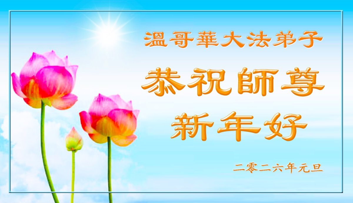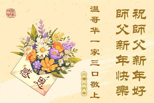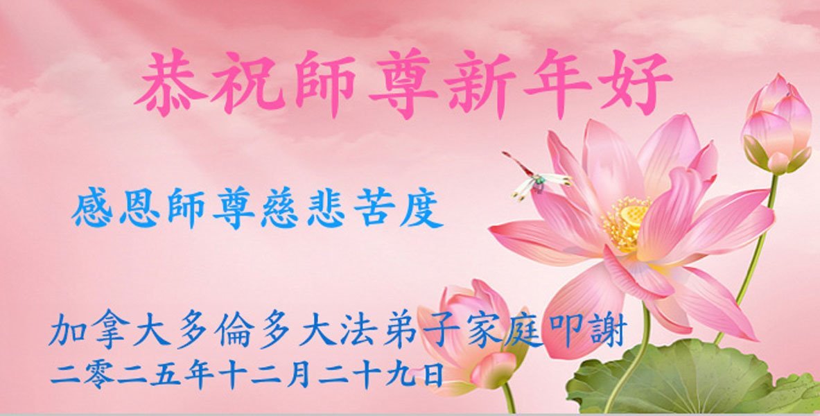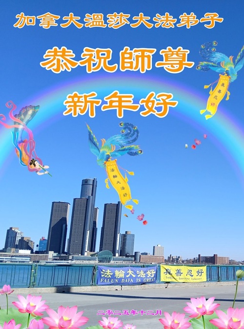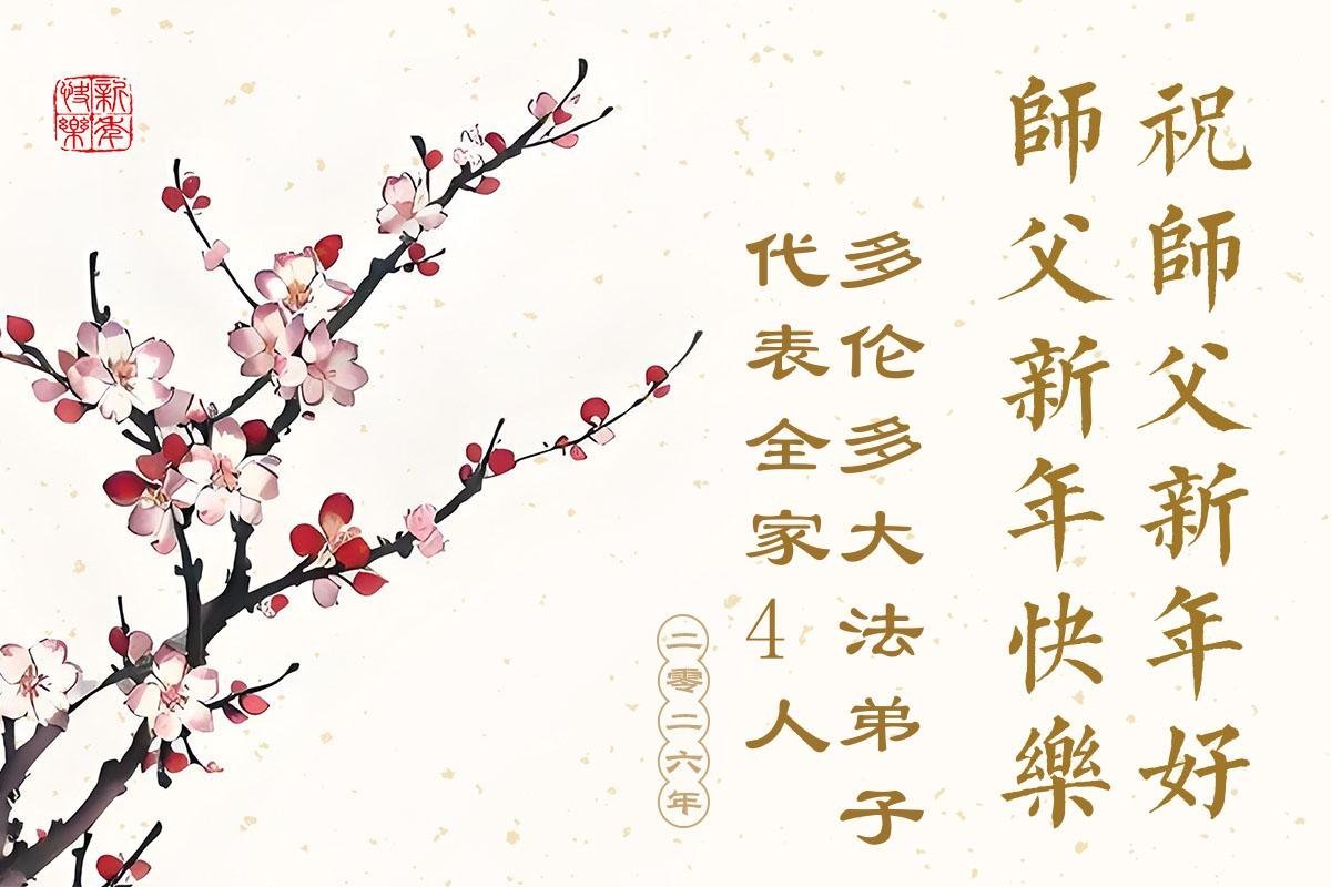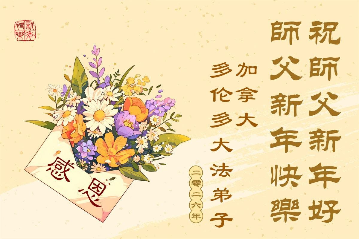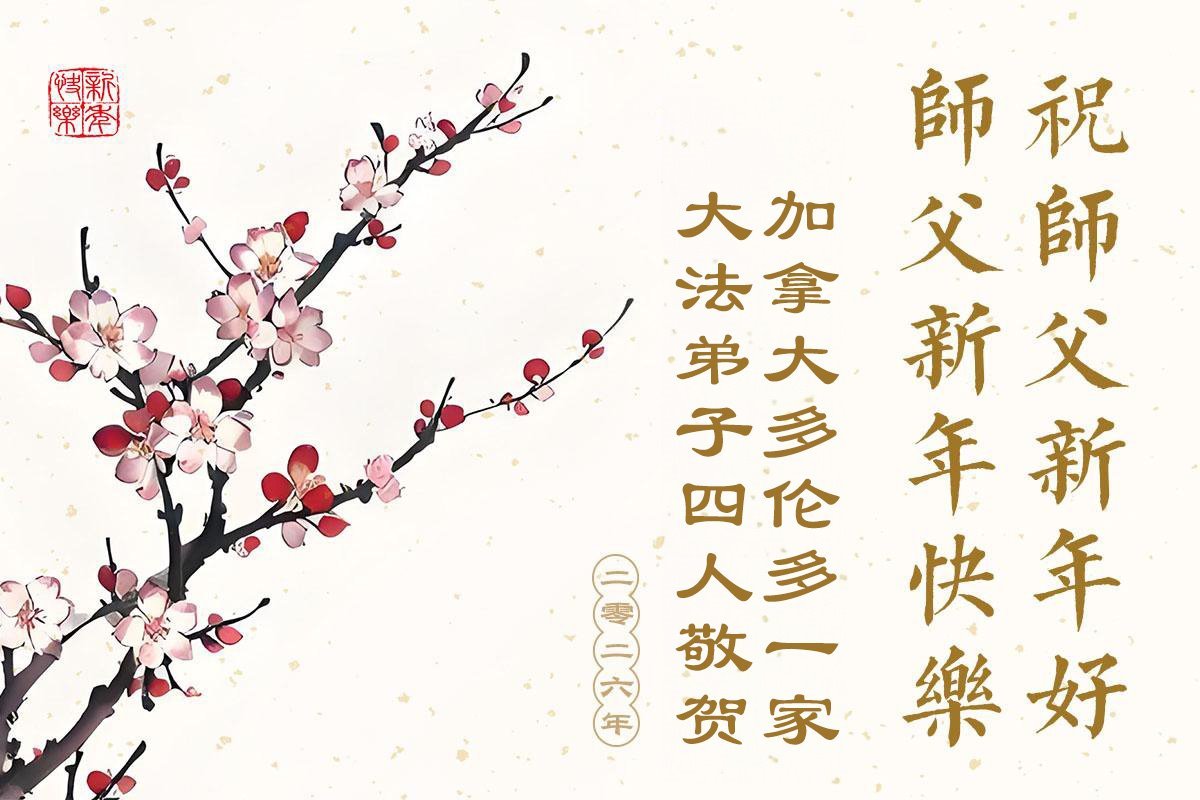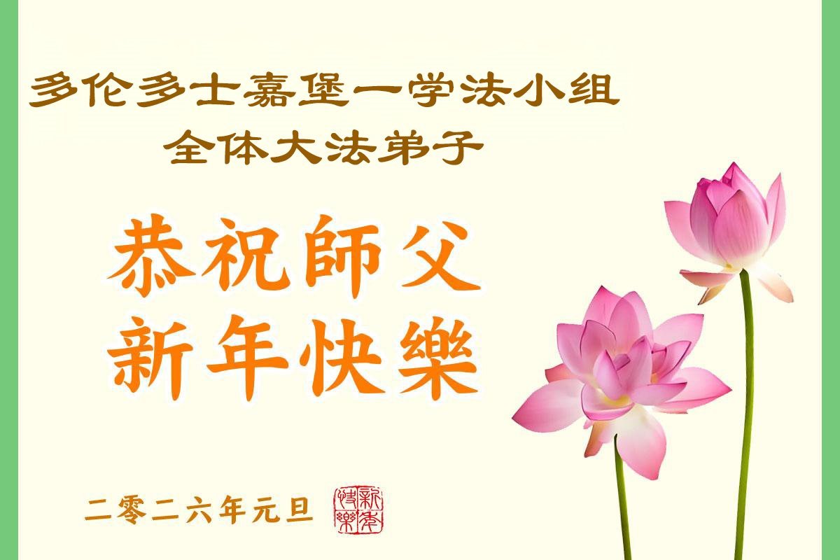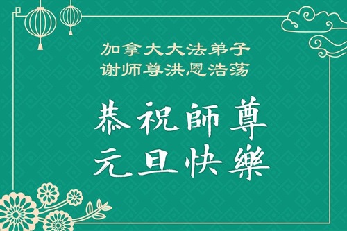 (Minghui.org) Zu Neujahr senden Falun-Dafa-Praktizierende auf der ganzen Welt traditionell Neujahrsgrüße, Grußkarten, Gedichte und Fotos an die Minghui-Website. Damit wünschen sie ihrem verehrten Meister Li Hongzhi ein frohes neues Jahr und bringen dem Meister ihre Dankbarkeit für die barmherzige Errettung zum Ausdruck. Sie geloben, in ihrer Kultivierung fleißig voranzukommen und noch mehr Lebewesen zu erretten. Im Folgenden veröffentlichen wir einen Teil dieser Grüße aus Kanada: