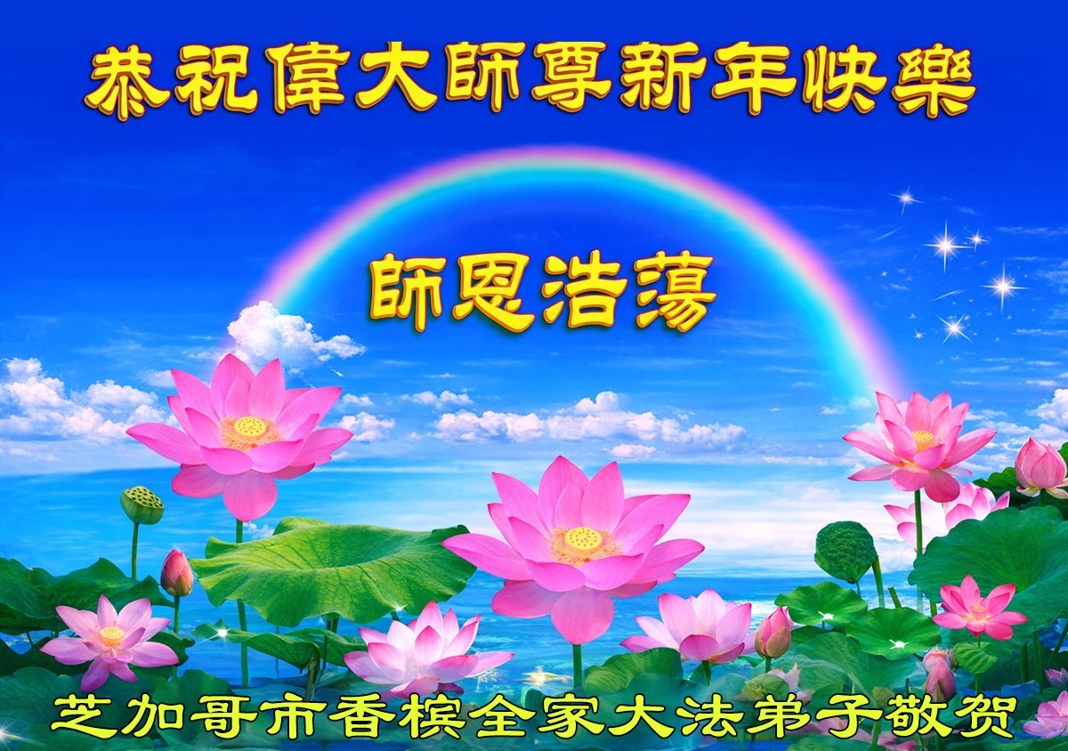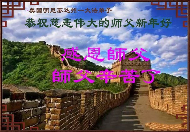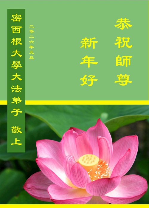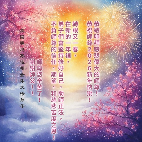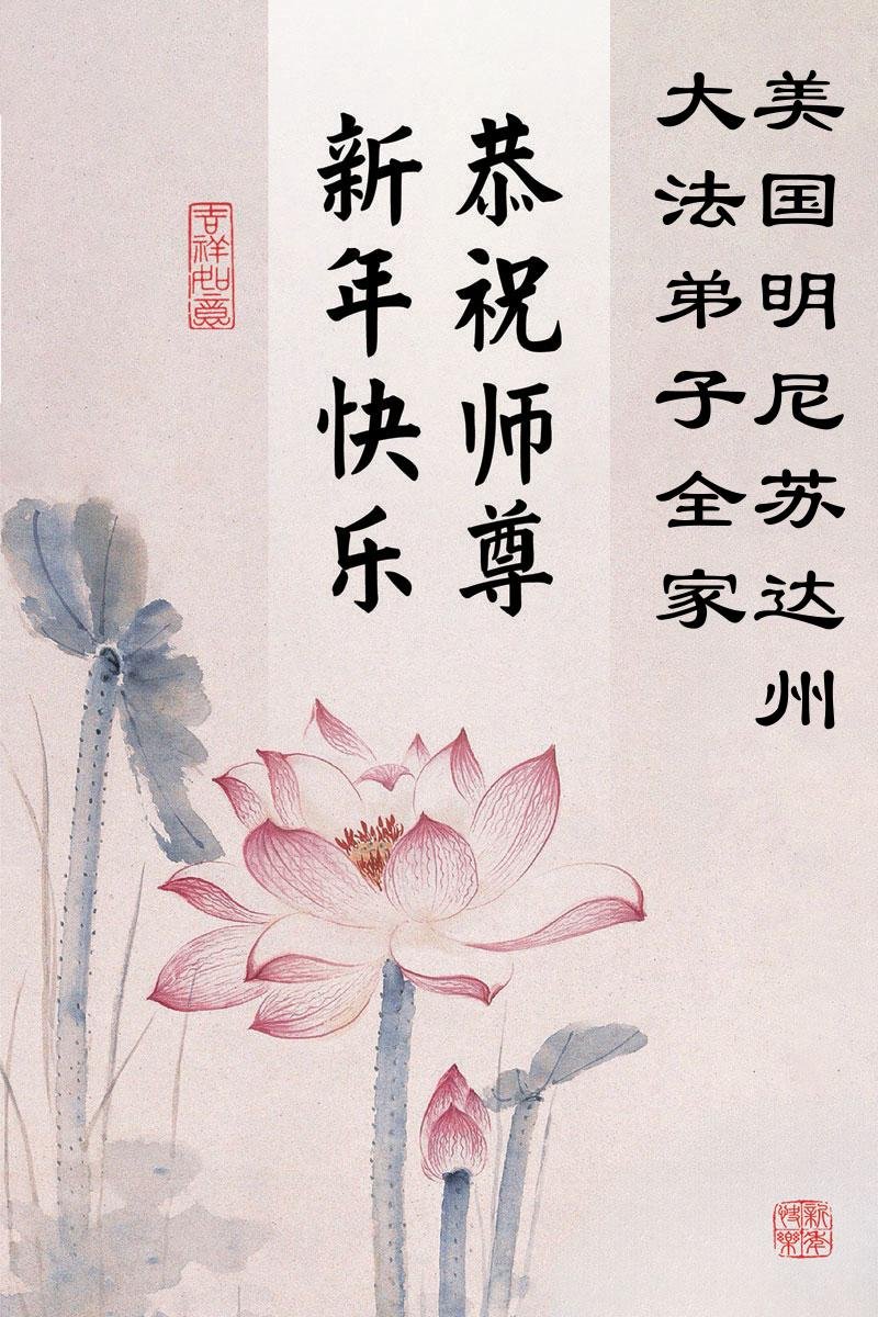 (Minghui.org) Zu Neujahr senden Falun-Dafa-Praktizierende auf der ganzen Welt traditionell Neujahrsgrüße, Grußkarten, Gedichte und Fotos an die Minghui-Website. Damit wünschen sie ihrem verehrten Meister Li Hongzhi ein frohes neues Jahr und bringen dem Meister ihre Dankbarkeit für die barmherzige Errettung zum Ausdruck. Sie geloben, in ihrer Kultivierung fleißig voranzukommen und noch mehr Lebewesen zu erretten. Im Folgenden veröffentlichen wir einen Teil dieser Grüße aus der Mitte der USA: