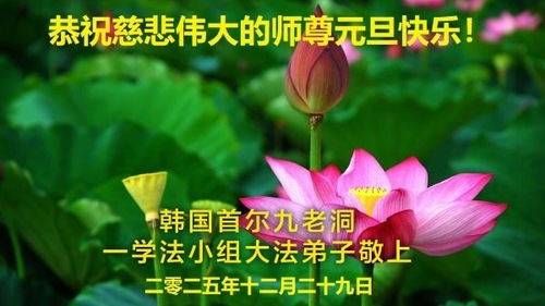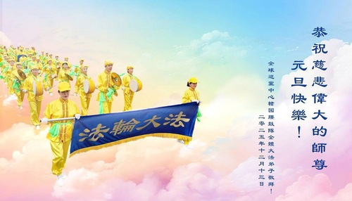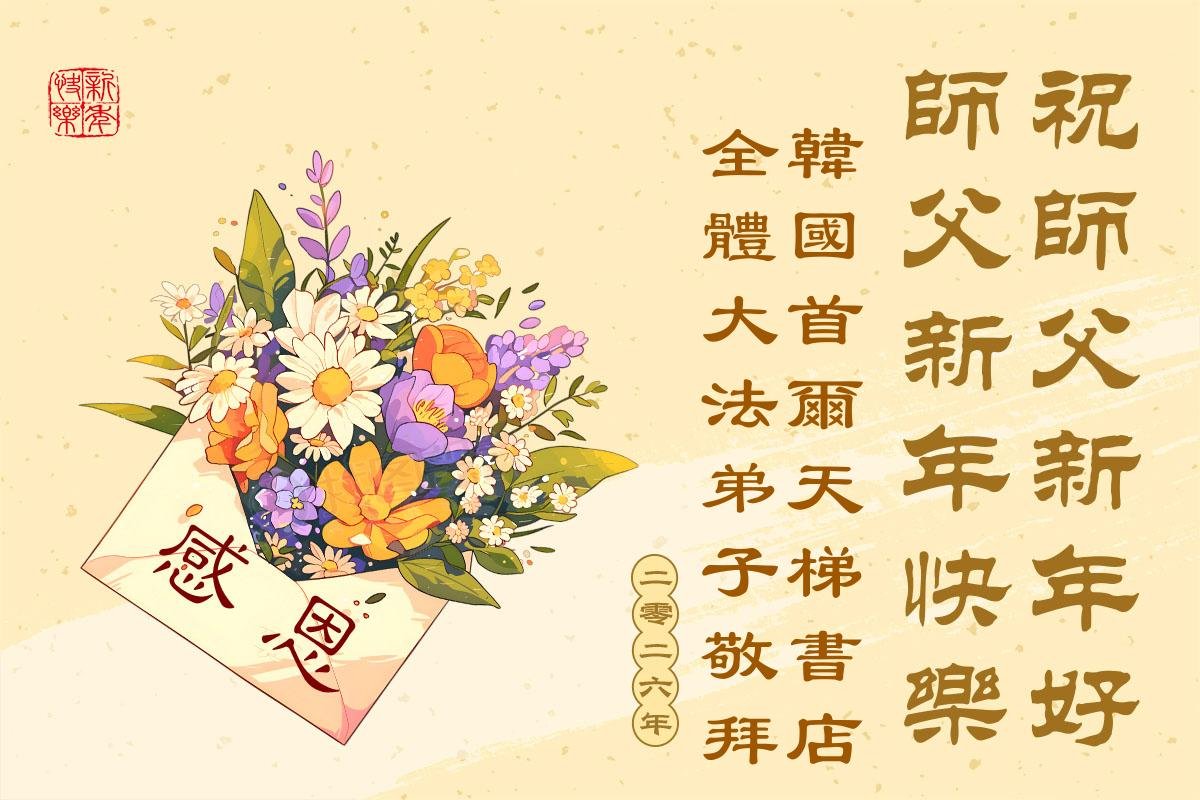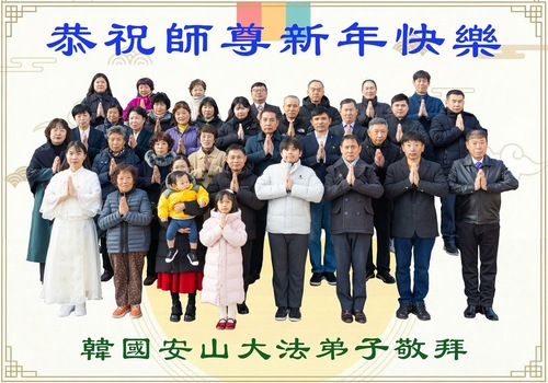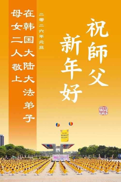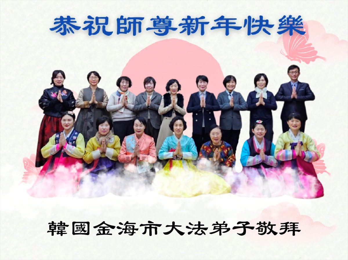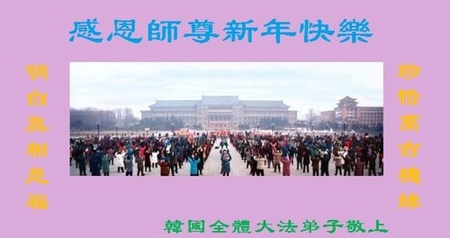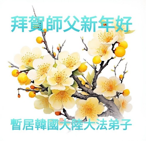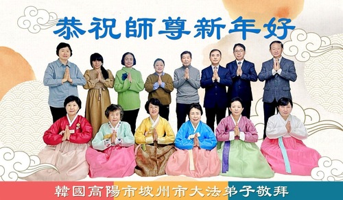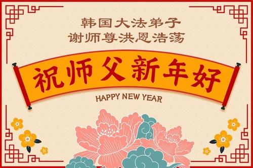(Minghui.org) Zu Neujahr senden Falun-Dafa-Praktizierende auf der ganzen Welt traditionell Neujahrsgrüße, Grußkarten, Gedichte und Fotos an die Minghui-Website. Damit wünschen sie ihrem verehrten Meister Li Hongzhi ein frohes neues Jahr und bringen dem Meister ihre Dankbarkeit für die barmherzige Errettung zum Ausdruck. Sie geloben, in ihrer Kultivierung fleißig voranzukommen und noch mehr Lebewesen zu erretten. Im Folgenden veröffentlichen wir einen Teil dieser Grüße aus mehreren Regionen in Südkorea: