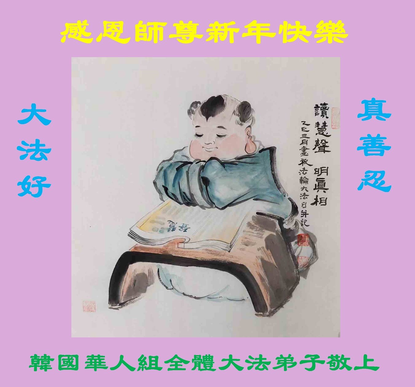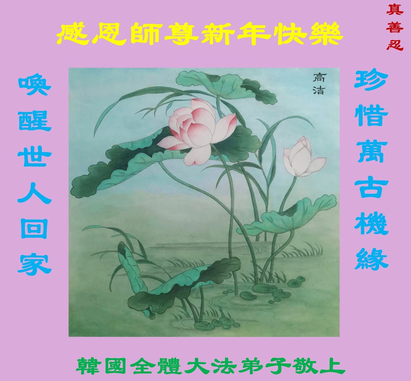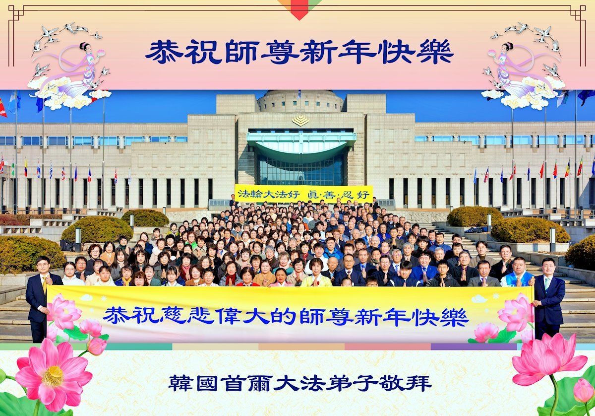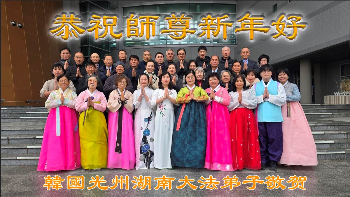 (Minghui.org) Zu Neujahr senden Falun-Dafa-Praktizierende auf der ganzen Welt traditionell Neujahrsgrüße, Grußkarten, Gedichte und Fotos an die Minghui-Website. Damit wünschen sie ihrem verehrten Meister Li Hongzhi ein frohes neues Jahr und bringen dem Meister ihre Dankbarkeit für die barmherzige Errettung zum Ausdruck. Sie geloben, in ihrer Kultivierung fleißig voranzukommen und noch mehr Lebewesen zu erretten. Im Folgenden veröffentlichen wir einen Teil dieser Grüße aus mehreren Regionen in Südkorea: