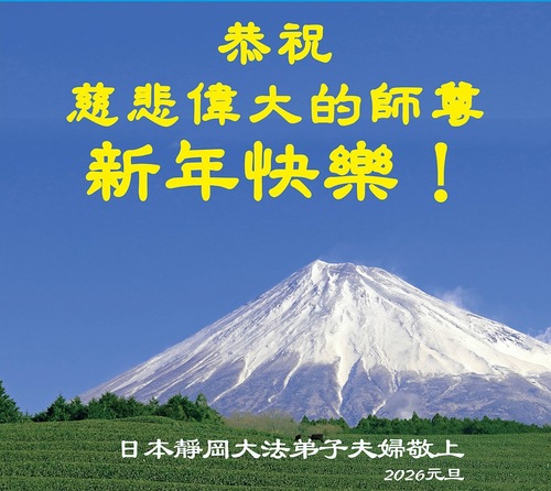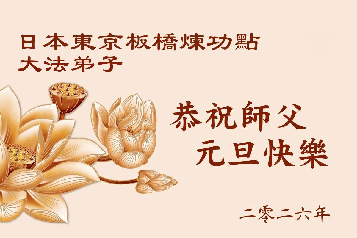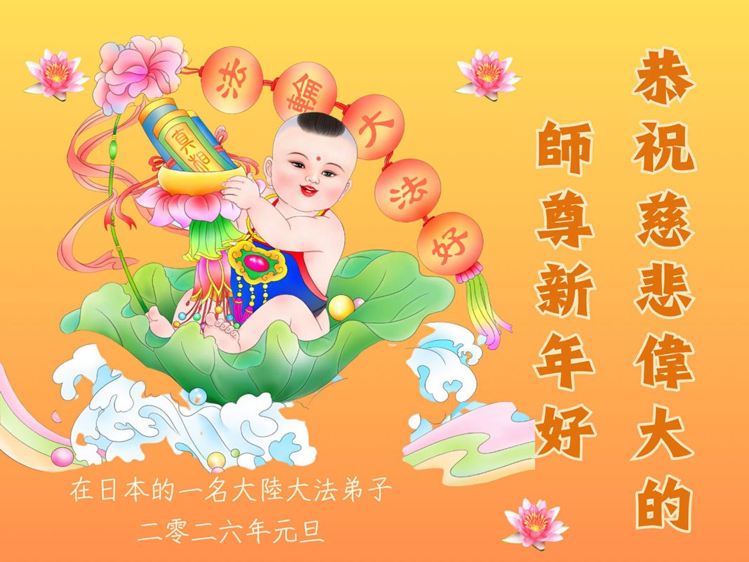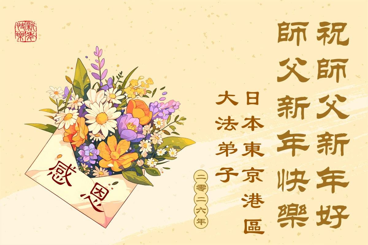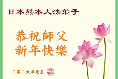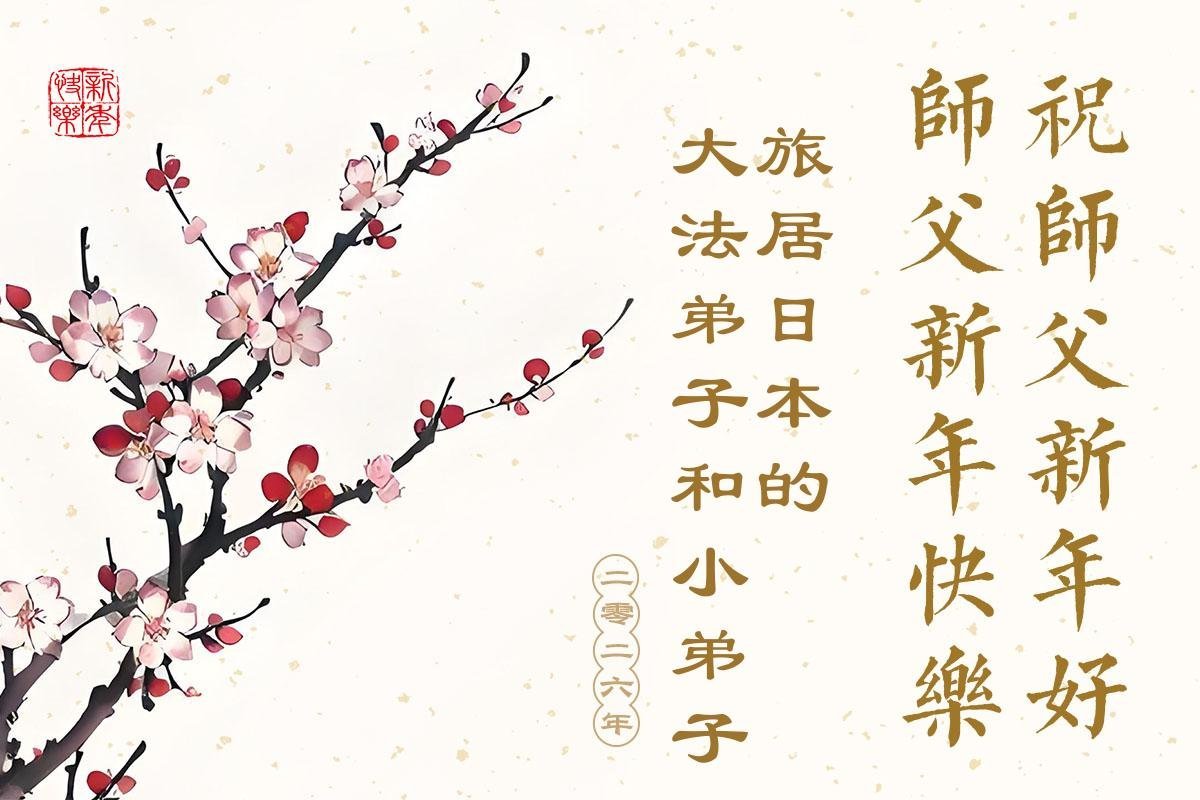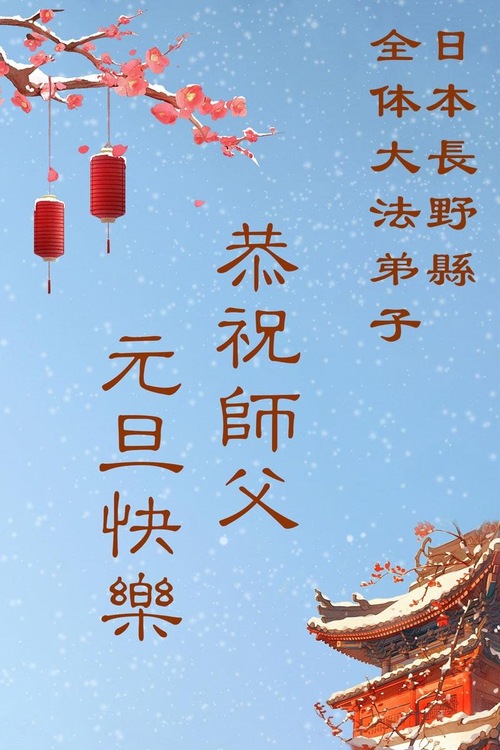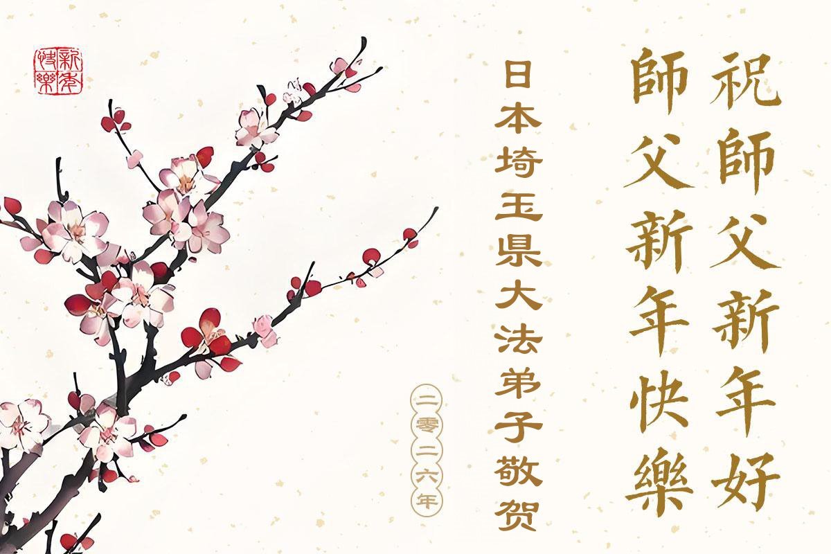 (Minghui.org) Zu Neujahr senden Falun-Dafa-Praktizierende auf der ganzen Welt traditionell Neujahrsgrüße, Grußkarten, Gedichte und Fotos an die Minghui-Website. Damit wünschen sie ihrem verehrten Meister Li Hongzhi ein frohes neues Jahr und bringen dem Meister ihre Dankbarkeit für die barmherzige Errettung zum Ausdruck. Sie geloben, in ihrer Kultivierung fleißig voranzukommen und noch mehr Lebewesen zu erretten. Im Folgenden veröffentlichen wir einen Teil dieser Grüße aus mehreren Regionen in Japan: