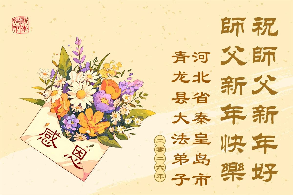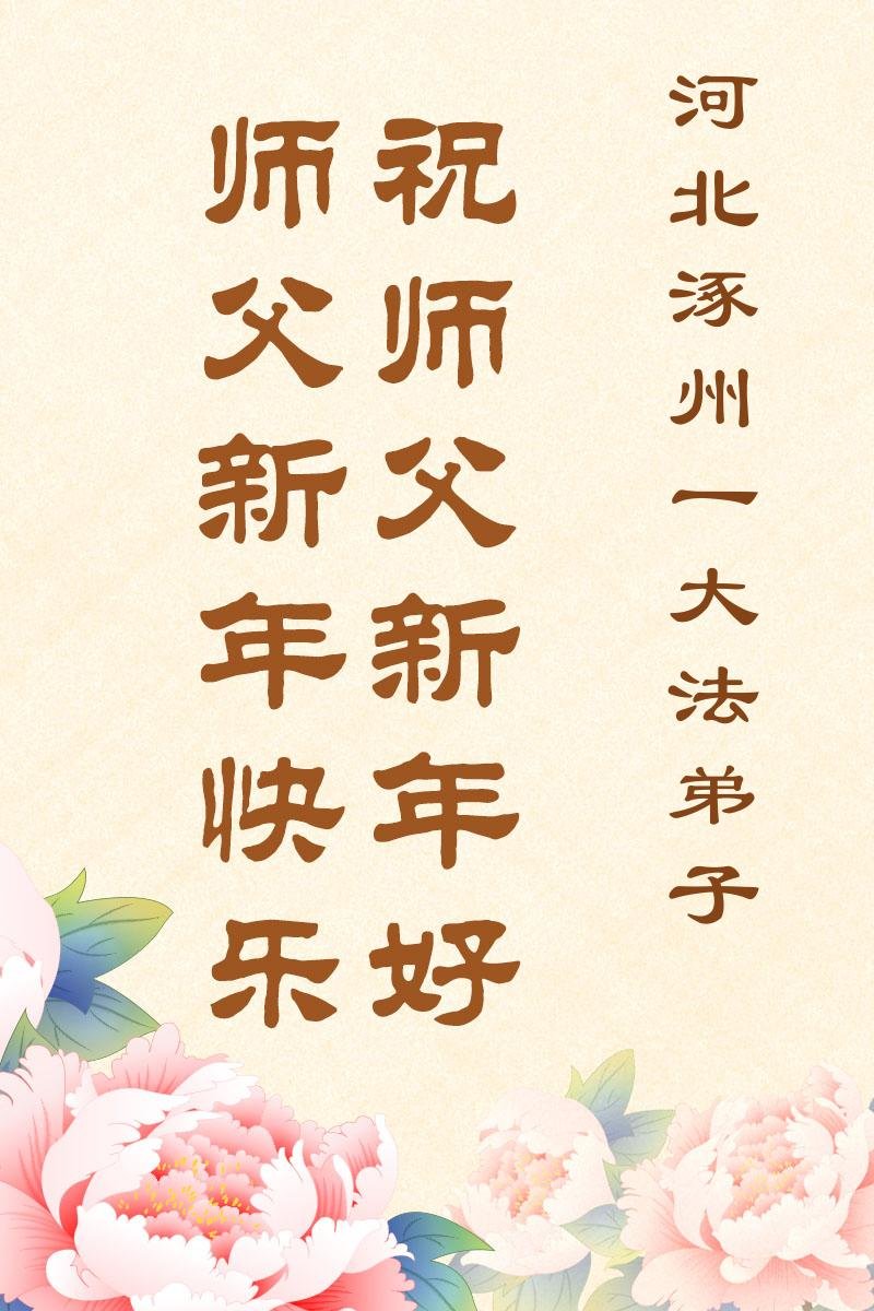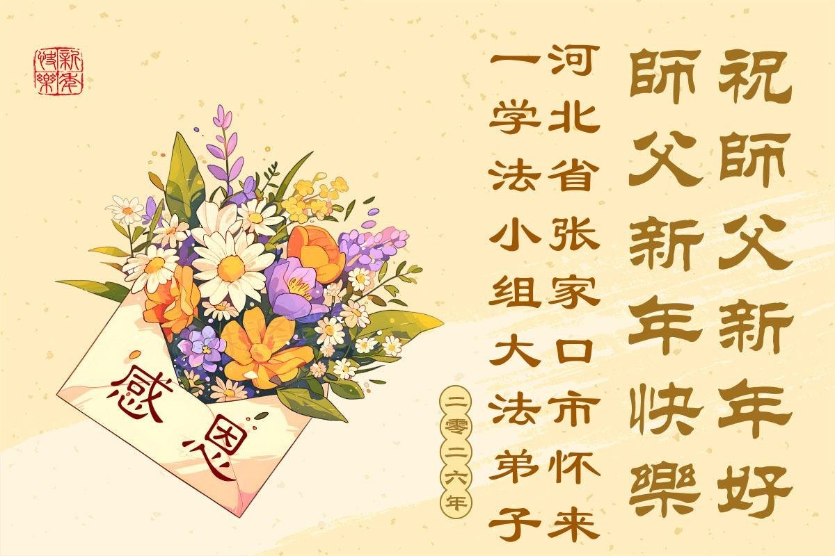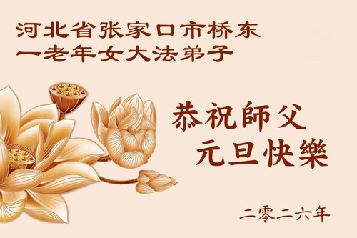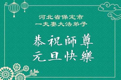 (Minghui.org) Zu Neujahr senden Falun-Dafa-Praktizierende auf der ganzen Welt traditionell Neujahrsgrüße, Grußkarten, Gedichte und Fotos an die Minghui-Website. Damit wünschen sie ihrem verehrten Meister Li Hongzhi ein frohes neues Jahr und bringen dem Meister ihre Dankbarkeit für die barmherzige Errettung zum Ausdruck. Sie geloben, in ihrer Kultivierung fleißig voranzukommen und noch mehr Lebewesen zu erretten. Im Folgenden veröffentlichen wir einen Teil dieser Grüße aus Hebei:
