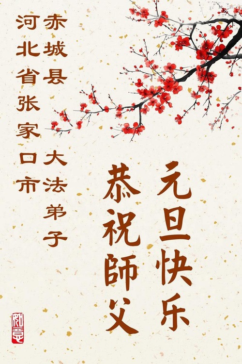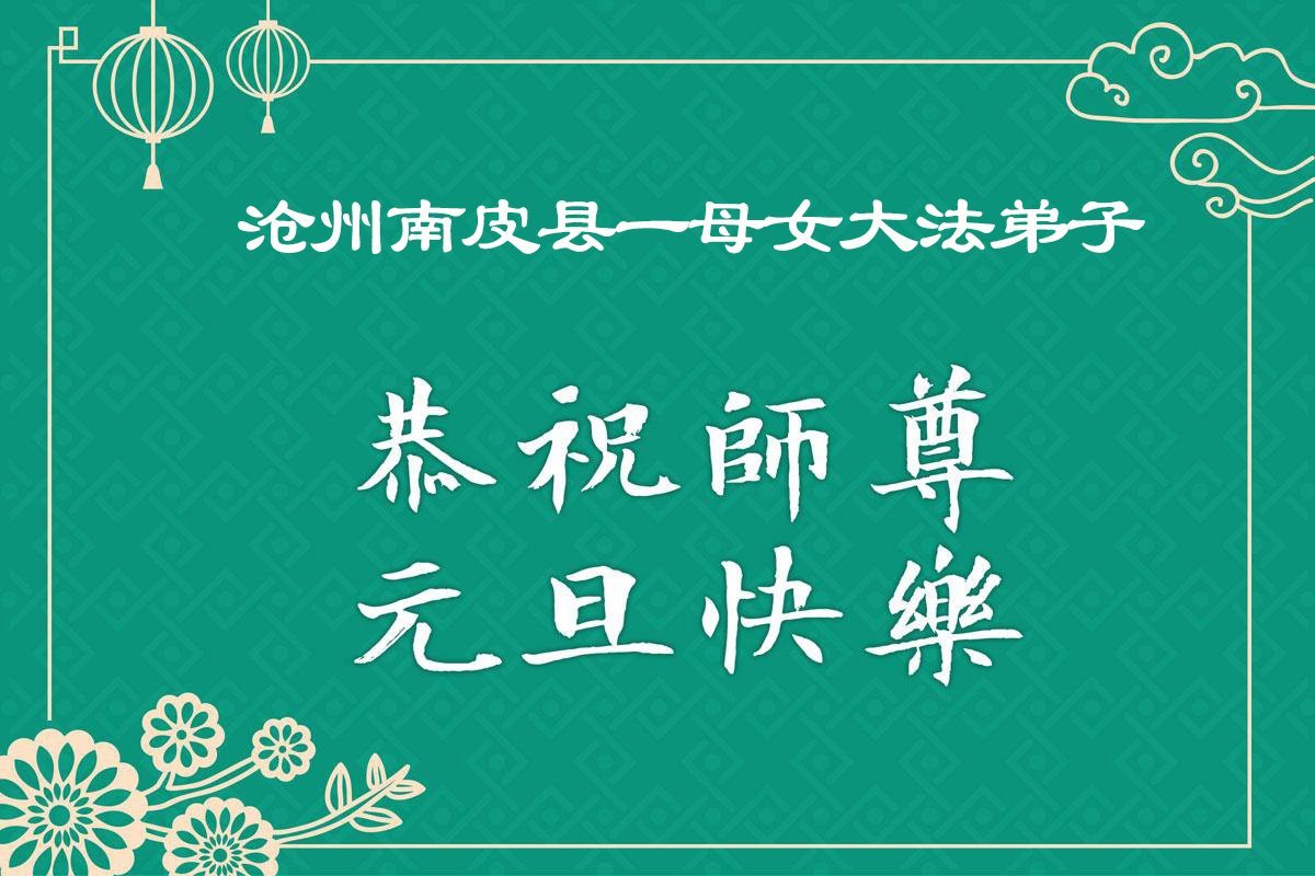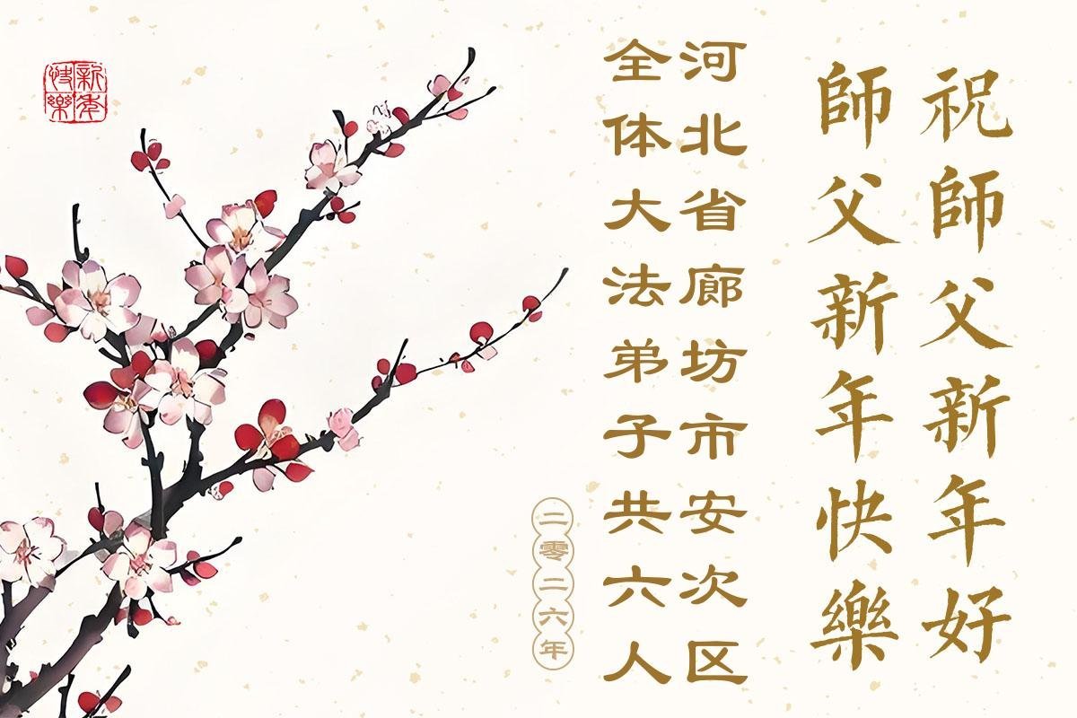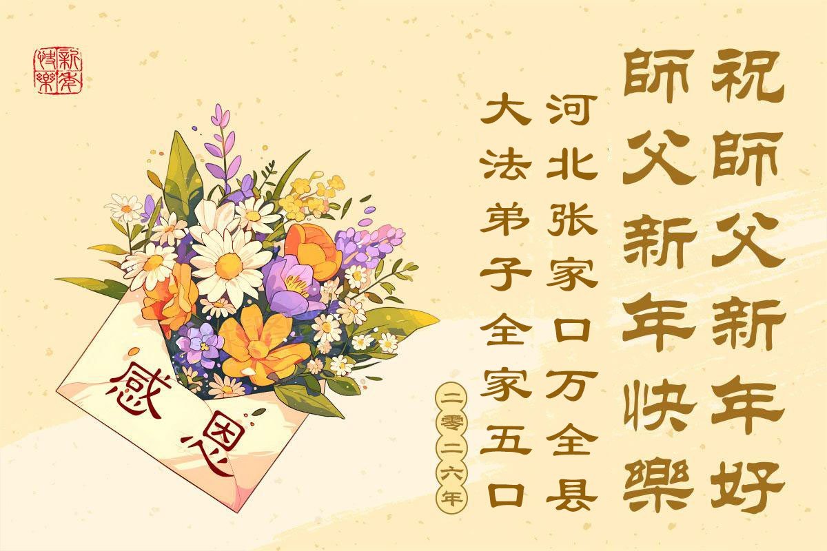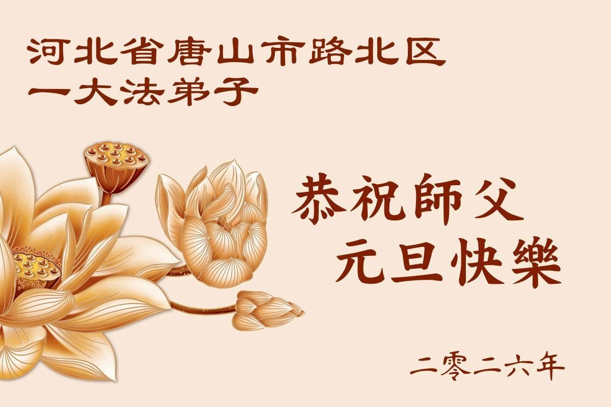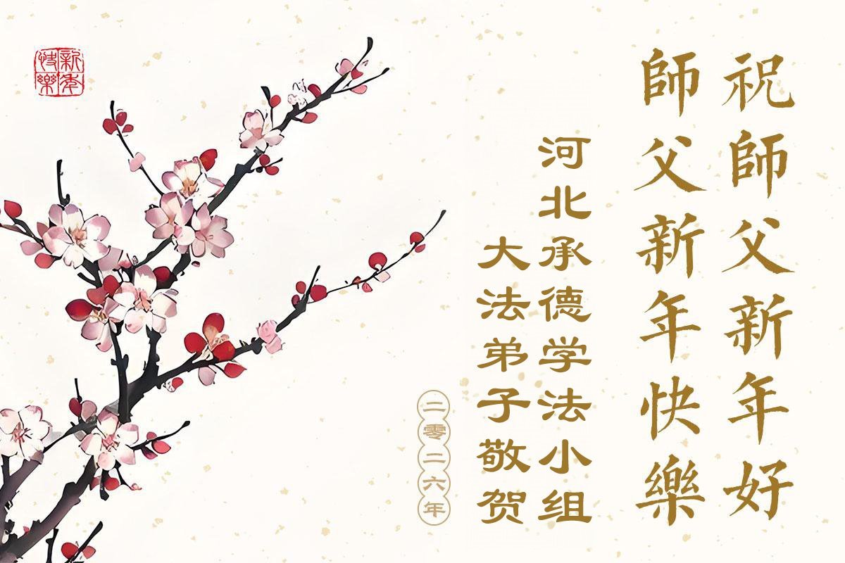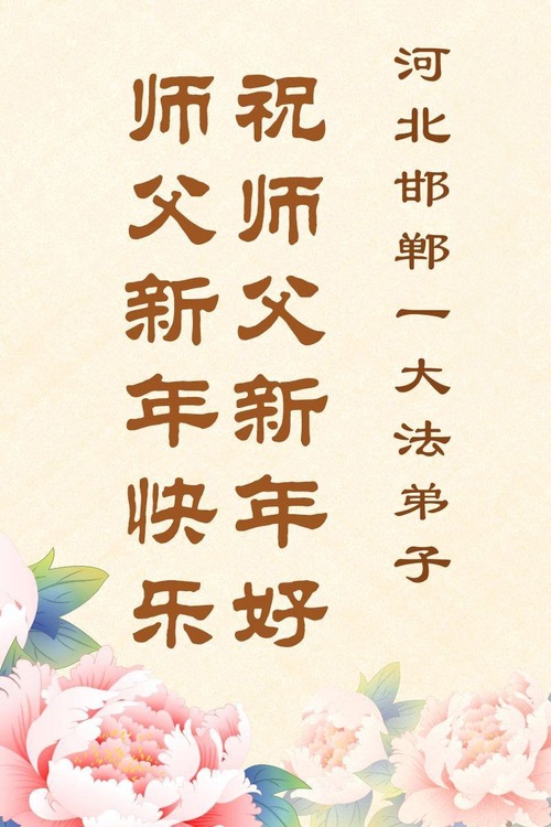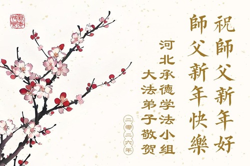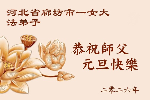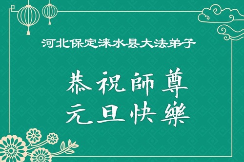 (Minghui.org) Zu Neujahr senden Falun-Dafa-Praktizierende auf der ganzen Welt traditionell Neujahrsgrüße, Grußkarten, Gedichte und Fotos an die Minghui-Website. Damit wünschen sie ihrem verehrten Meister Li Hongzhi ein frohes neues Jahr und bringen dem Meister ihre Dankbarkeit für die barmherzige Errettung zum Ausdruck. Sie geloben, in ihrer Kultivierung fleißig voranzukommen und noch mehr Lebewesen zu erretten. Im Folgenden veröffentlichen wir einen Teil dieser Grüße aus Hebei: