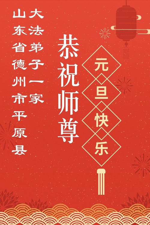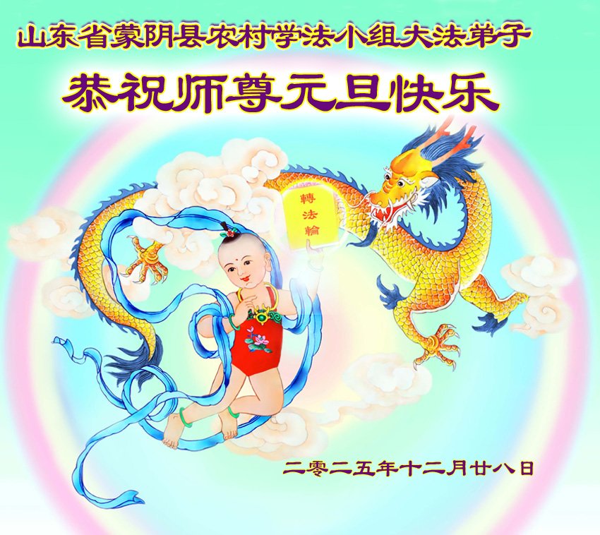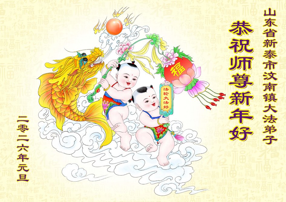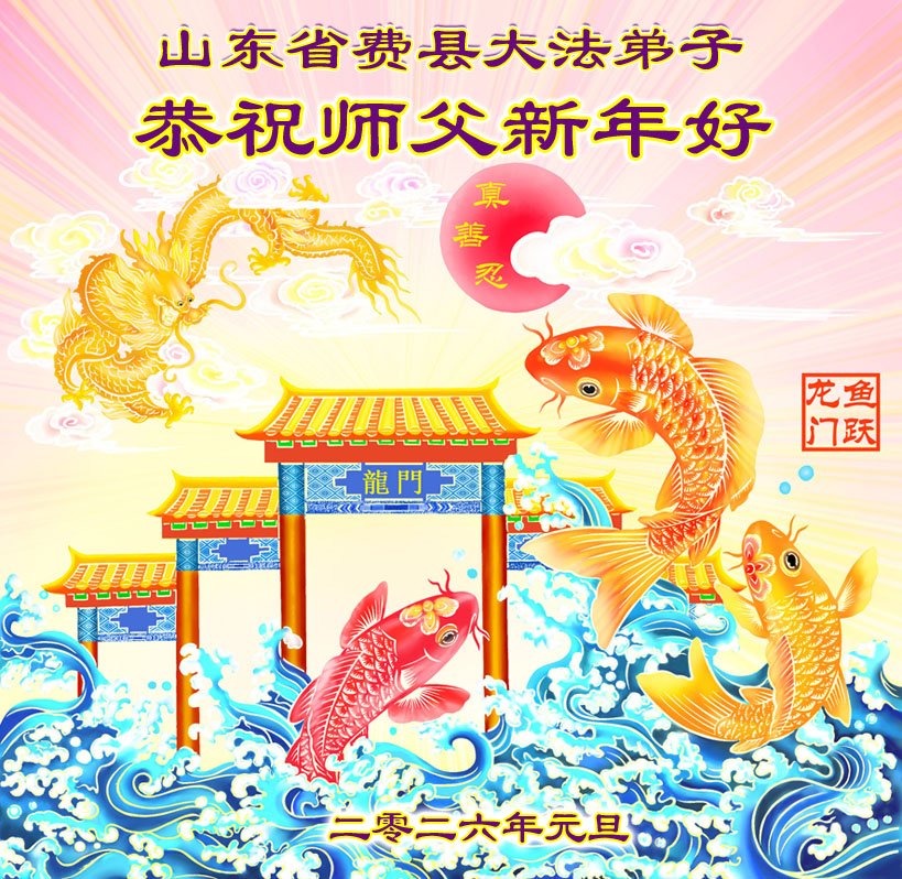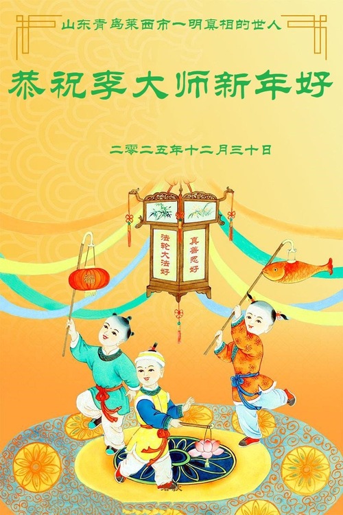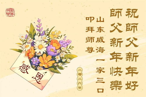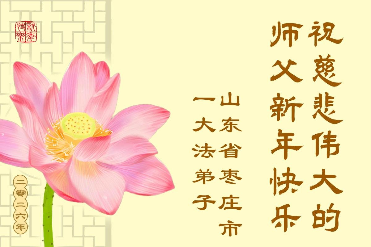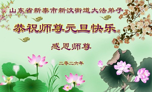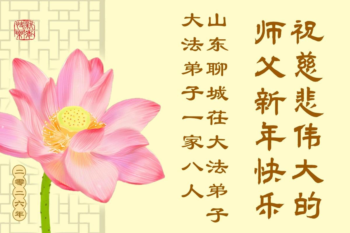 (Minghui.org) Zu Neujahr senden Falun-Dafa-Praktizierende auf der ganzen Welt traditionell Neujahrsgrüße, Grußkarten, Gedichte und Fotos an die Minghui-Website. Damit wünschen sie ihrem verehrten Meister Li Hongzhi ein frohes neues Jahr und bringen dem Meister ihre Dankbarkeit für die barmherzige Errettung zum Ausdruck. Sie geloben, in ihrer Kultivierung fleißig voranzukommen und noch mehr Lebewesen zu erretten. Im Folgenden veröffentlichen wir einen Teil dieser Grüße aus Shandong: