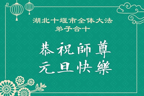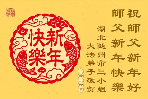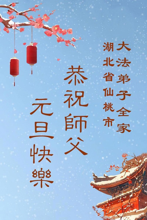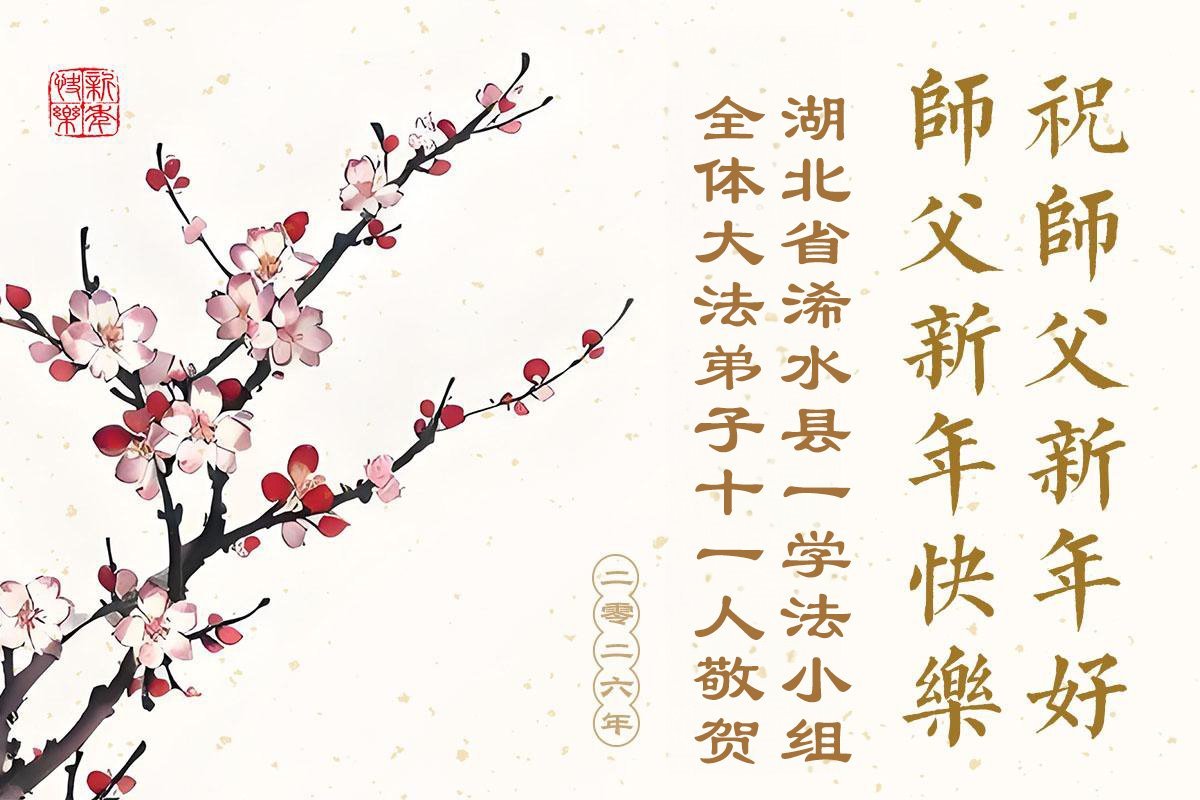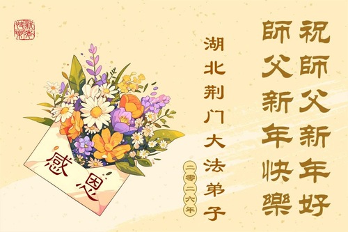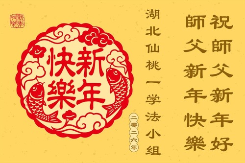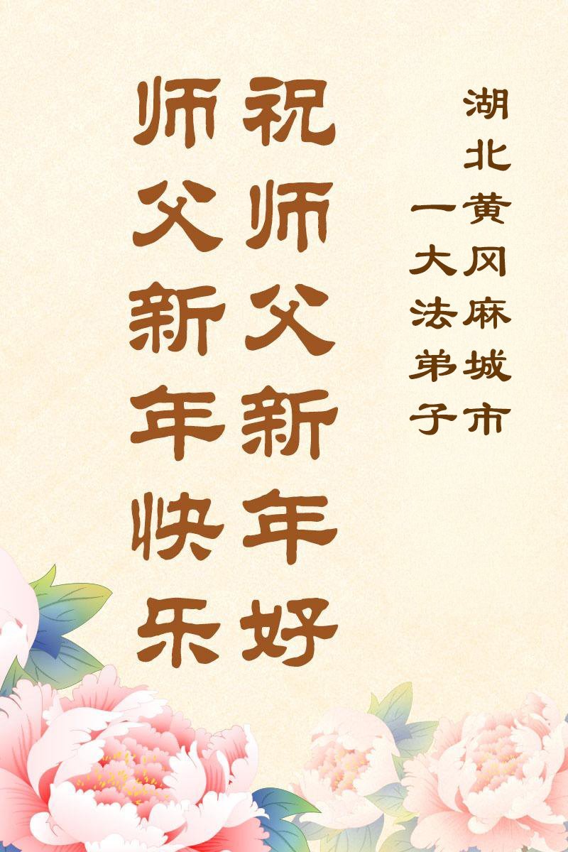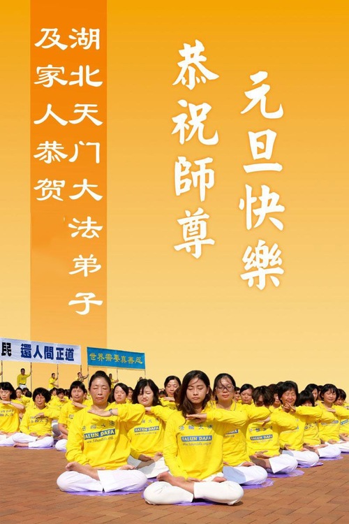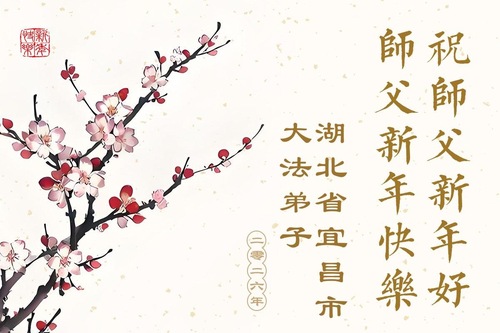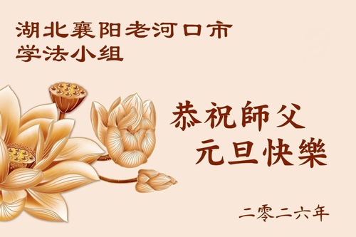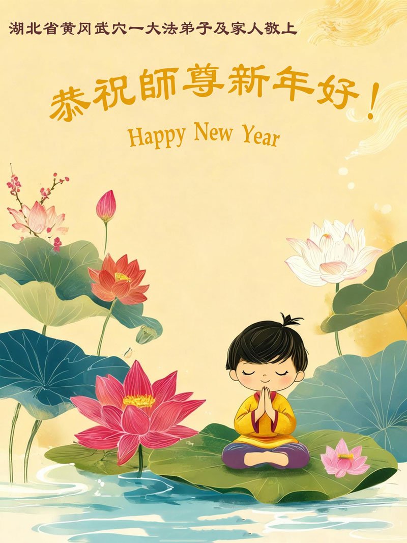 (Minghui.org) Zu Neujahr senden Falun-Dafa-Praktizierende auf der ganzen Welt traditionell Neujahrsgrüße, Grußkarten, Gedichte und Fotos an die Minghui-Website. Damit wünschen sie ihrem verehrten Meister Li Hongzhi ein frohes neues Jahr und bringen dem Meister ihre Dankbarkeit für die barmherzige Errettung zum Ausdruck. Sie geloben, in ihrer Kultivierung fleißig voranzukommen und noch mehr Lebewesen zu erretten. Im Folgenden veröffentlichen wir einen Teil dieser Grüße aus der Provinz Hubei:
