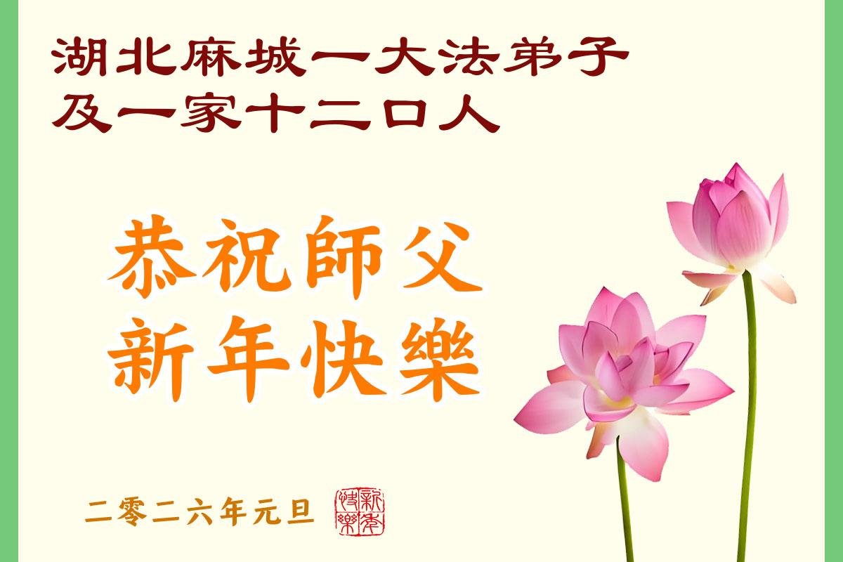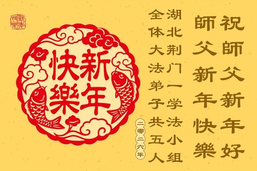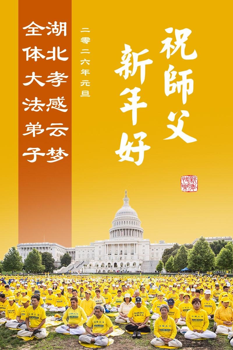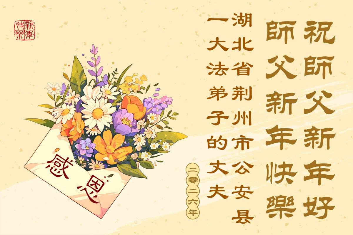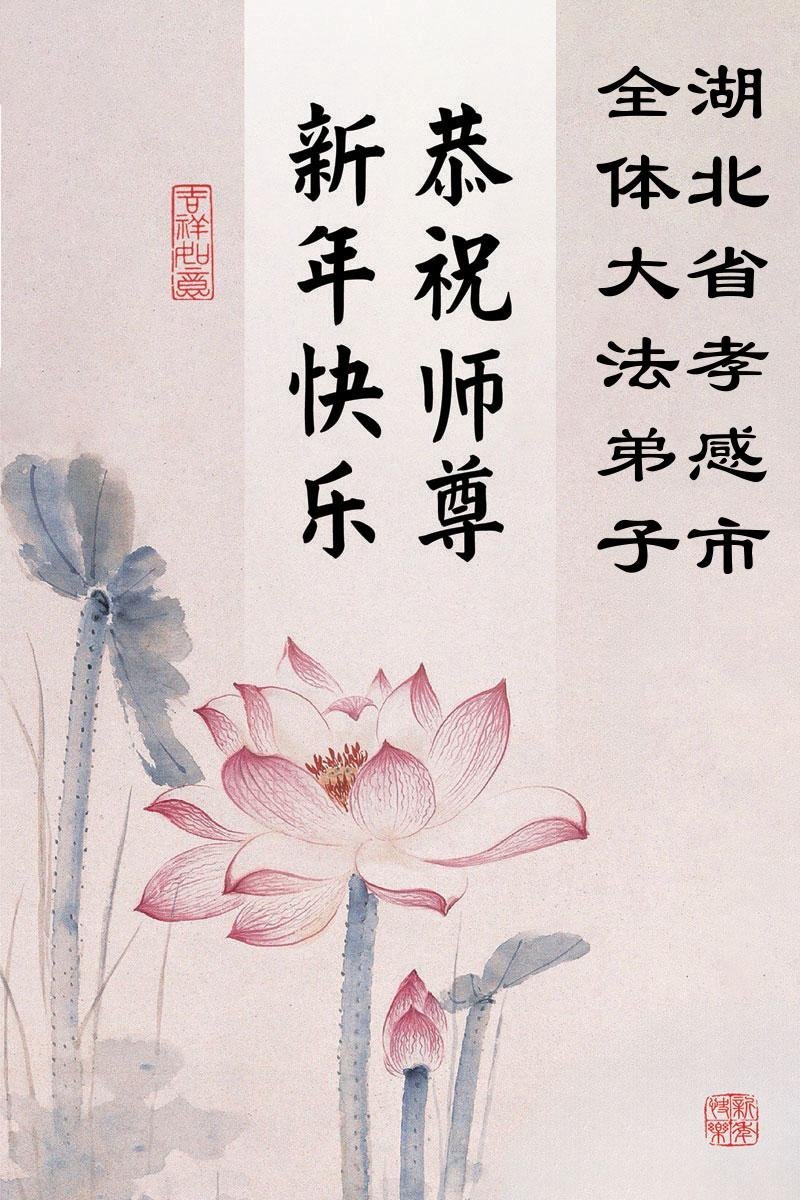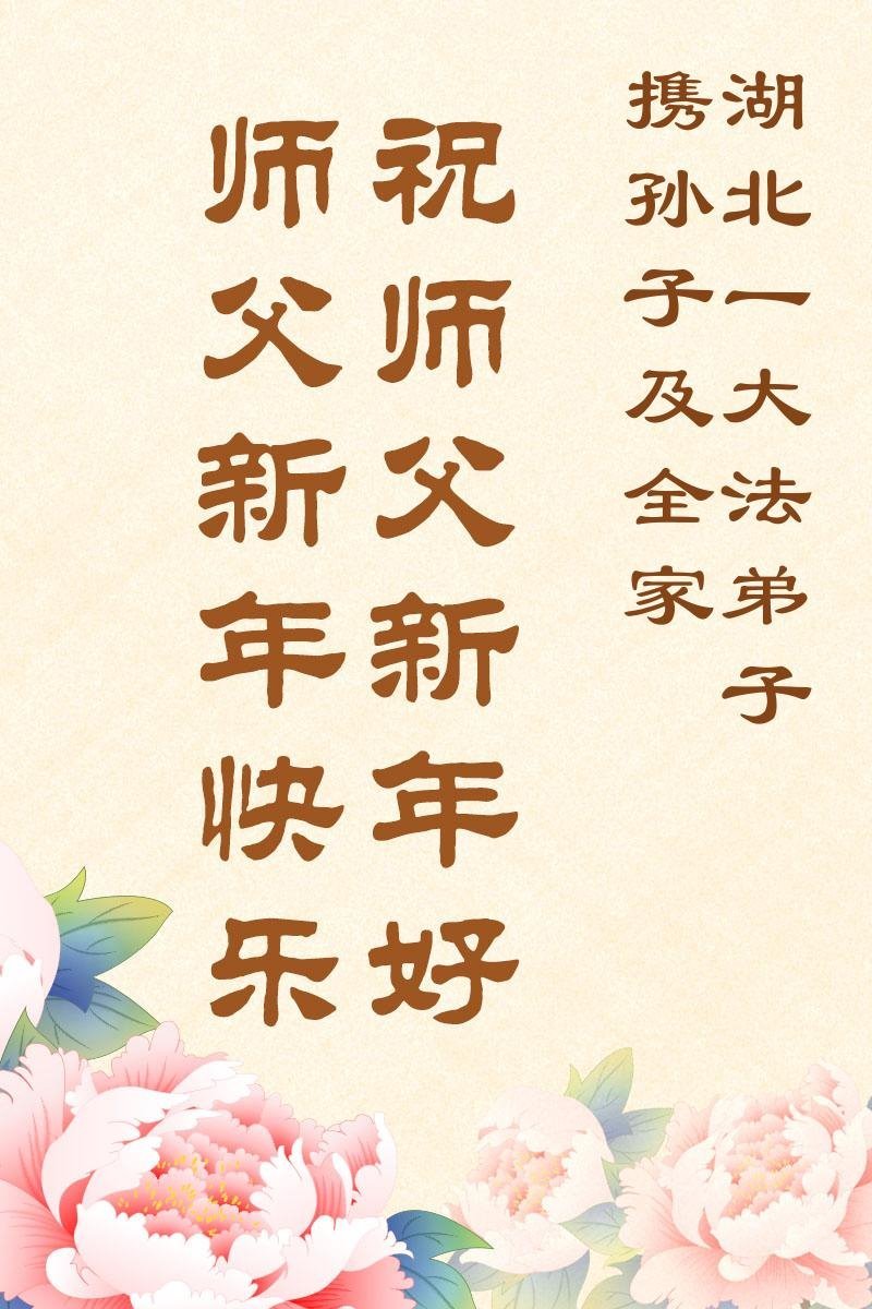 (Minghui.org) Zu Neujahr senden Falun-Dafa-Praktizierende auf der ganzen Welt traditionell Neujahrsgrüße, Grußkarten, Gedichte und Fotos an die Minghui-Website. Damit wünschen sie ihrem verehrten Meister Li Hongzhi ein frohes neues Jahr und bringen dem Meister ihre Dankbarkeit für die barmherzige Errettung zum Ausdruck. Sie geloben, in ihrer Kultivierung fleißig voranzukommen und noch mehr Lebewesen zu erretten. Im Folgenden veröffentlichen wir einen Teil dieser Grüße aus der Provinz Hubei: