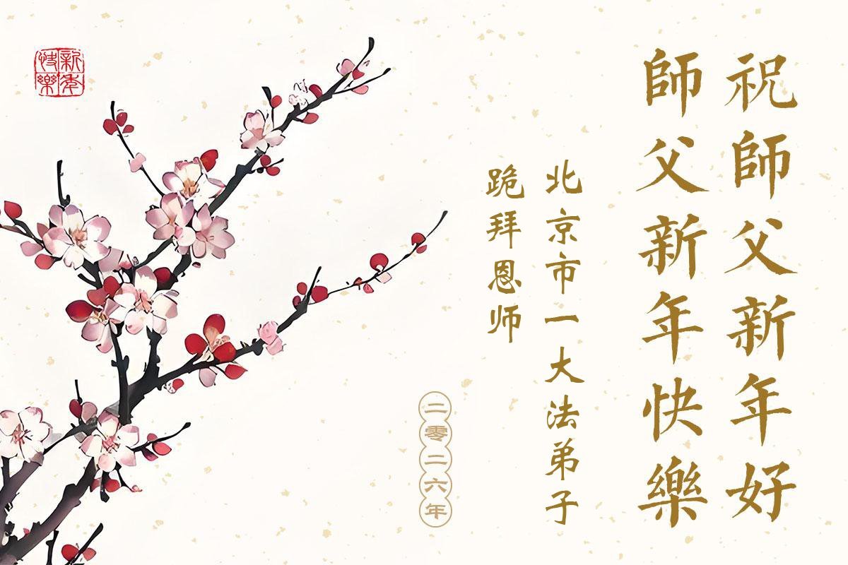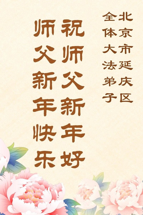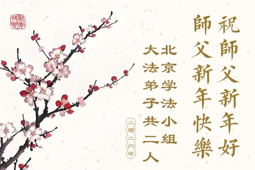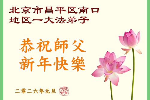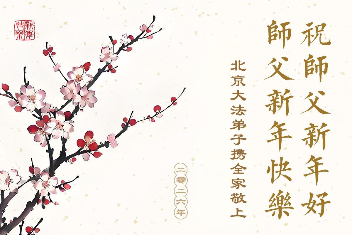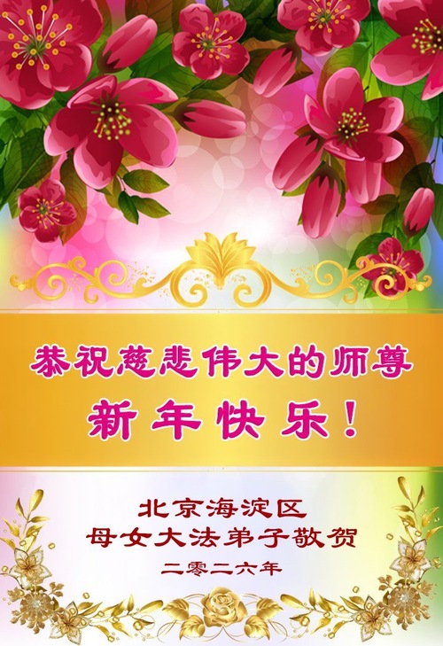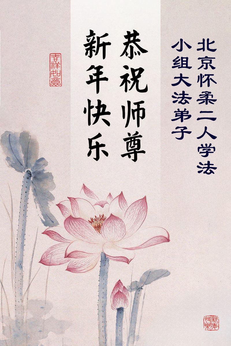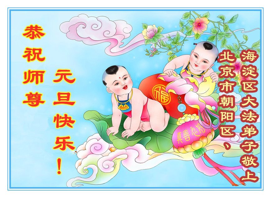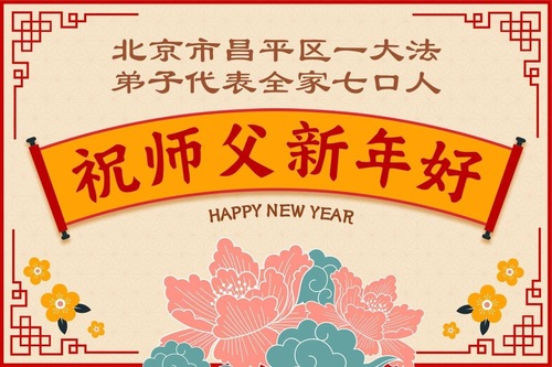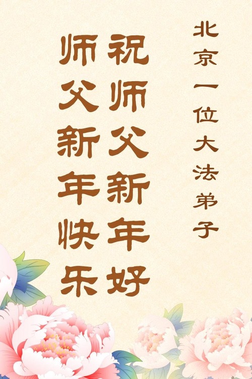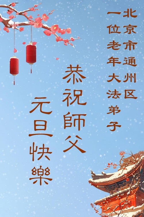 (Minghui.org) Zu Neujahr senden Falun-Dafa-Praktizierende auf der ganzen Welt traditionell Neujahrsgrüße, Grußkarten, Gedichte und Fotos an die Minghui-Website. Damit wünschen sie ihrem verehrten Meister Li Hongzhi ein frohes neues Jahr und bringen dem Meister ihre Dankbarkeit für die barmherzige Errettung zum Ausdruck. Sie geloben, in ihrer Kultivierung fleißig voranzukommen und noch mehr Lebewesen zu erretten. Im Folgenden veröffentlichen wir einen Teil dieser Grüße aus Peking: