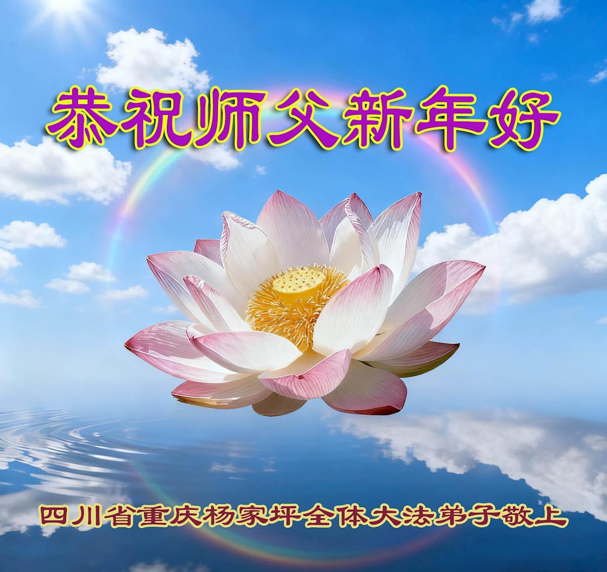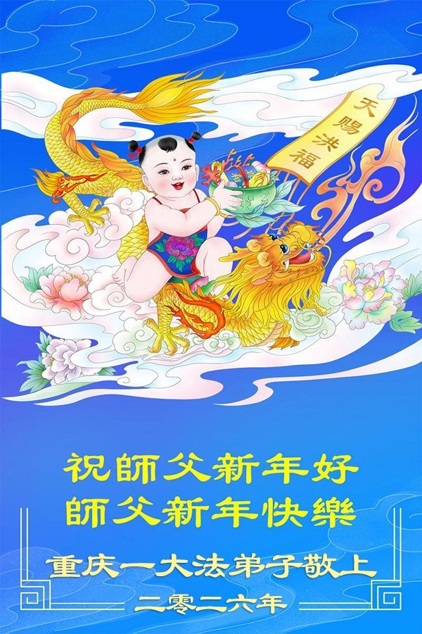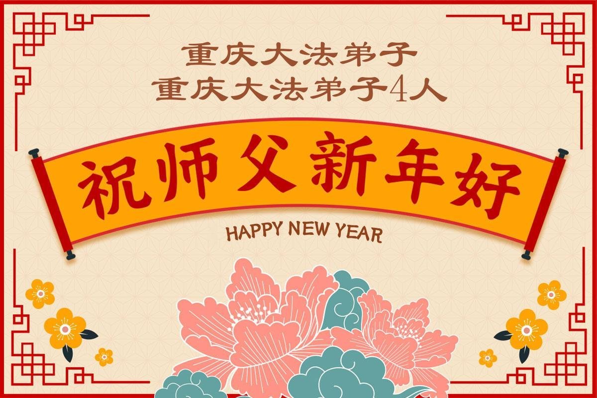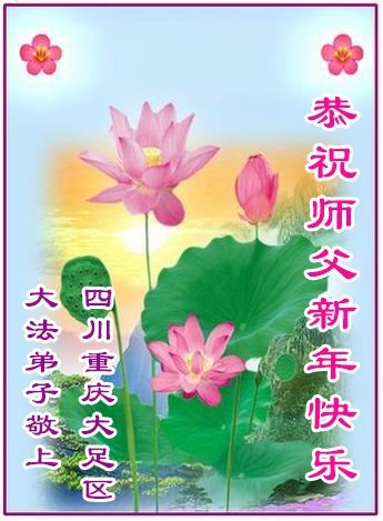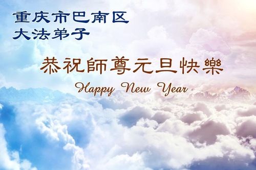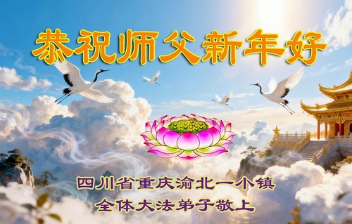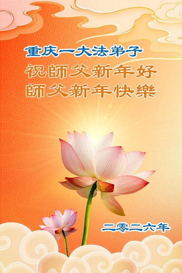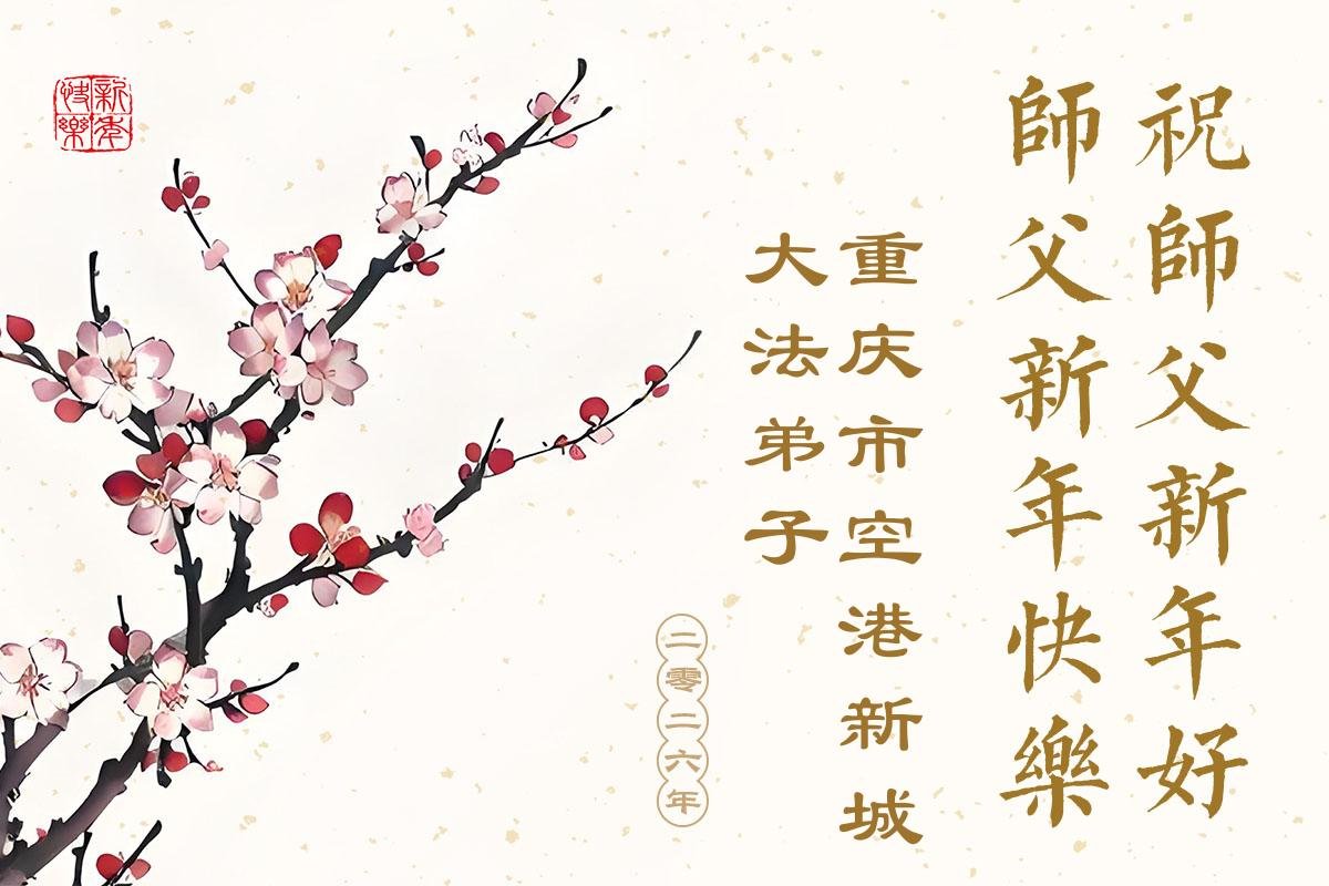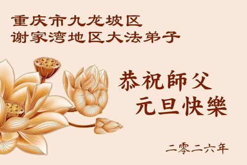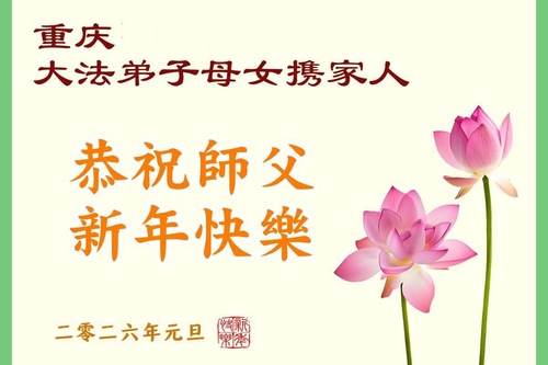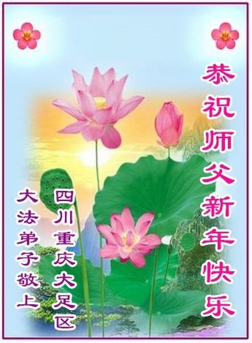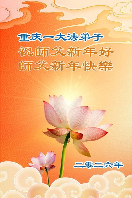 (Minghui.org) Zu Neujahr senden Falun-Dafa-Praktizierende auf der ganzen Welt traditionell Neujahrsgrüße, Grußkarten, Gedichte und Fotos an die Minghui-Website. Damit wünschen sie ihrem verehrten Meister Li Hongzhi ein frohes neues Jahr und bringen dem Meister ihre Dankbarkeit für die barmherzige Errettung zum Ausdruck. Sie geloben, in ihrer Kultivierung fleißig voranzukommen und noch mehr Lebewesen zu erretten. Im Folgenden veröffentlichen wir einen Teil dieser Grüße aus der Stadt Chongqing: