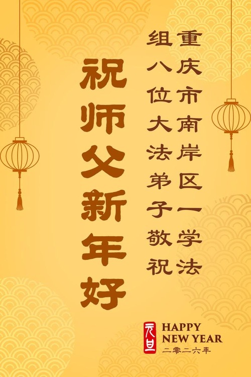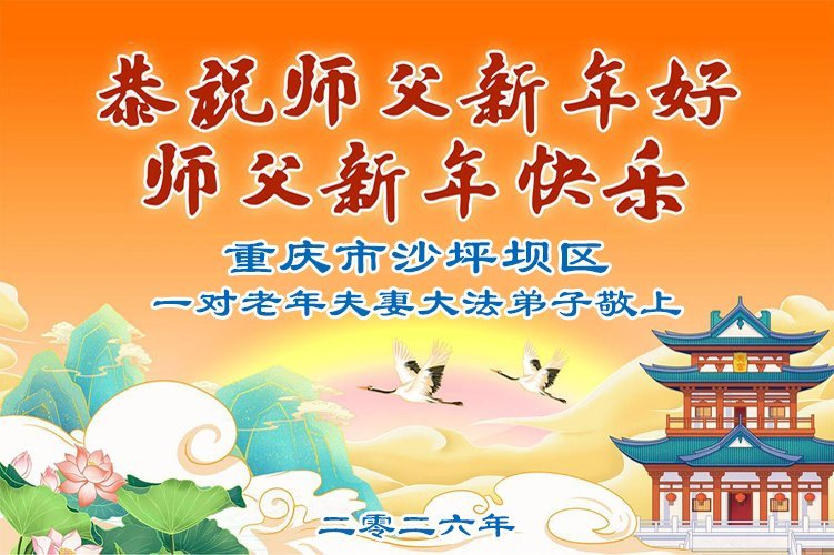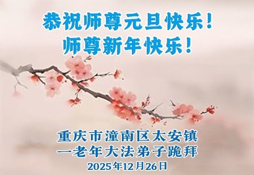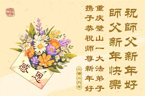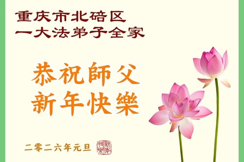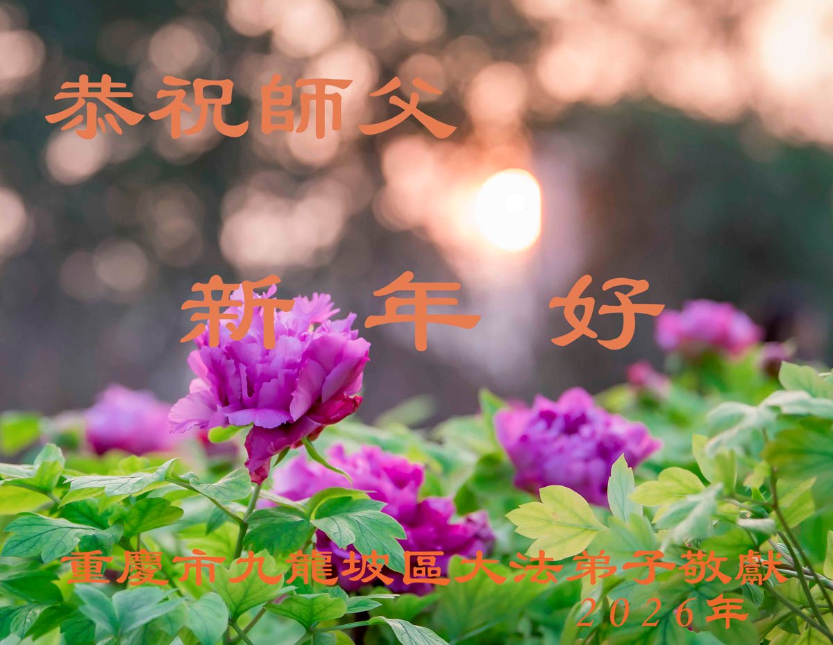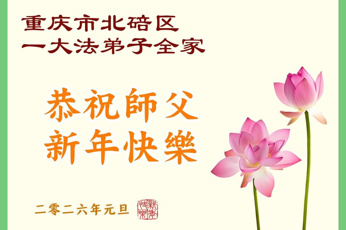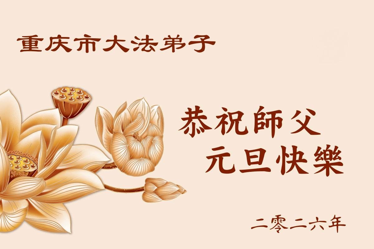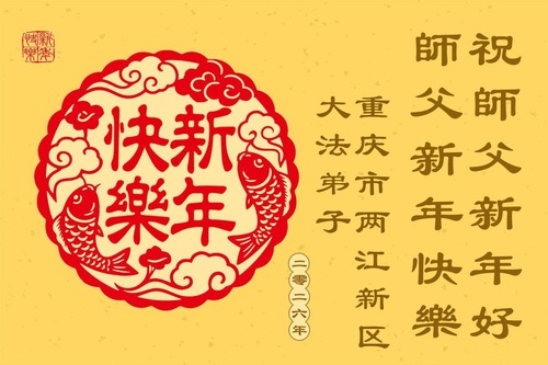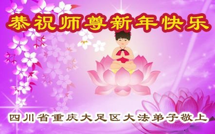 (Minghui.org) Zu Neujahr senden Falun-Dafa-Praktizierende auf der ganzen Welt traditionell Neujahrsgrüße, Grußkarten, Gedichte und Fotos an die Minghui-Website. Damit wünschen sie ihrem verehrten Meister Li Hongzhi ein frohes neues Jahr und bringen dem Meister ihre Dankbarkeit für die barmherzige Errettung zum Ausdruck. Sie geloben, in ihrer Kultivierung fleißig voranzukommen und noch mehr Lebewesen zu erretten. Im Folgenden veröffentlichen wir einen Teil dieser Grüße aus der Stadt Chongqing: