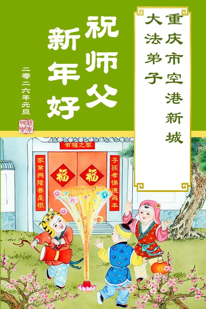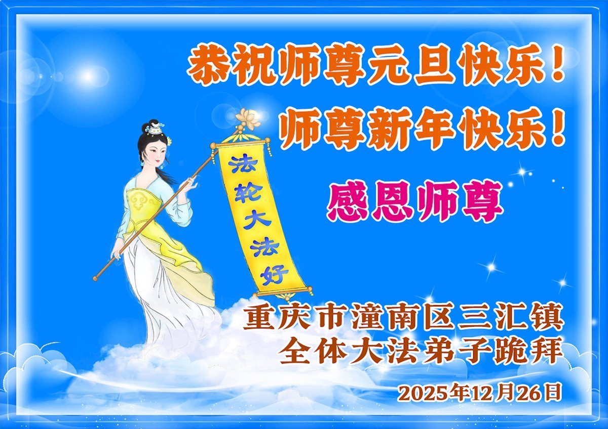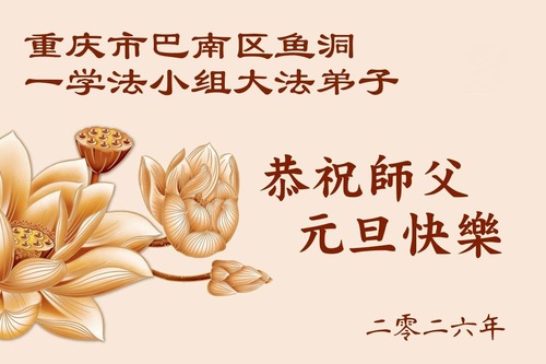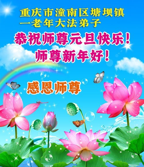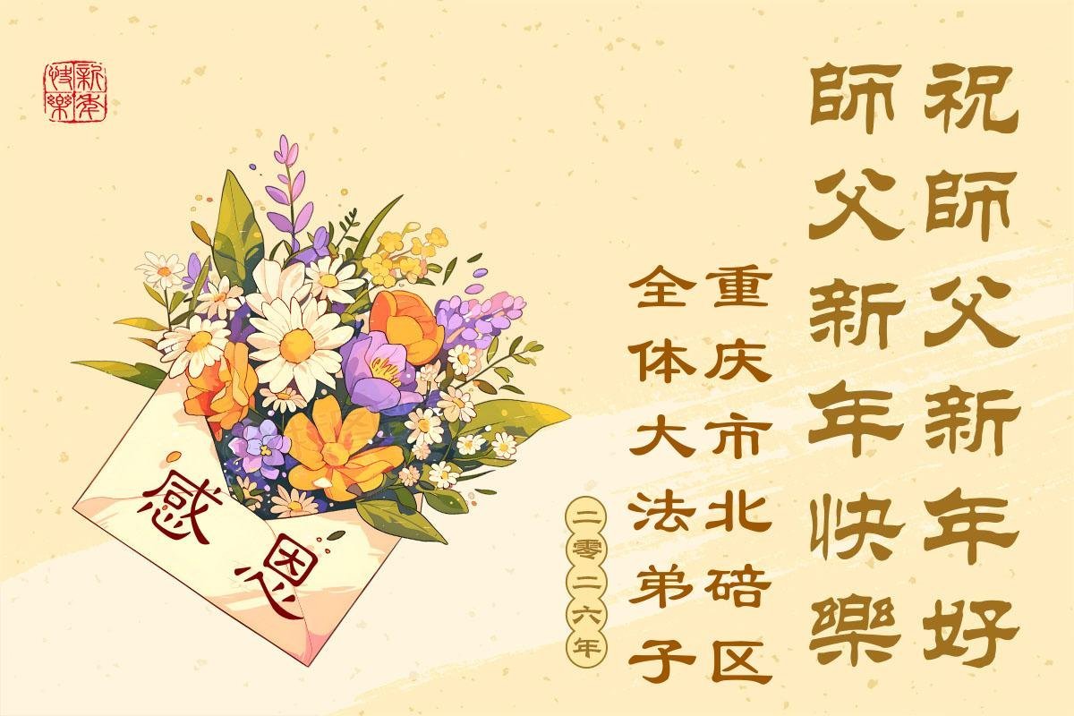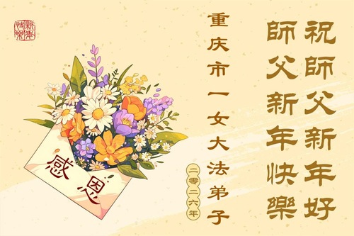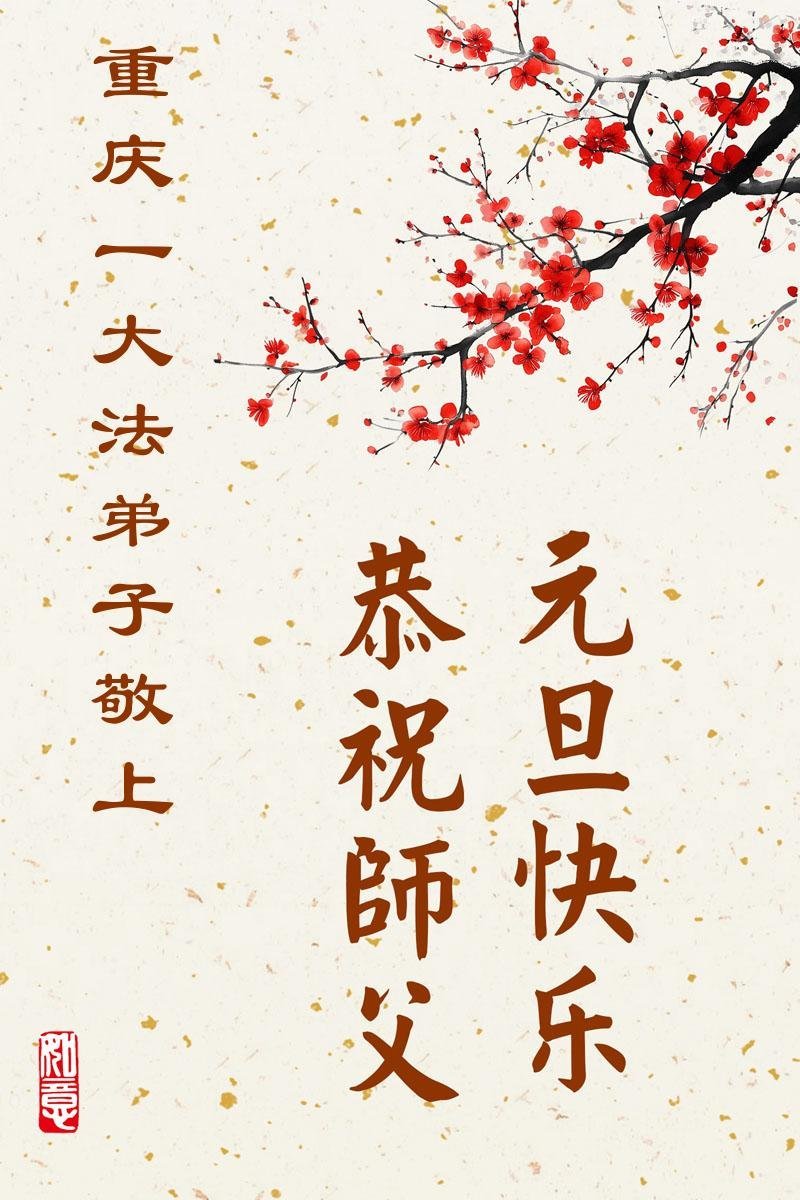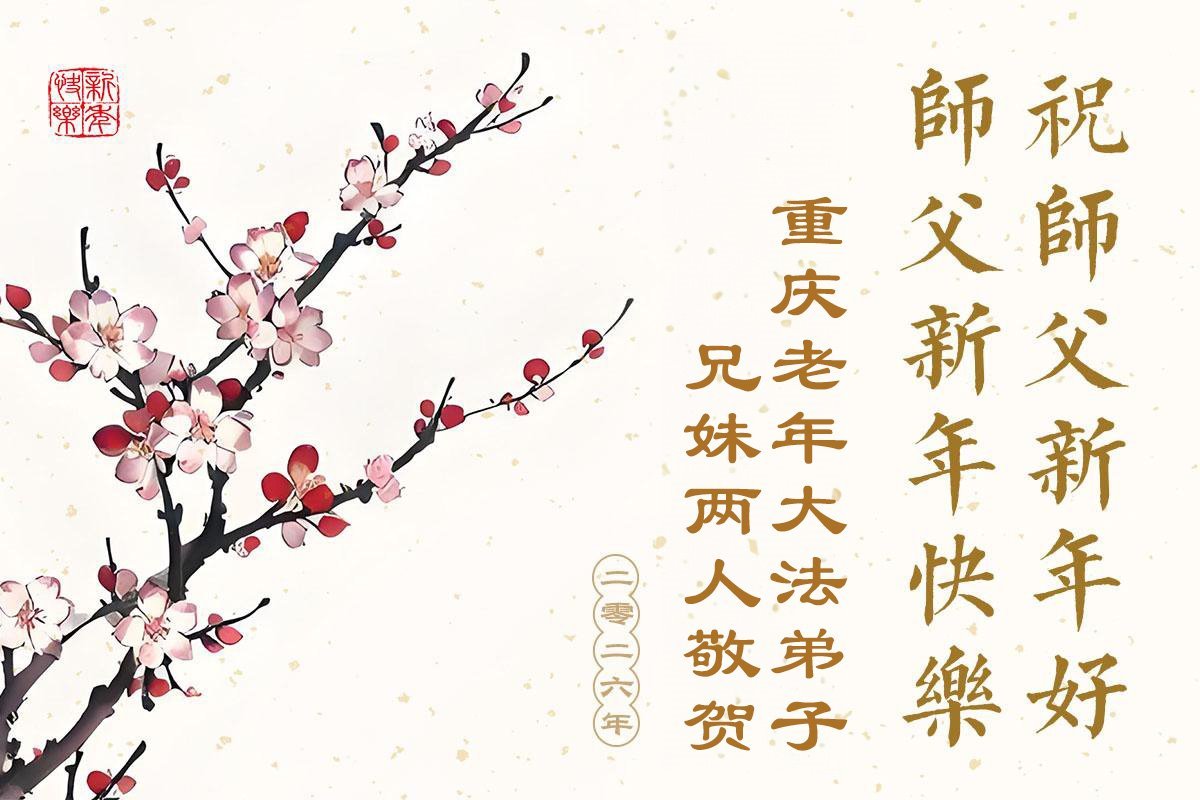 (Minghui.org) Zu Neujahr senden Falun-Dafa-Praktizierende auf der ganzen Welt traditionell Neujahrsgrüße, Grußkarten, Gedichte und Fotos an die Minghui-Website. Damit wünschen sie ihrem verehrten Meister Li Hongzhi ein frohes neues Jahr und bringen dem Meister ihre Dankbarkeit für die barmherzige Errettung zum Ausdruck. Sie geloben, in ihrer Kultivierung fleißig voranzukommen und noch mehr Lebewesen zu erretten. Im Folgenden veröffentlichen wir einen Teil dieser Grüße aus der Stadt Chongqing: