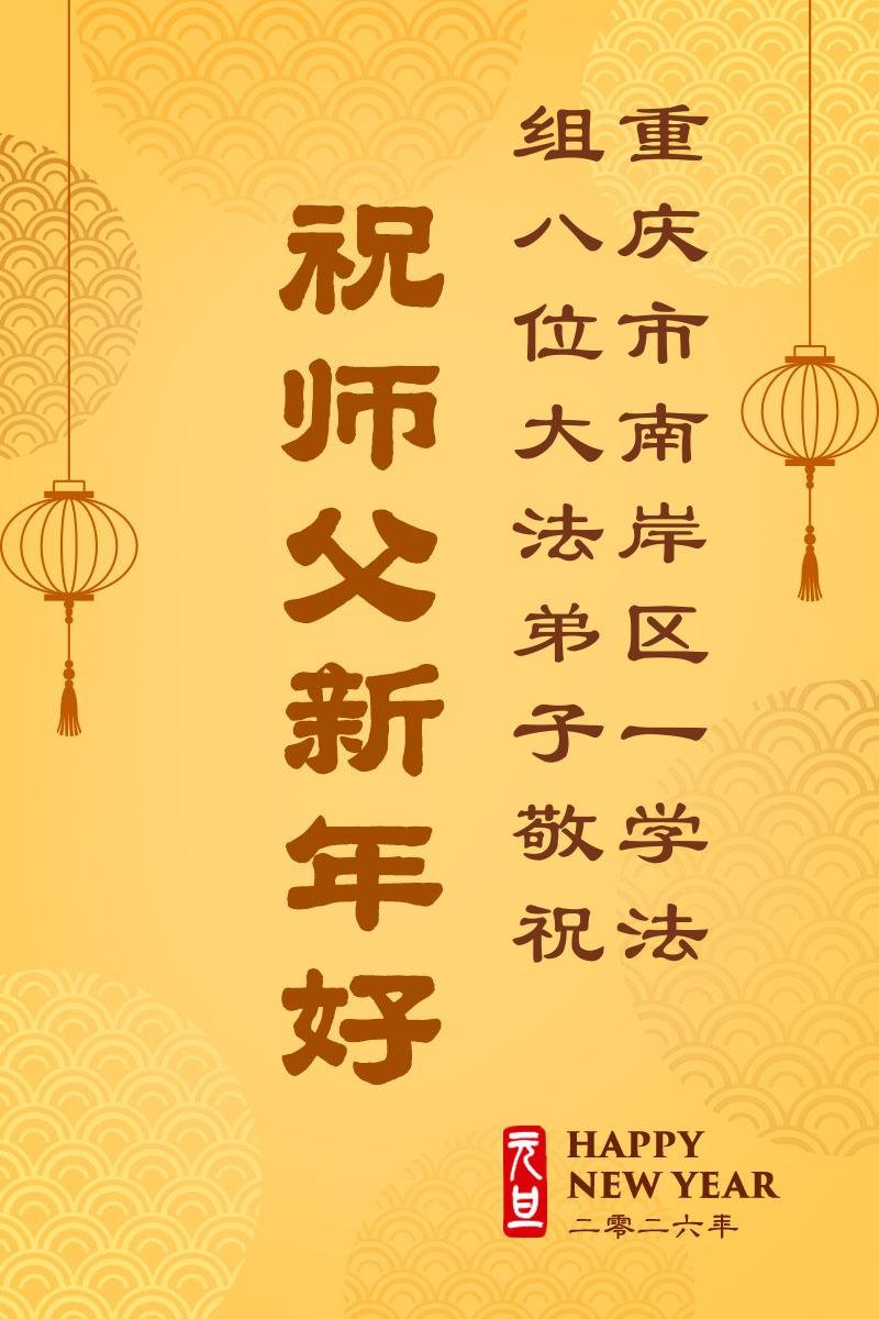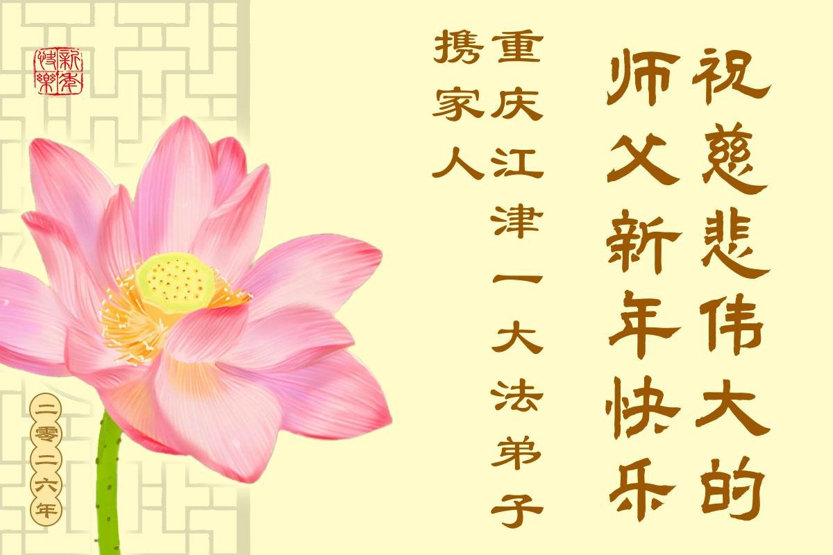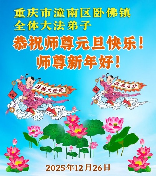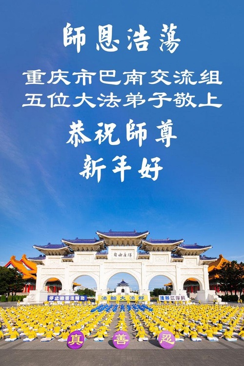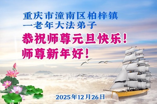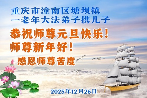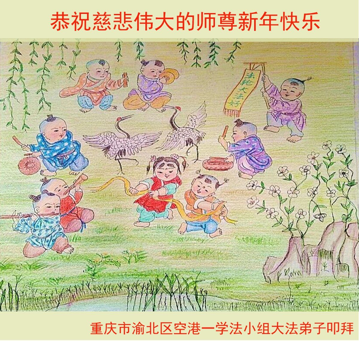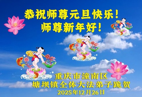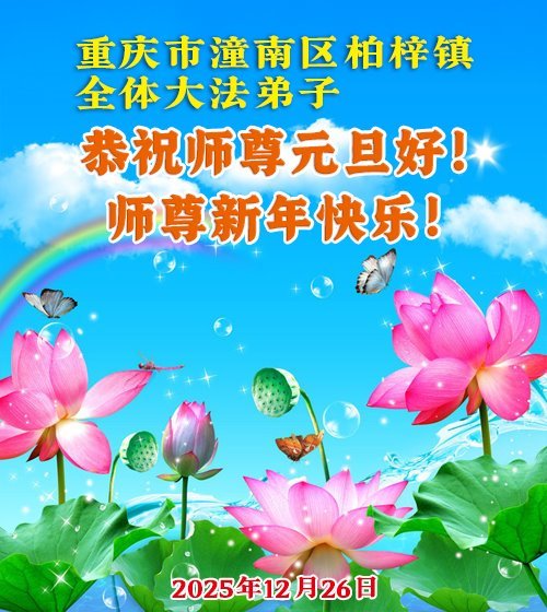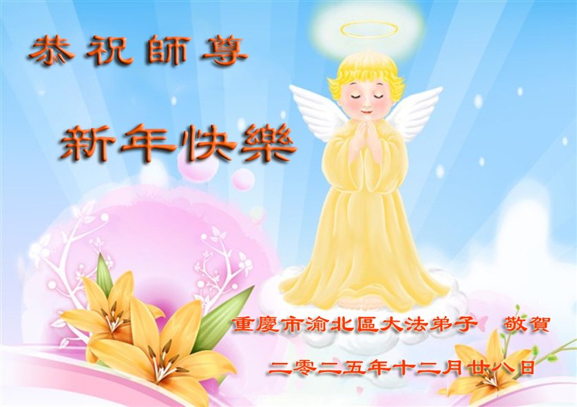 (Minghui.org) Zu Neujahr senden Falun-Dafa-Praktizierende auf der ganzen Welt traditionell Neujahrsgrüße, Grußkarten, Gedichte und Fotos an die Minghui-Website. Damit wünschen sie ihrem verehrten Meister Li Hongzhi ein frohes neues Jahr und bringen dem Meister ihre Dankbarkeit für die barmherzige Errettung zum Ausdruck. Sie geloben, in ihrer Kultivierung fleißig voranzukommen und noch mehr Lebewesen zu erretten. Im Folgenden veröffentlichen wir einen Teil dieser Grüße aus der Stadt Chongqing:
